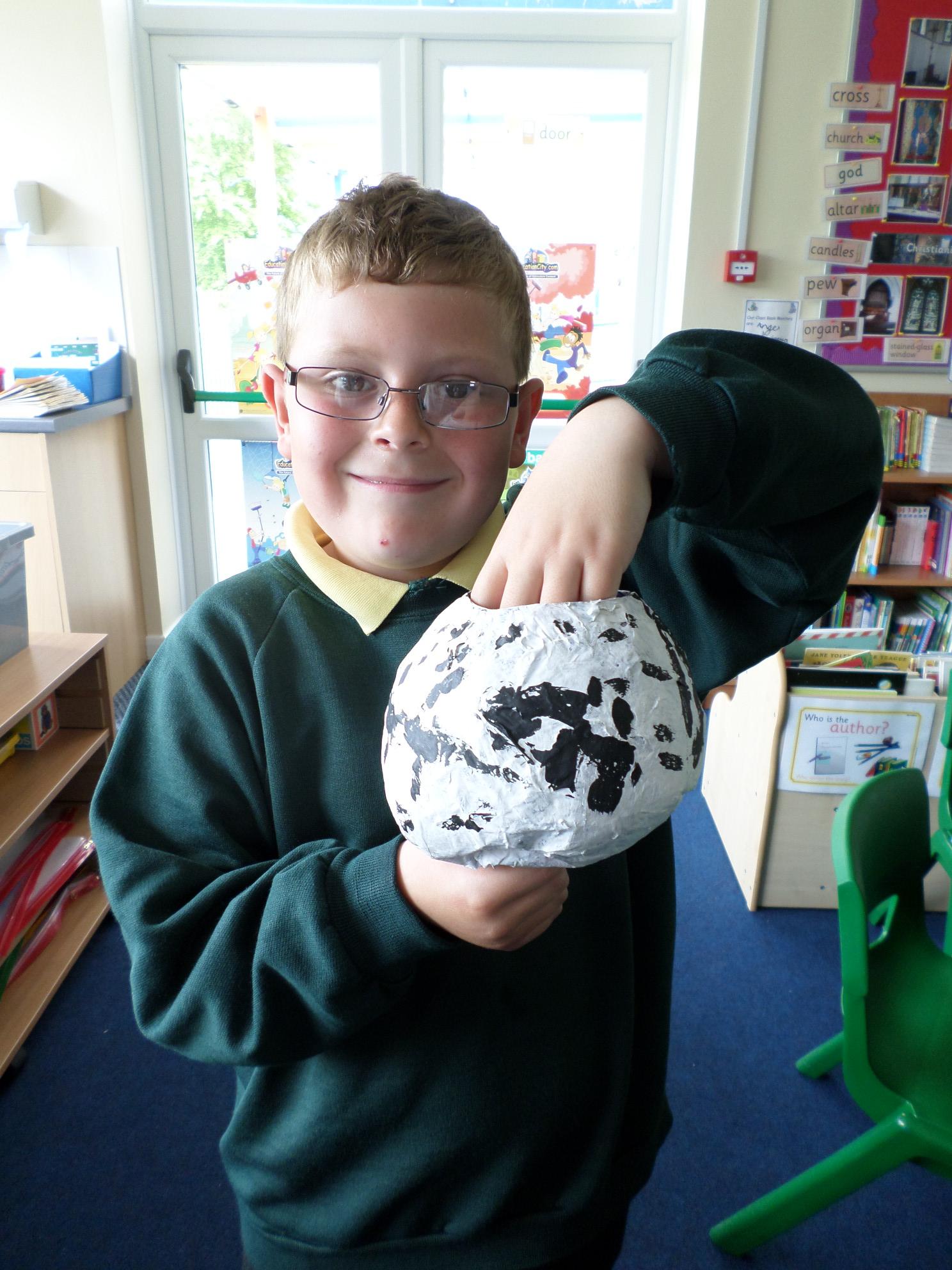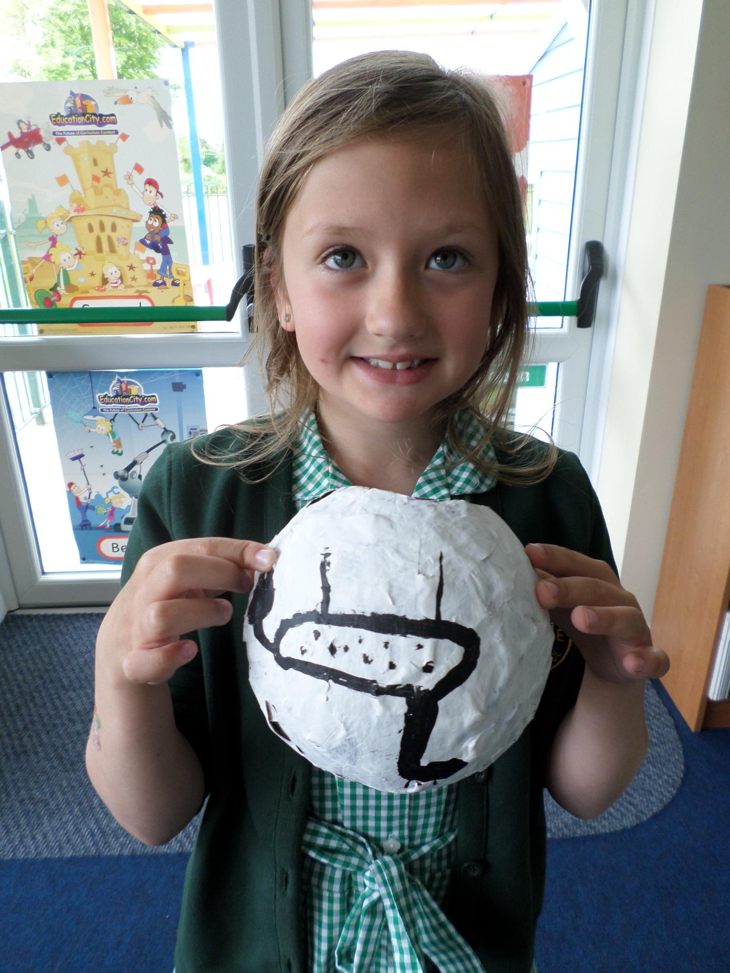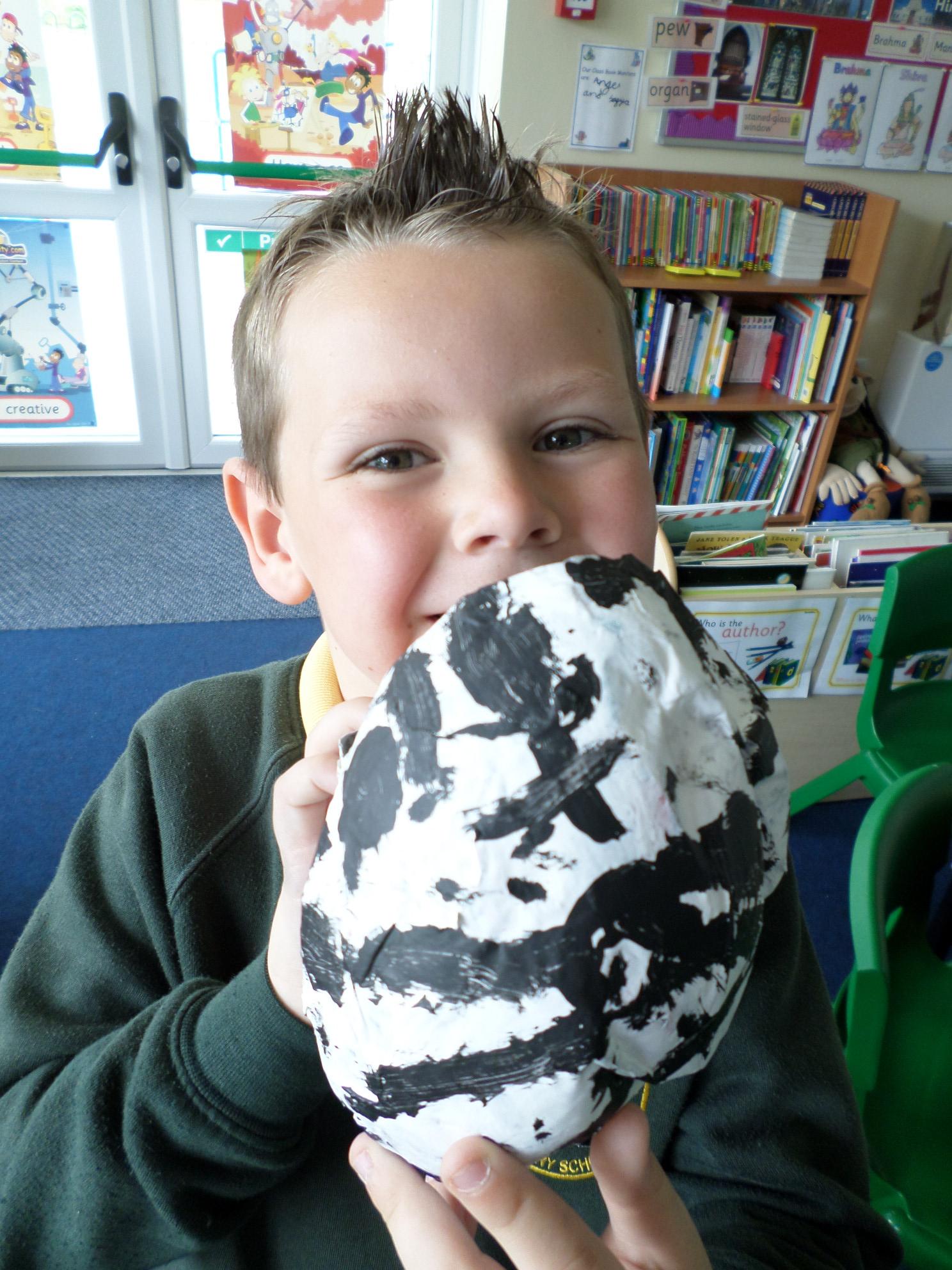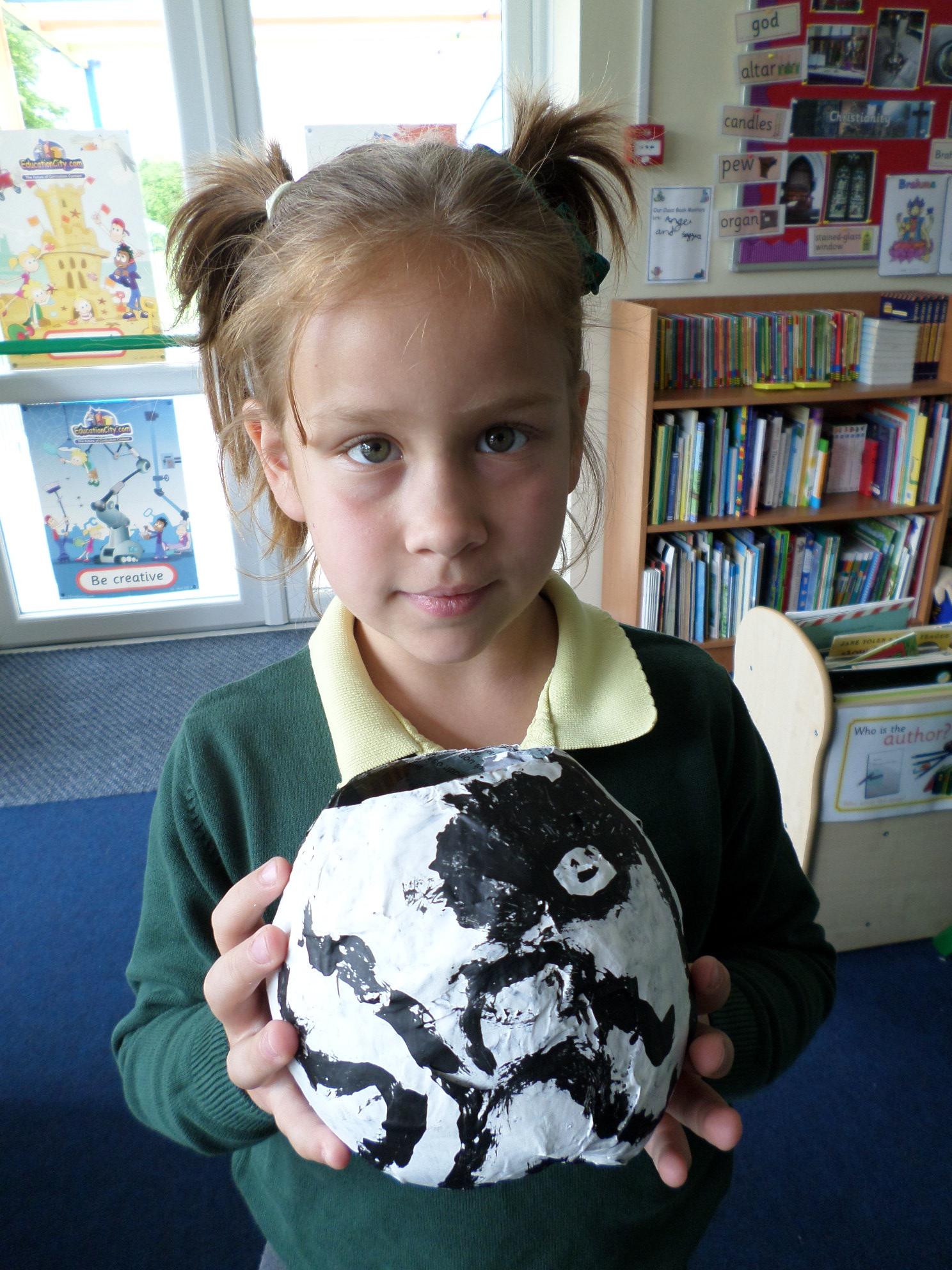 We have been looking at African art and also at the way ostrich eggs are used as water bottles. We made our own papier mache eggs and decorated them to resemble the ostrich egg water carriers. We had great fun and got very sticky. When we popped the balloons, some of our carriers wrinkled a bit but we still managed to decorate them and we think they look great. Have a look at the photos below. If you want to see more of our African art work check out the class Art and Design sub page to see our colourful African collars.