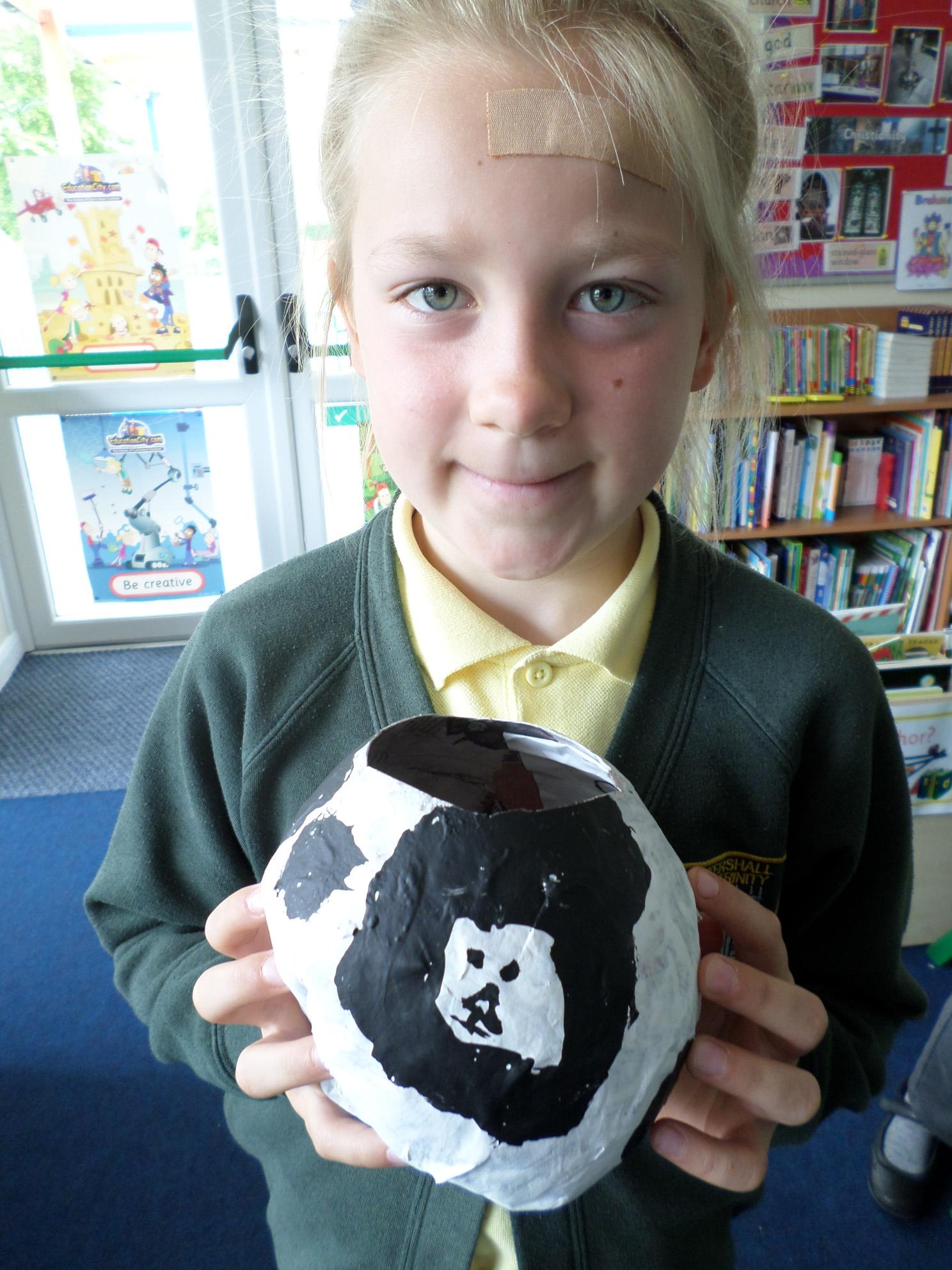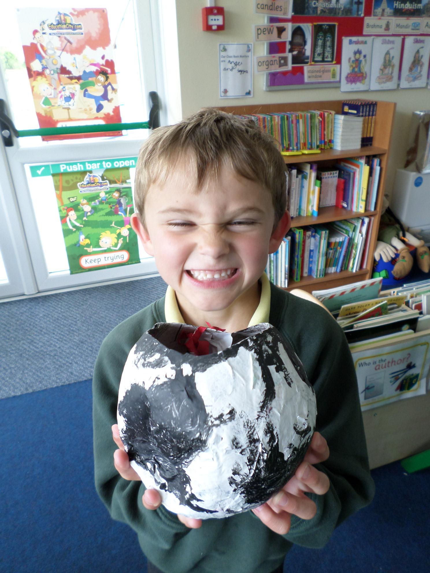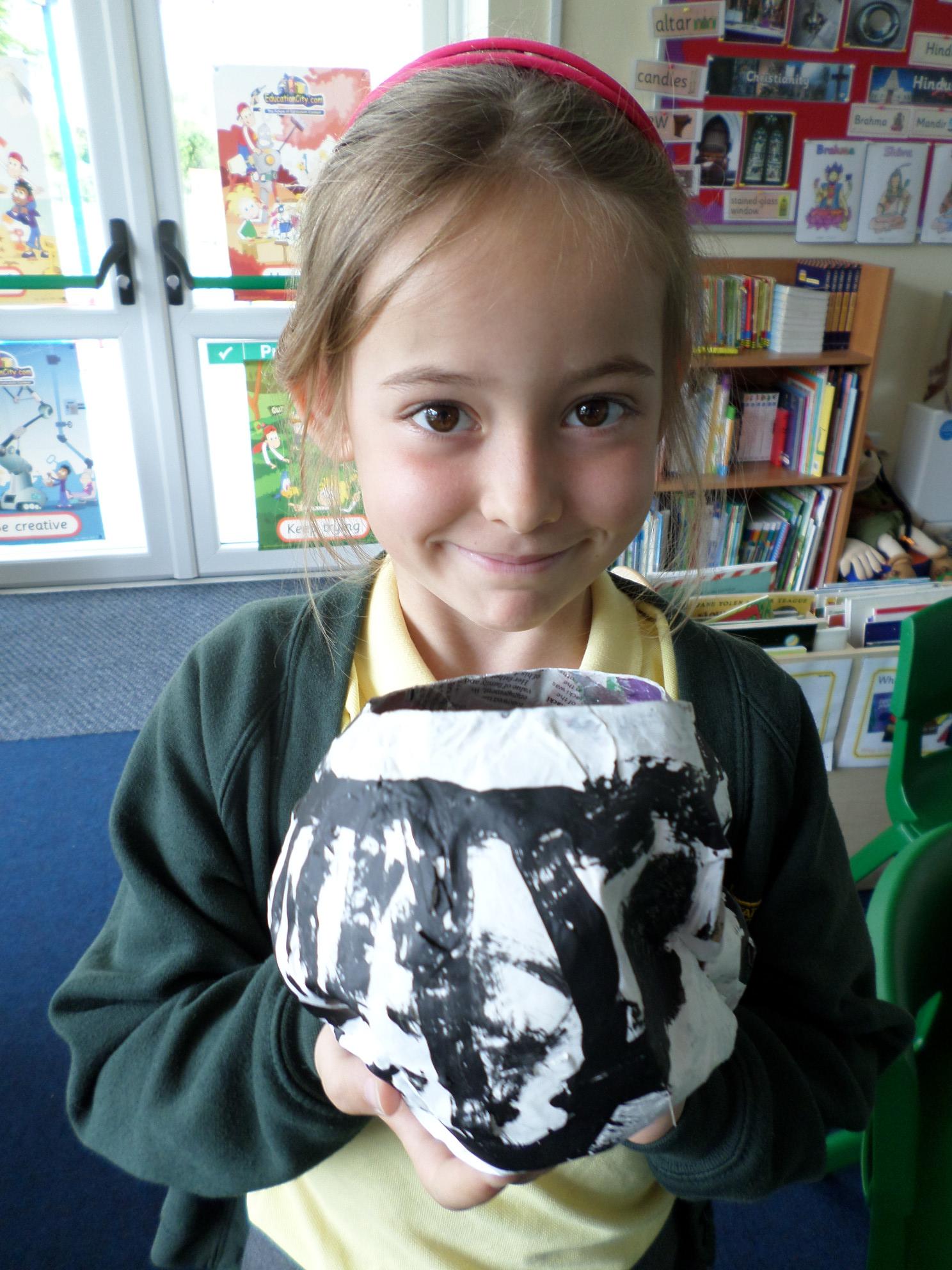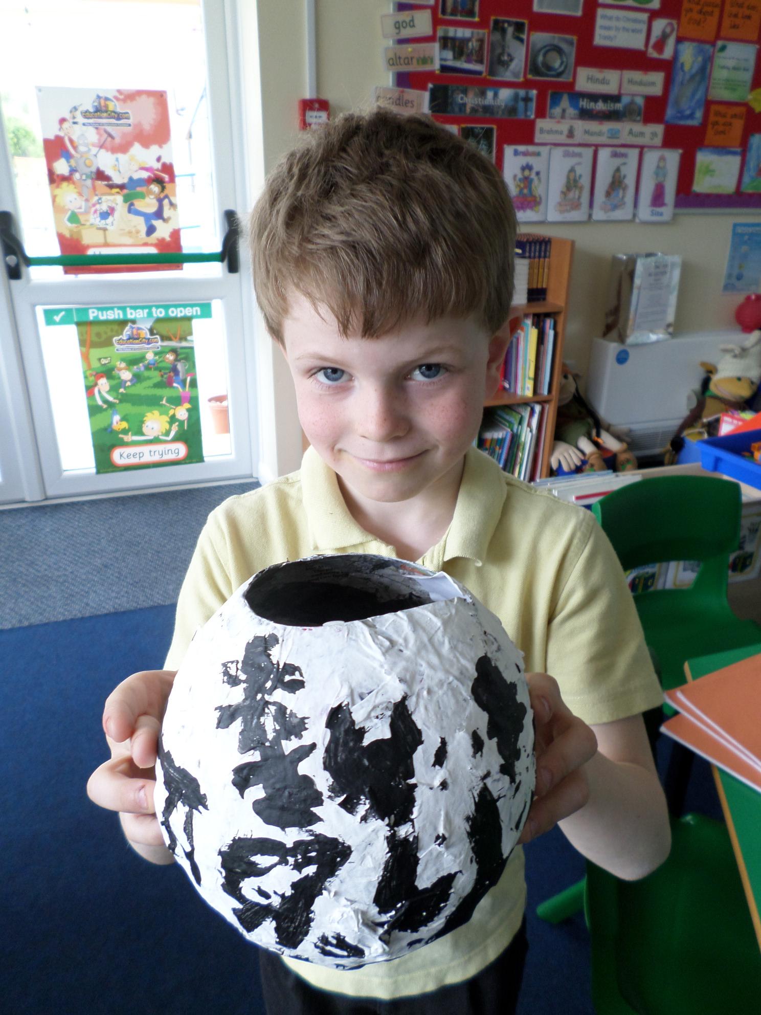 We have been looking at African art and also at the way ostrich eggs are used as water bottles. We made our own papier mache eggs and decorated them to resemble the ostrich egg water carriers. We had great fun and got very sticky. When we popped the balloons, some of our carriers wrinkled a bit but we still managed to decorate them and we think they look great. Have a look at the photos below. If you want to see more of our African art work check out the class Art and Design sub page to see our colourful African collars.