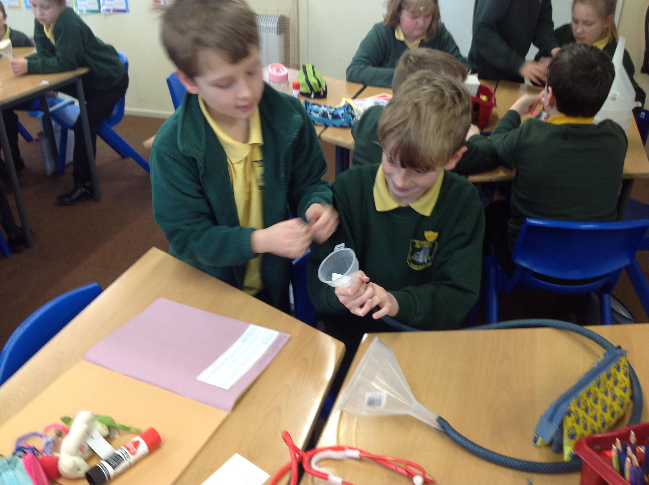 Today we learned a little about stethoscopes. First we looked at a labelled diagram and discussed how they worked, then we worked as teams to create our own versions using tubing and funnels. We were looking at different joining techniques that we could use to join the elements together.