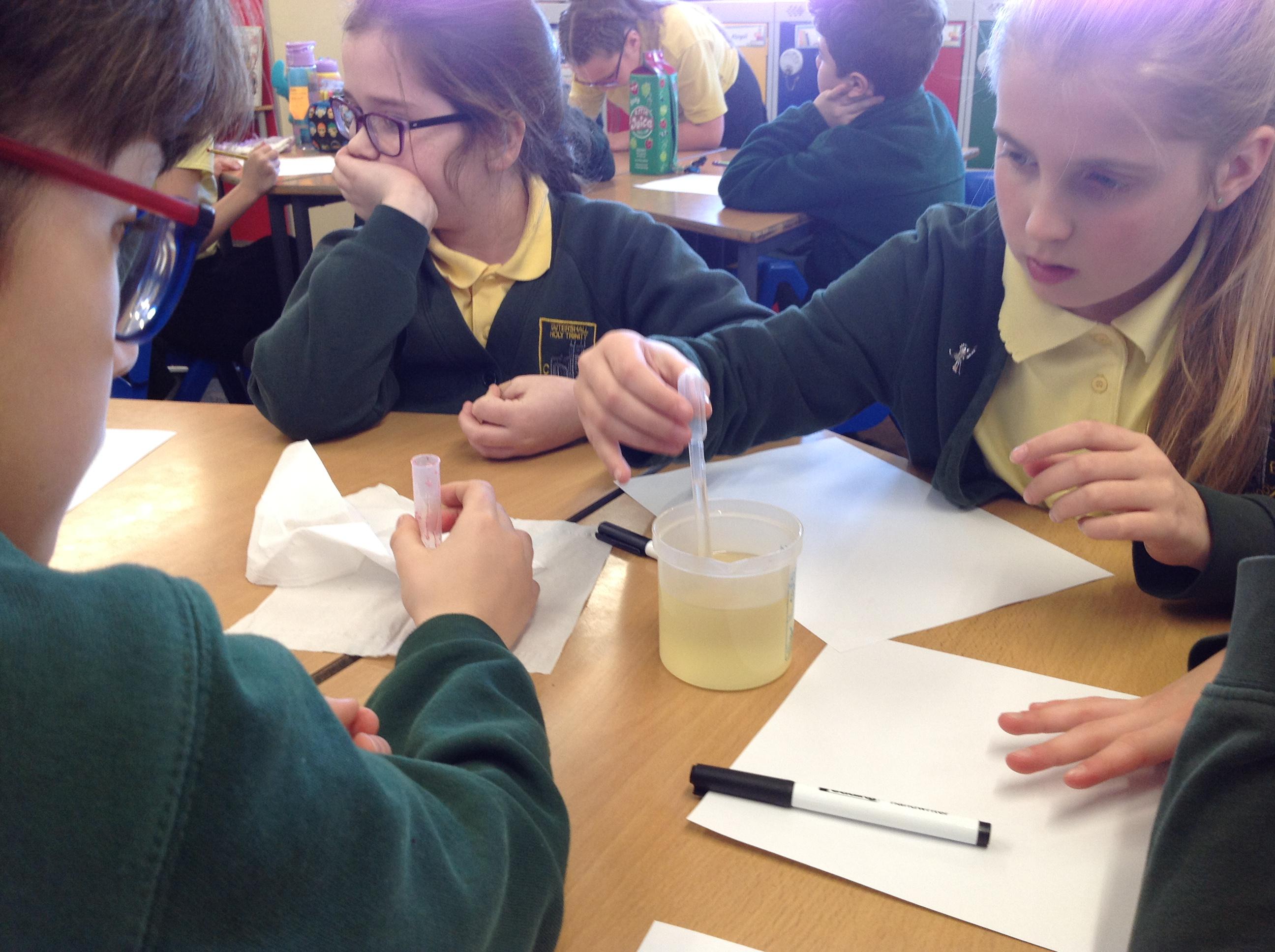 We created fake blood samples using: red coloured syrup, oil and milk.