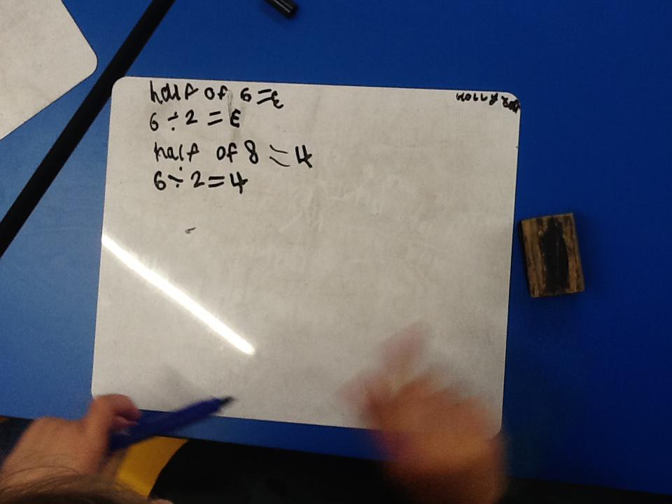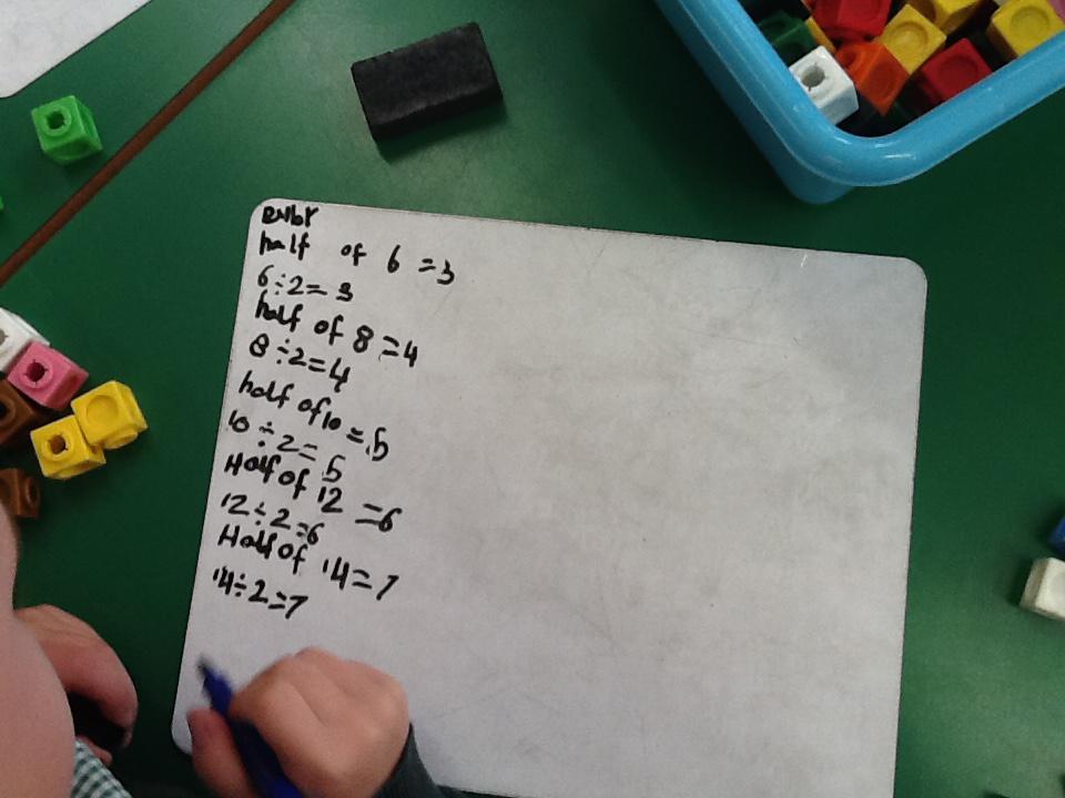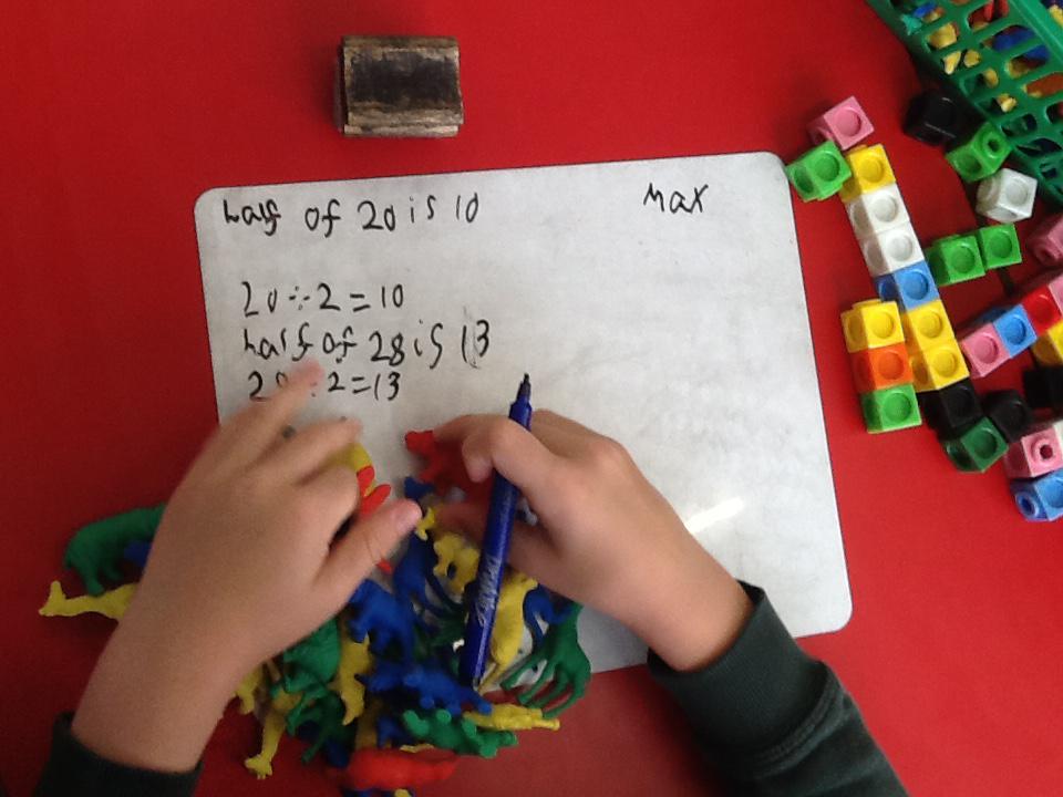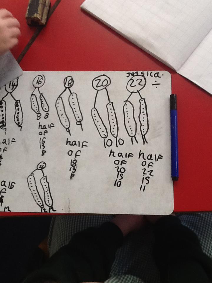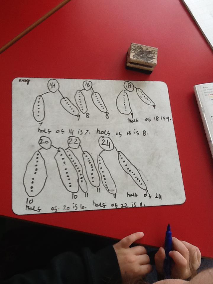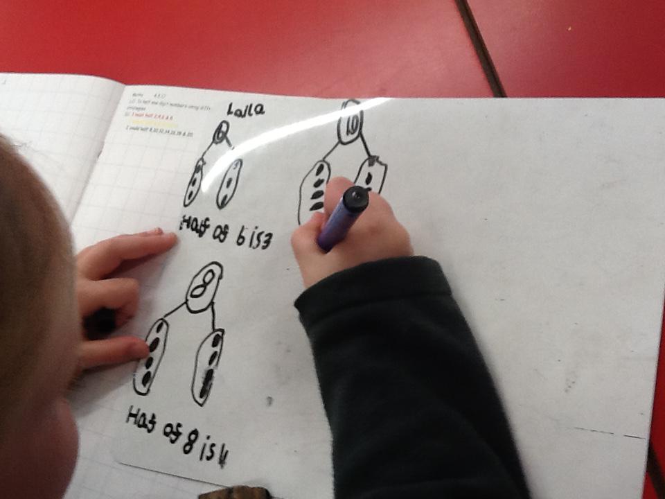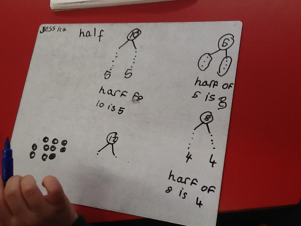 In maths this week we have been learning more about doubling and halving. We recognised the multiplication and division symbol and understood about having equal groups. We have used lots of different strategies to help us this week but our favourite was drawing the numbers out in dots.