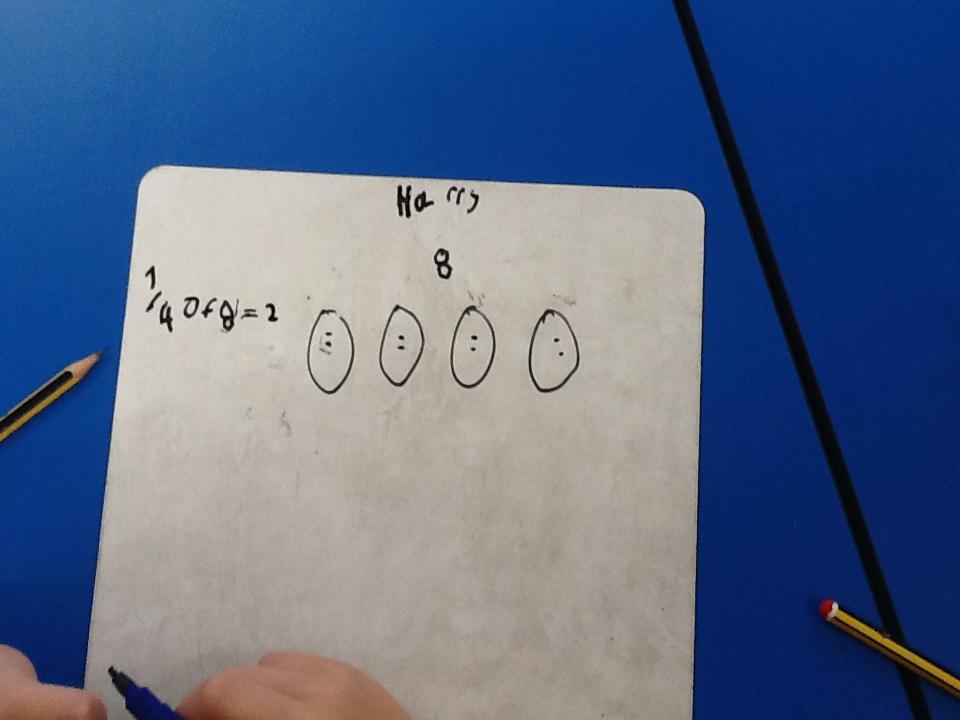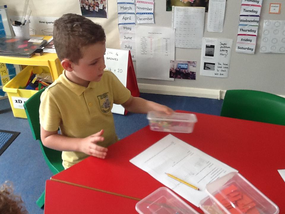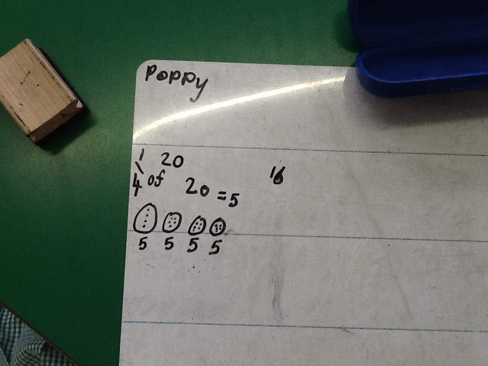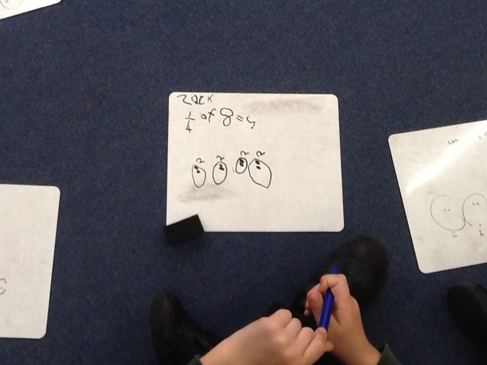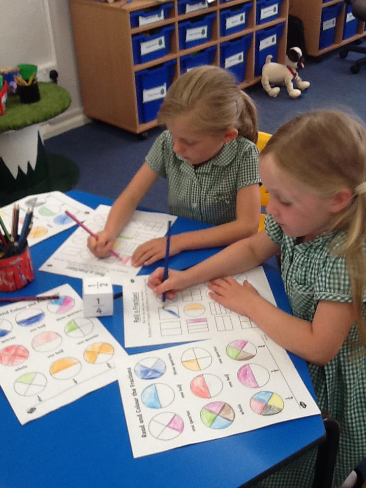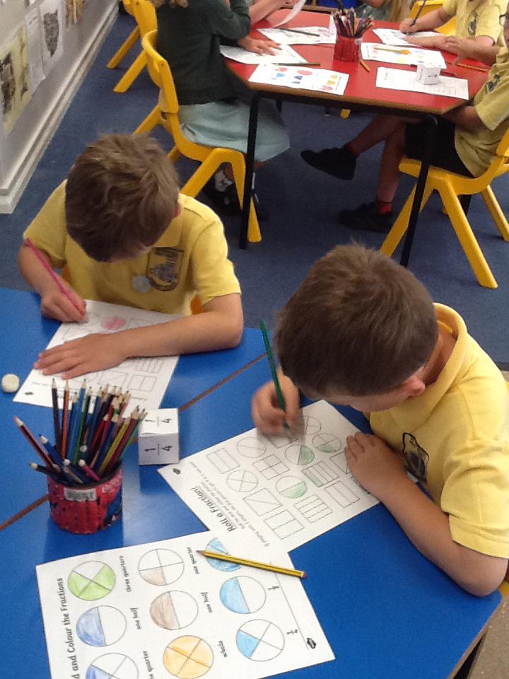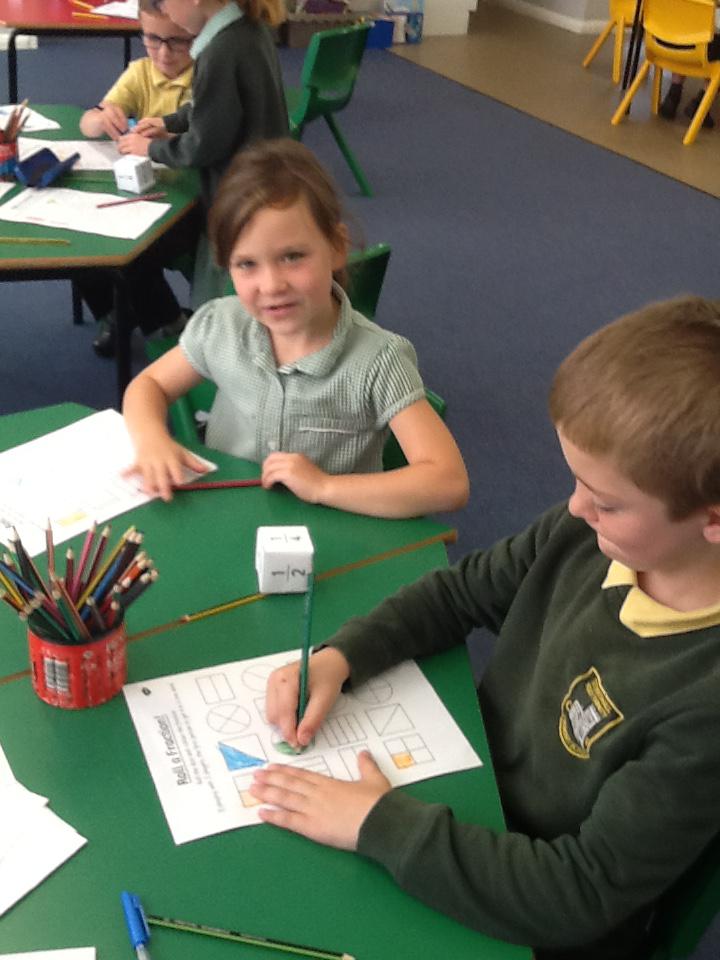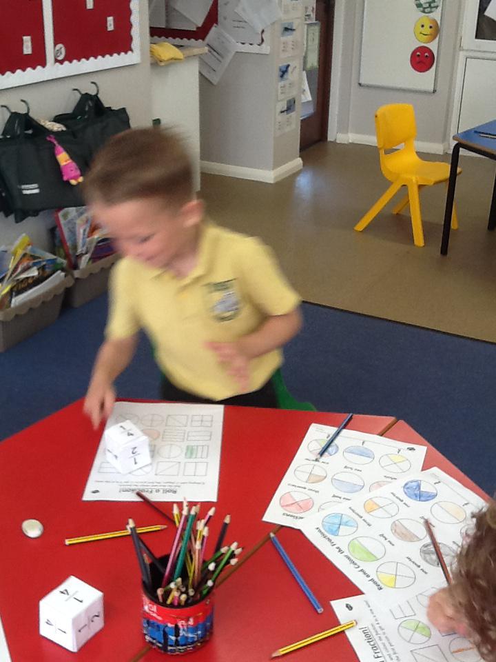 This week in maths we have been finding fractions of amounts and shapes. We have been looking at 1/2, 1/4, 3/4 and a whole. We used different equipment to help us find the different amounts. We played a fraction game where we used a fraction dice and then had to colour that fraction of a shape in.