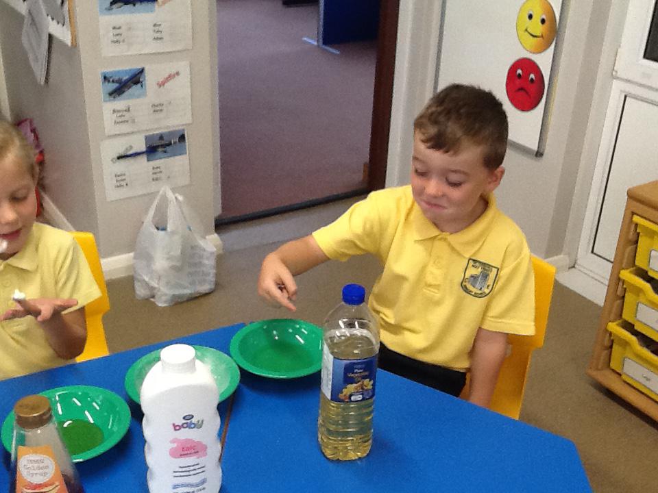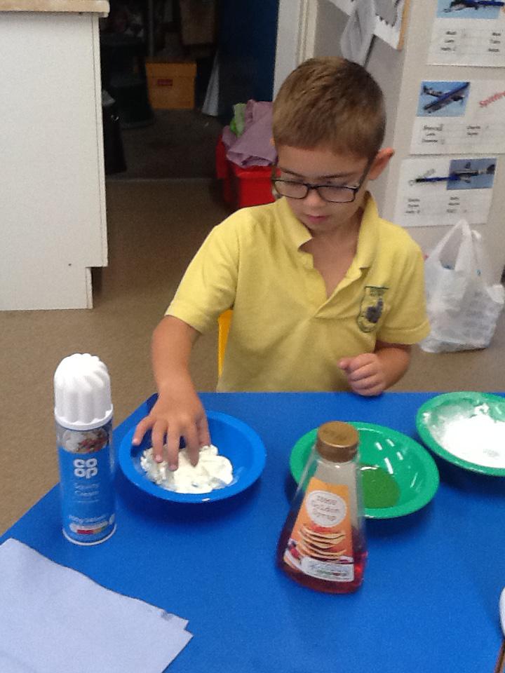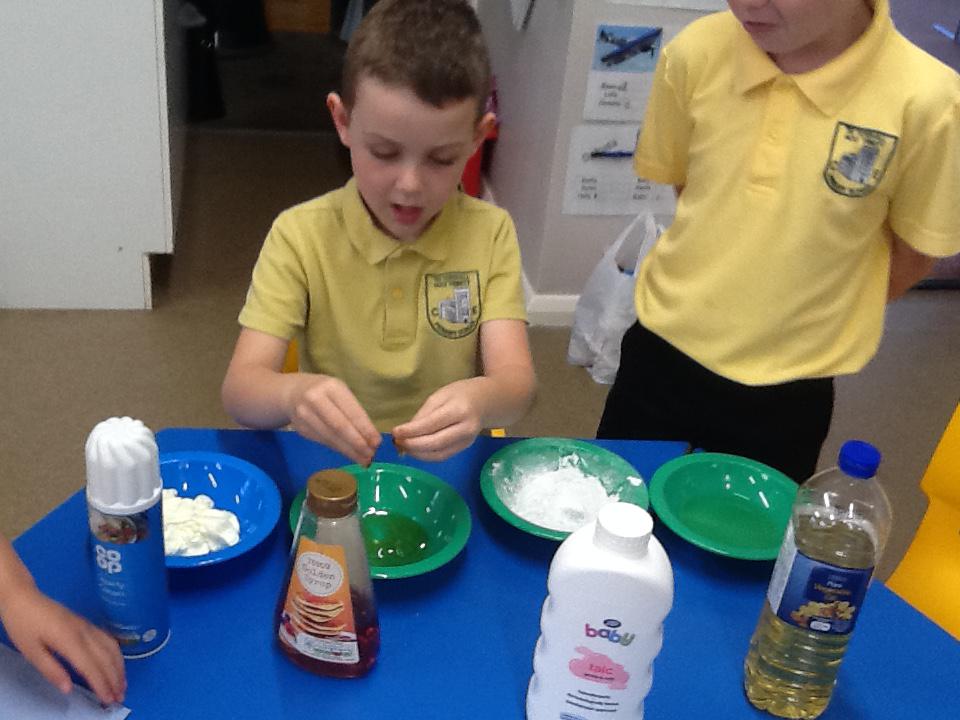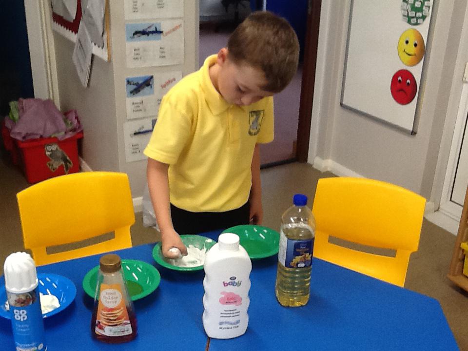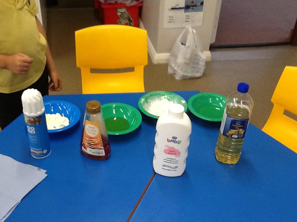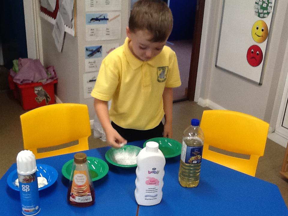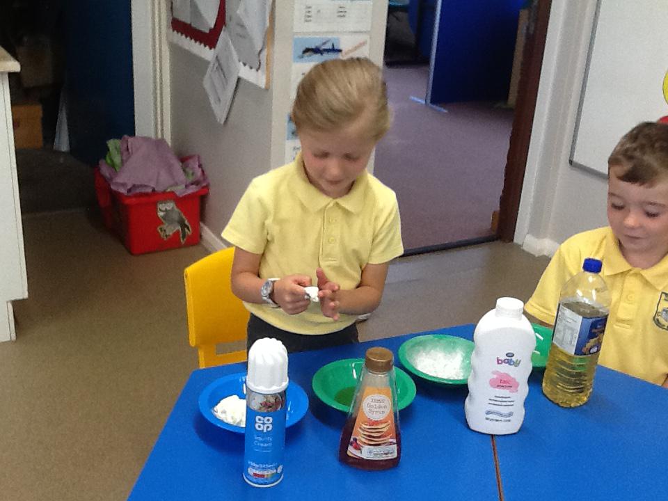 We have had two very exciting science investigations over the past couple of weeks. Continuing with our materials topic we decided we wanted to investigate how different things felt and what their properties would be like. We had great fun feeling chocolate spread, shaving foam, talc, vegetable oil, maple syrup and face cream. We were able to talk about the different properties of these things and how we thought they helped them do their job.