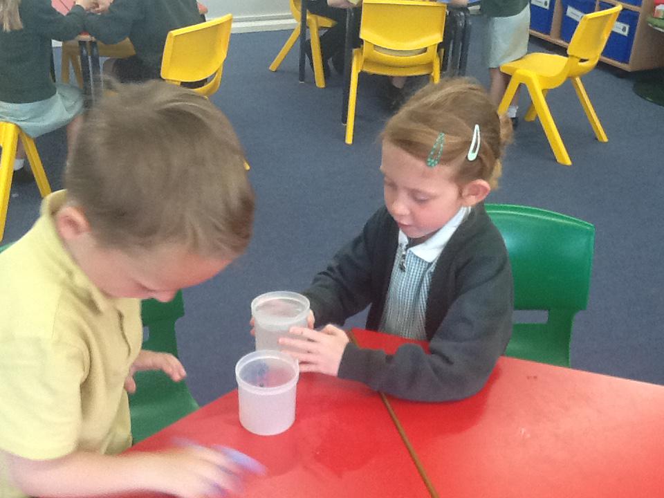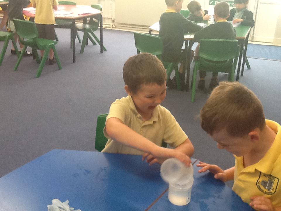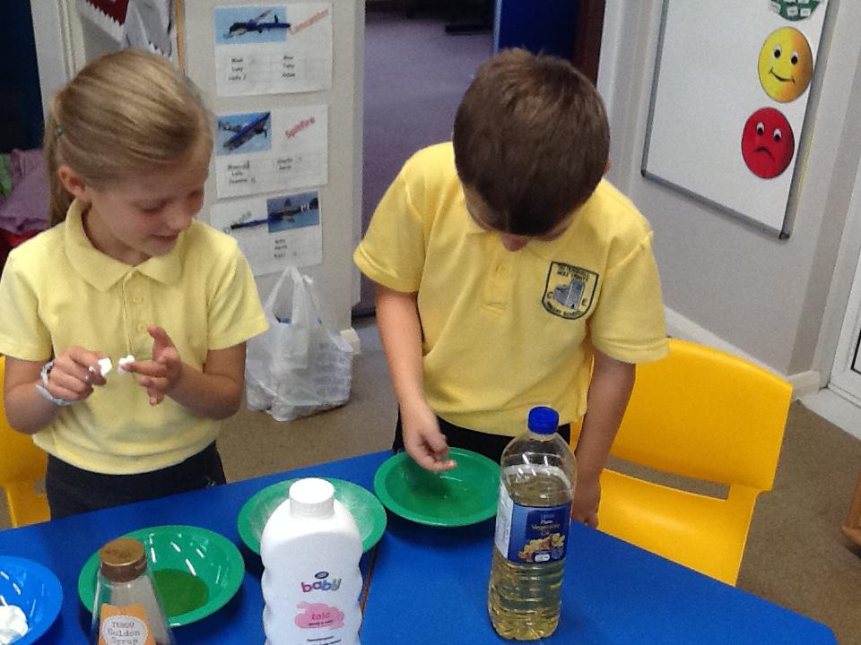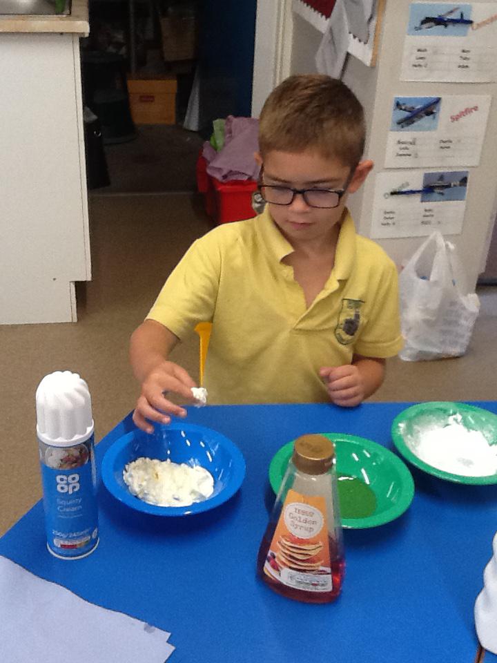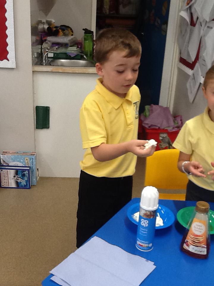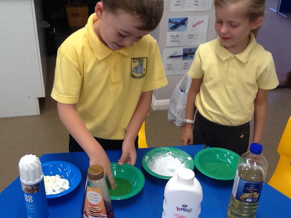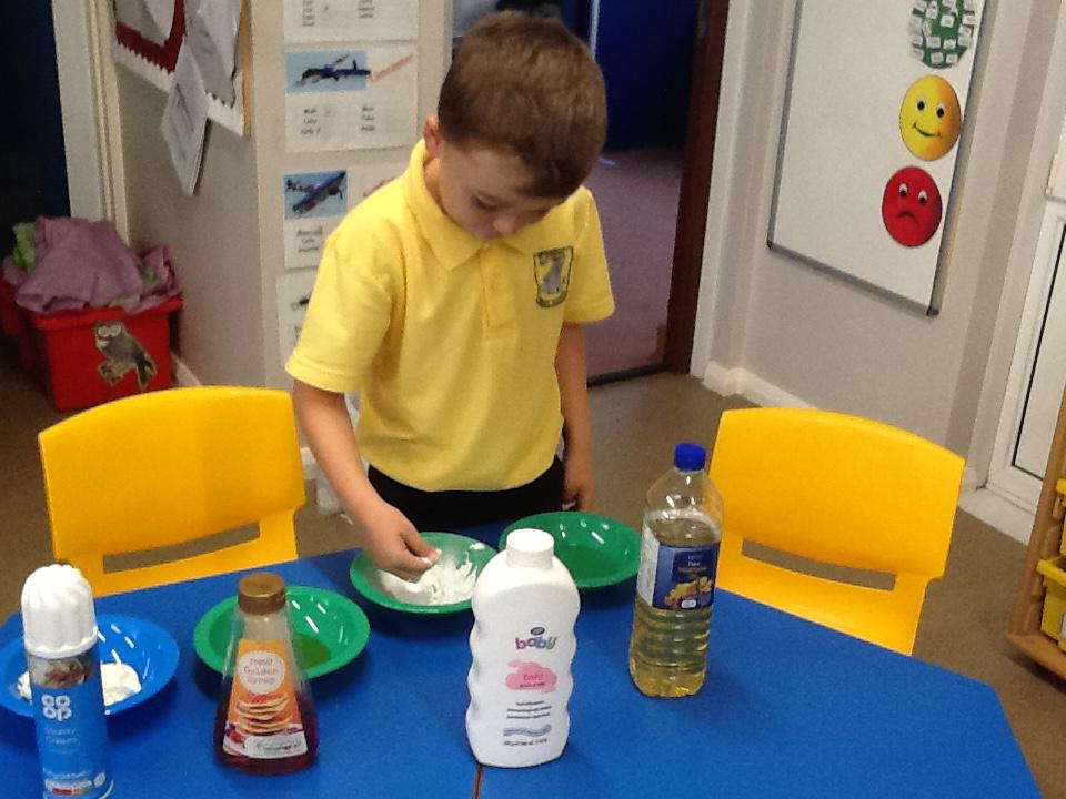 We have had two very exciting science investigations over the past couple of weeks. Continuing with our materials topic we decided we wanted to investigate how different things felt and what their properties would be like. We had great fun feeling chocolate spread, shaving foam, talc, vegetable oil, maple syrup and face cream. We were able to talk about the different properties of these things and how we thought they helped them do their job.