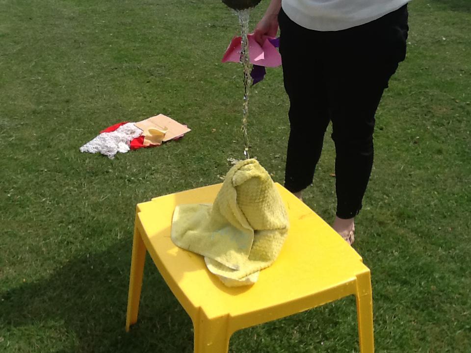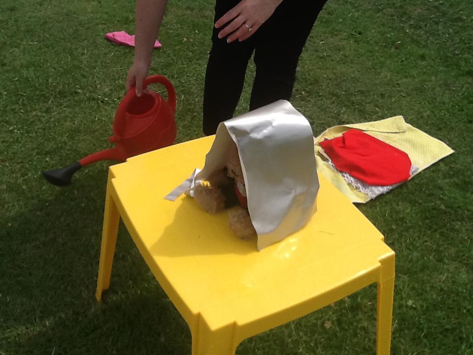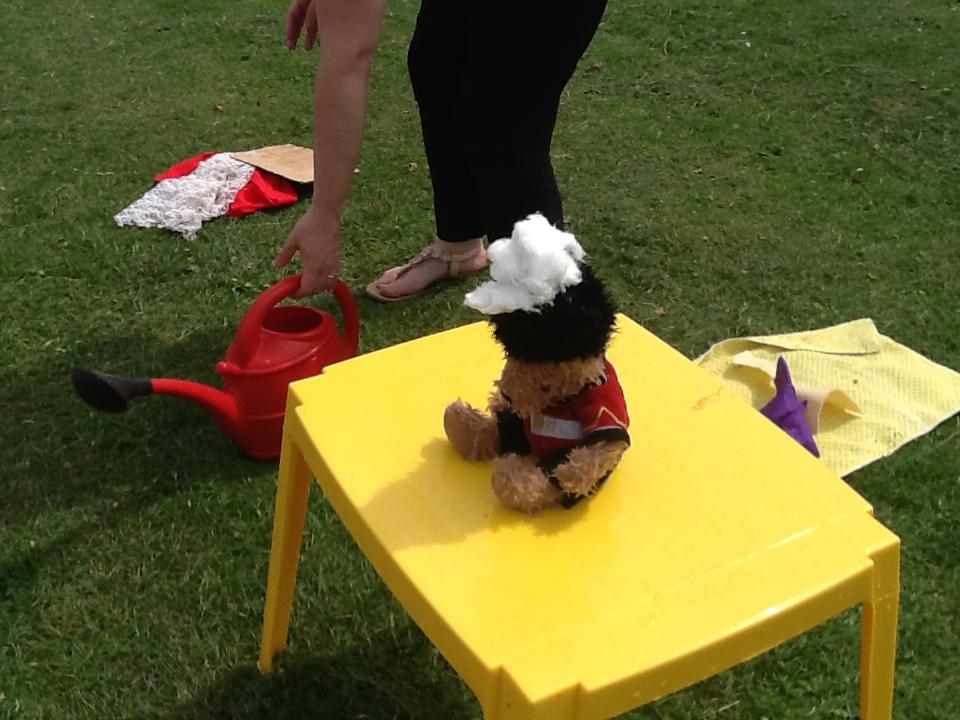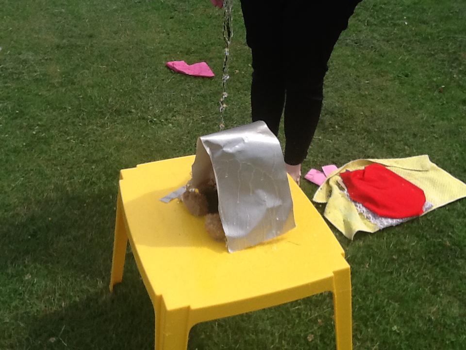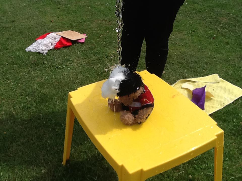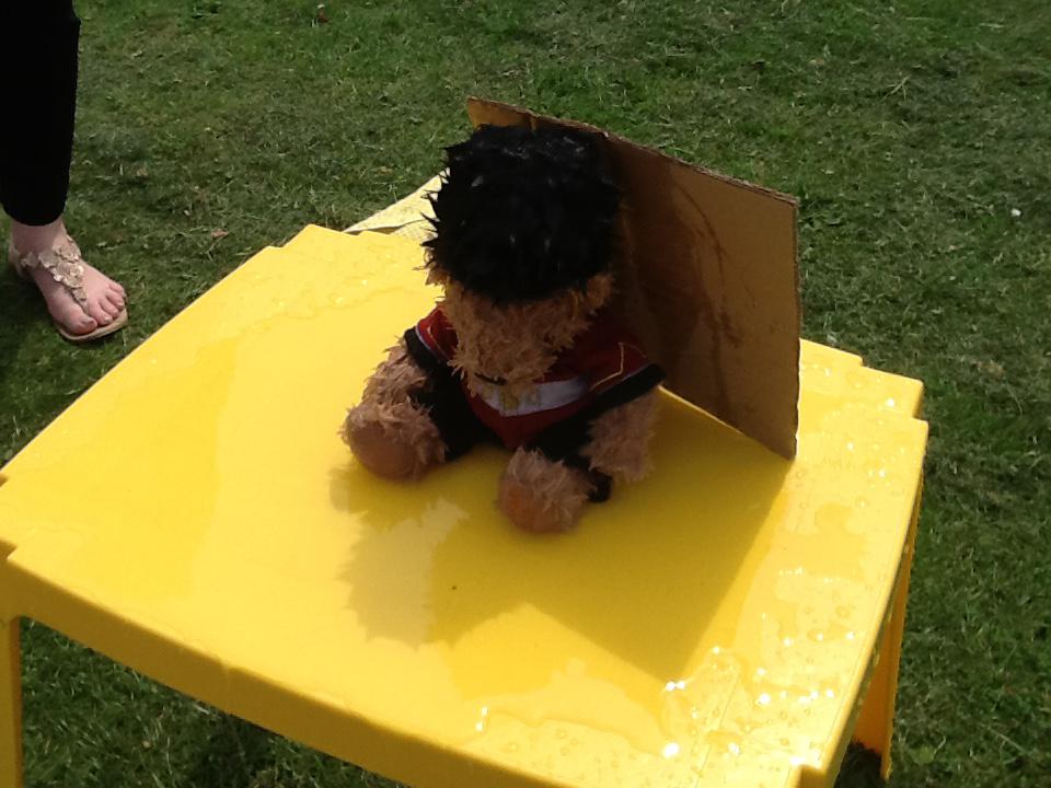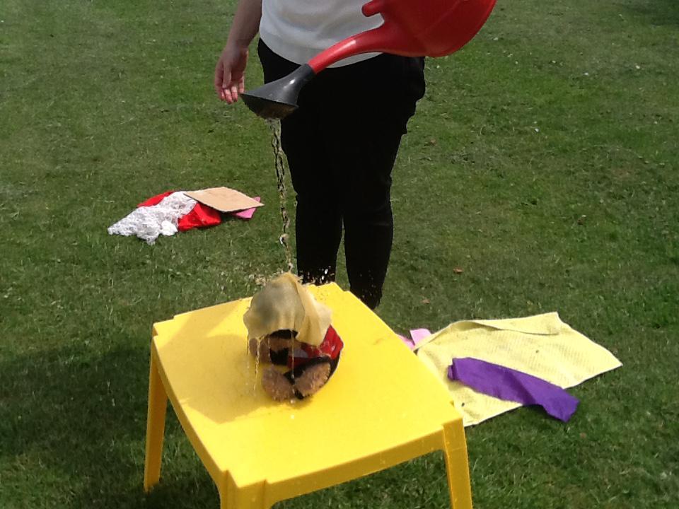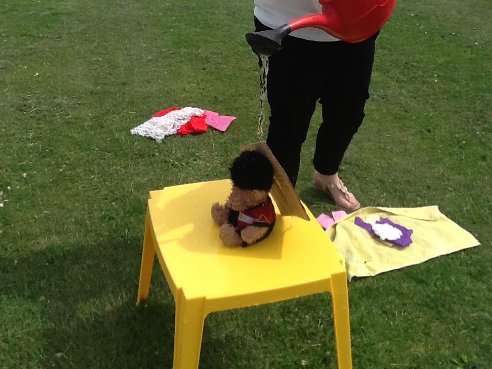 This week we have been investigating the best material to use to make Benny a waterproof coat. We looked at the properties of lots of different materials and then made predictions of which material we thought would be the best one to use. We had to give reasons for our predictions. Unfortunately some of the materials we investigated were not very waterproof and Benny got very wet! After our investigation we compared different materials deciding that material backed with a plastic coating was the best thing to use for Benny's new coat!