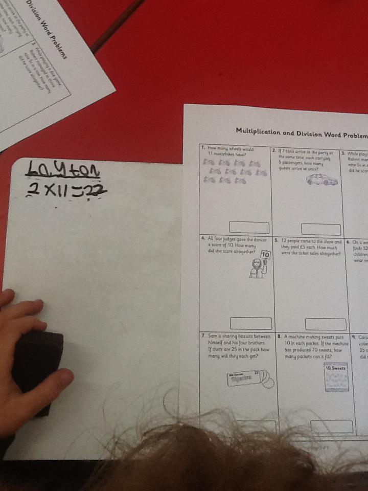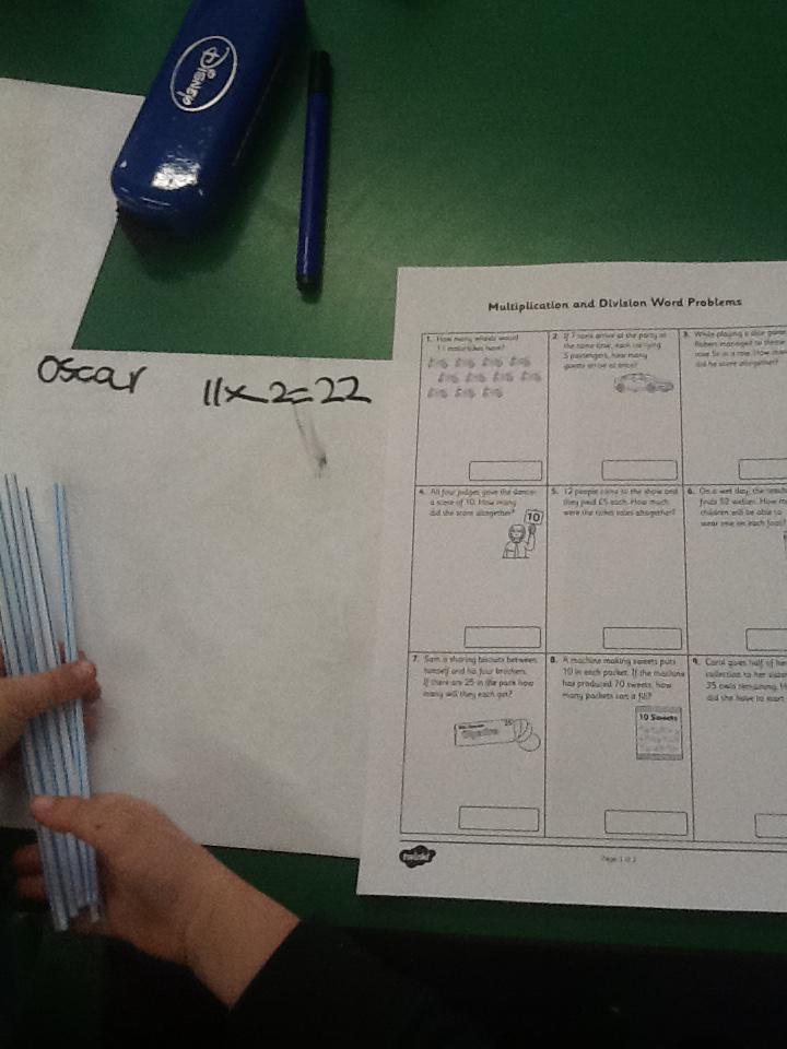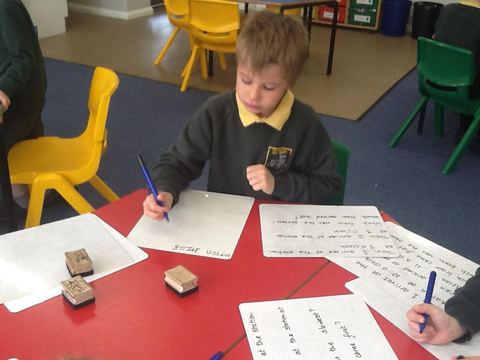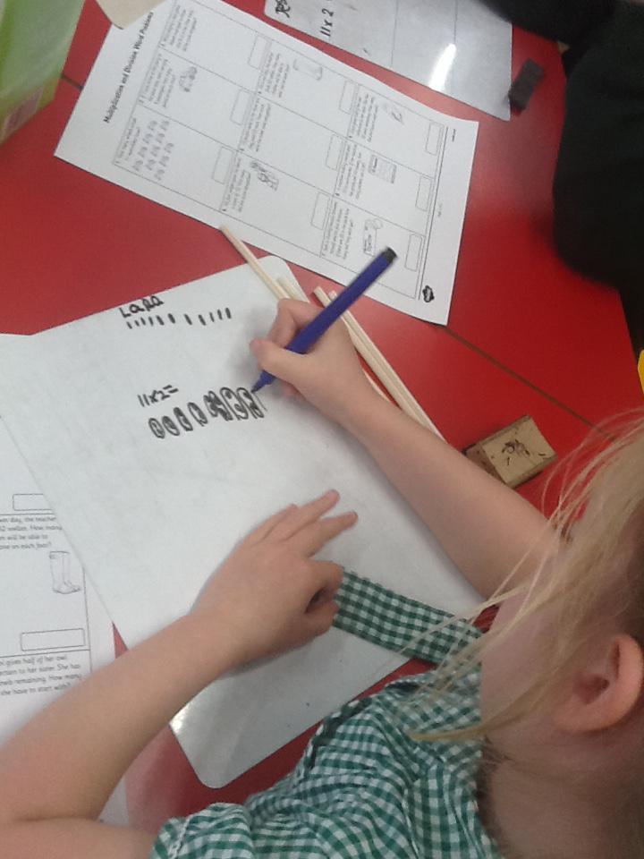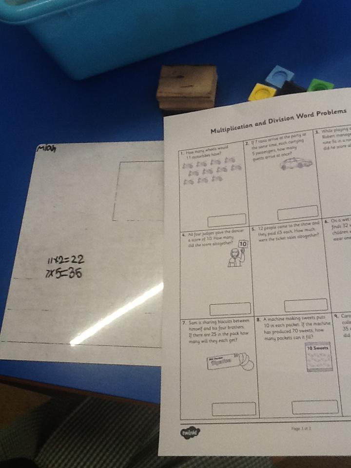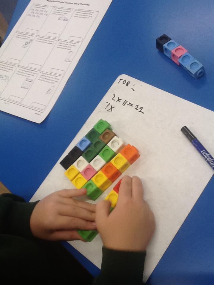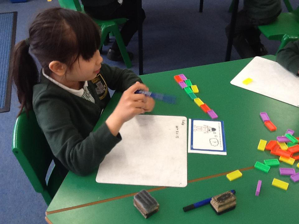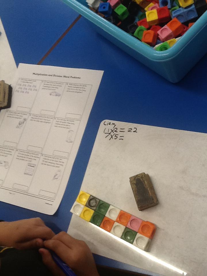 In maths this week we have been solving word problems. We have been looking at ways to find the information we need and then write down the number sentence so we can solve the problem. We looked at problems that used all four number operations. It was good fun using different equipment to help us.
