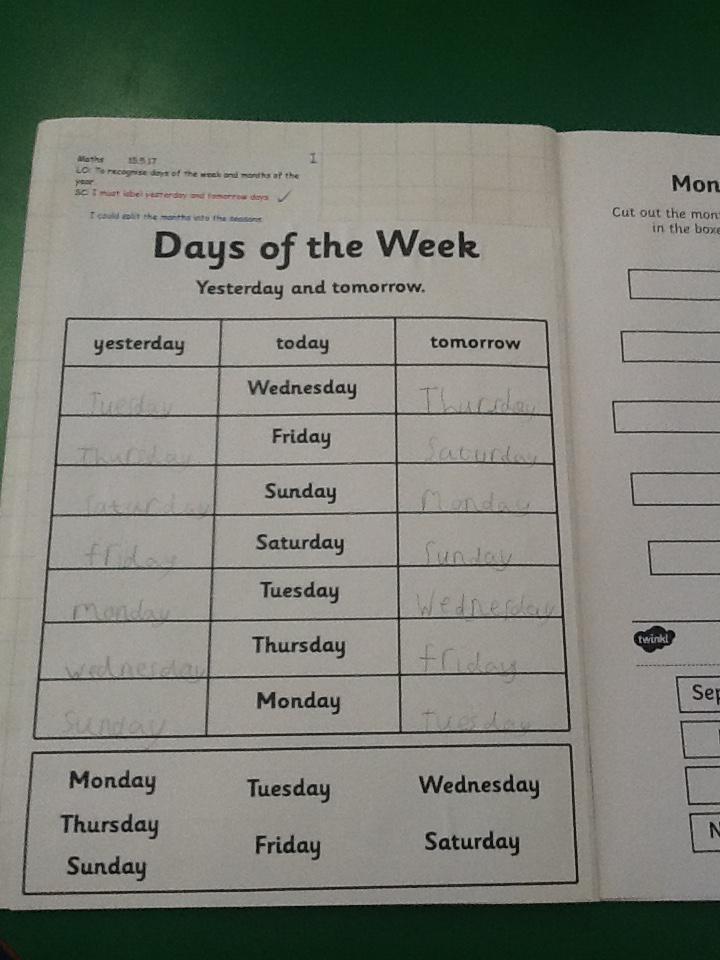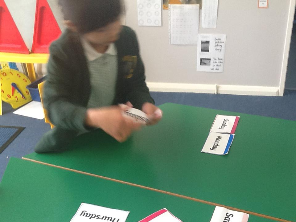 In maths this week we began working with days of the week. We thought about ways to remember the different days and then solved problems to find yesterday and tomorrow. We then looked at the different months of the year. We need to keep working on these so please can you help your child at home? We sorted the months into the different seasons and thought about different things that happen in each month. We then moved on to creating o'clock times and half past times. We used clocks and then drew our own times onto blank clock faces.