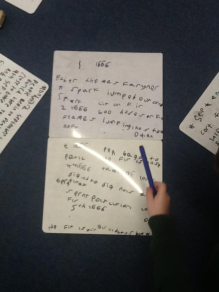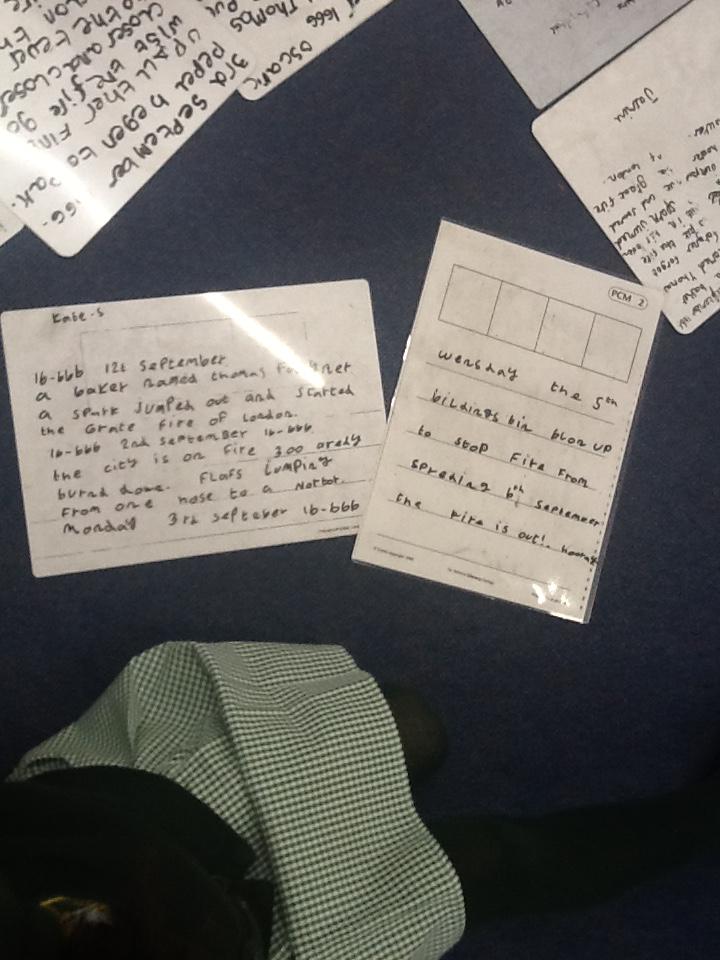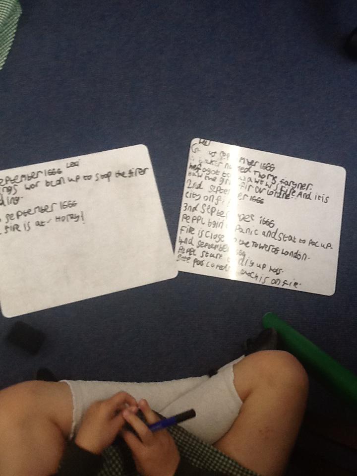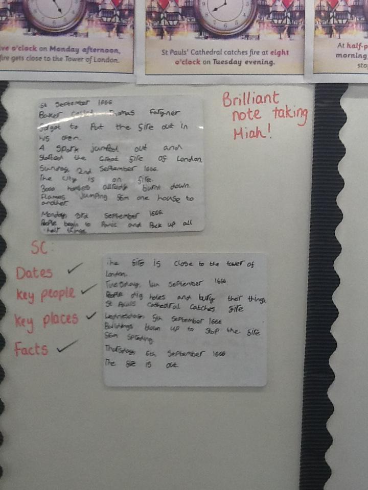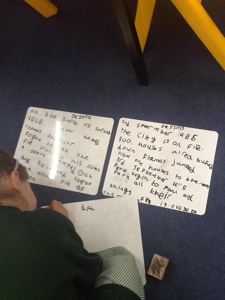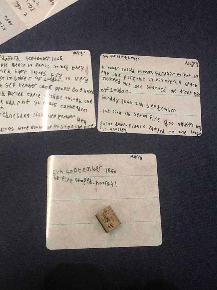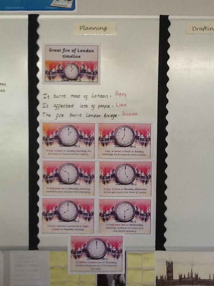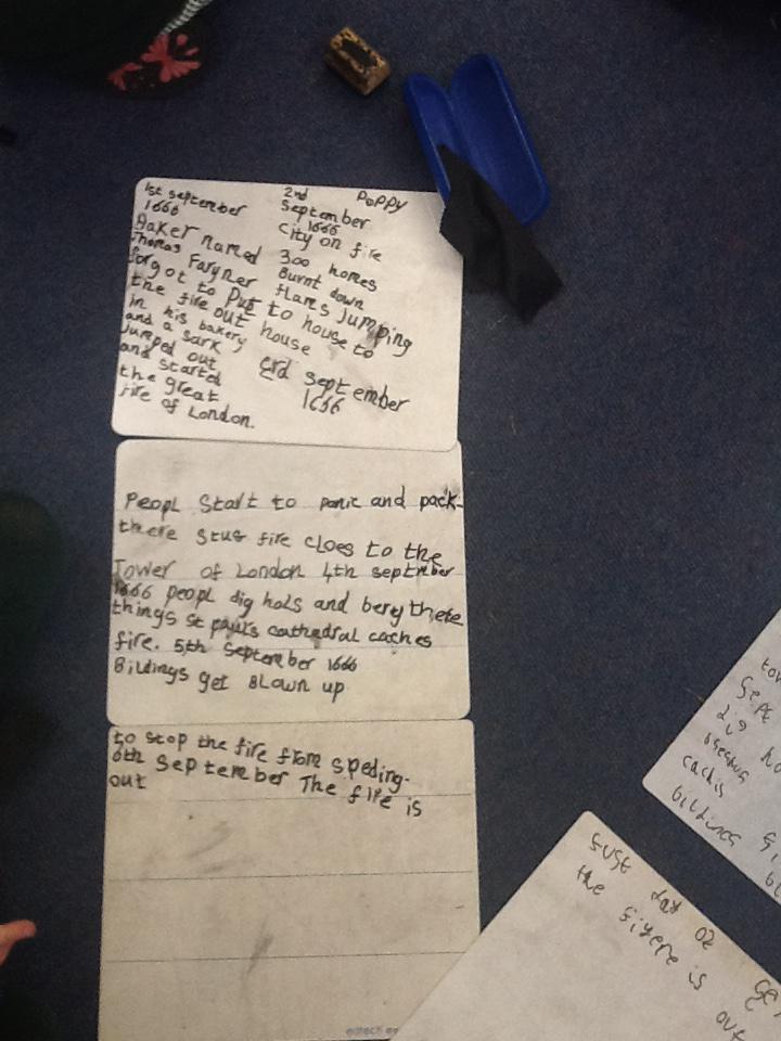 This week we continued our work on The Great Fire of London. We began by making notes on the key events within the great fire. We then used these notes to help us sort some jumbled cards so we knew on which day the different things happened. On Wednesday we began designing our own time lines thinking carefully about what happened on each day and how we could present it neatly in our books.