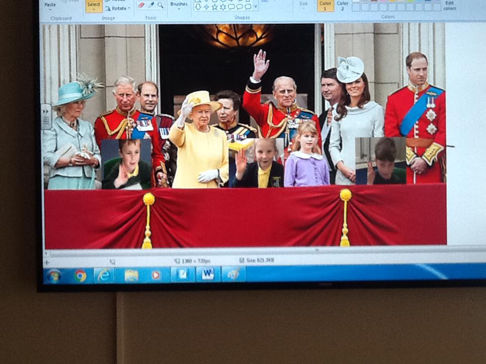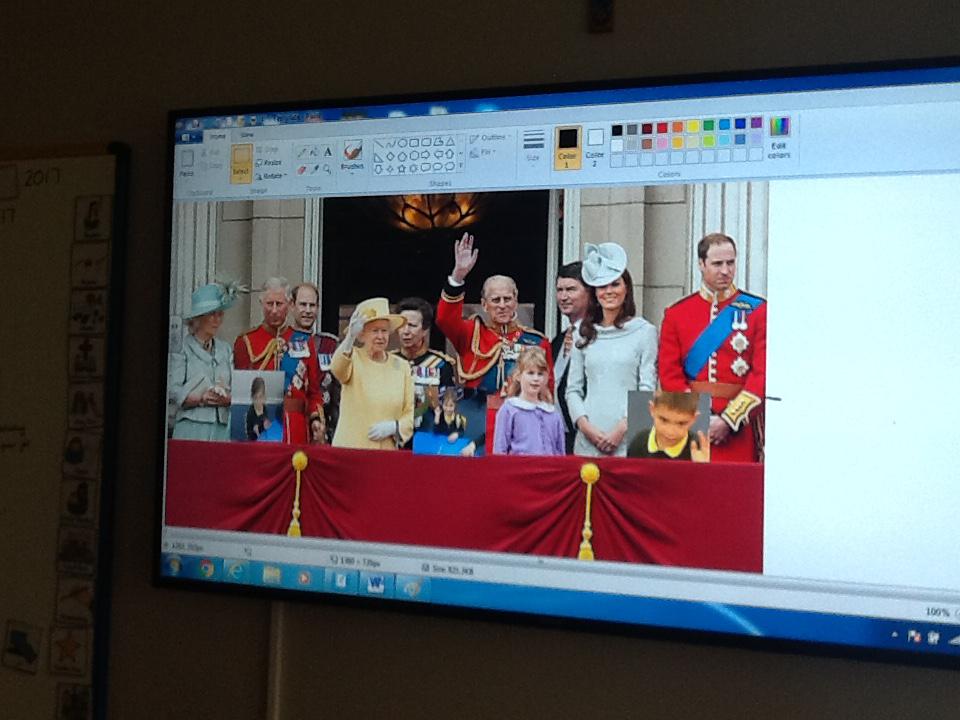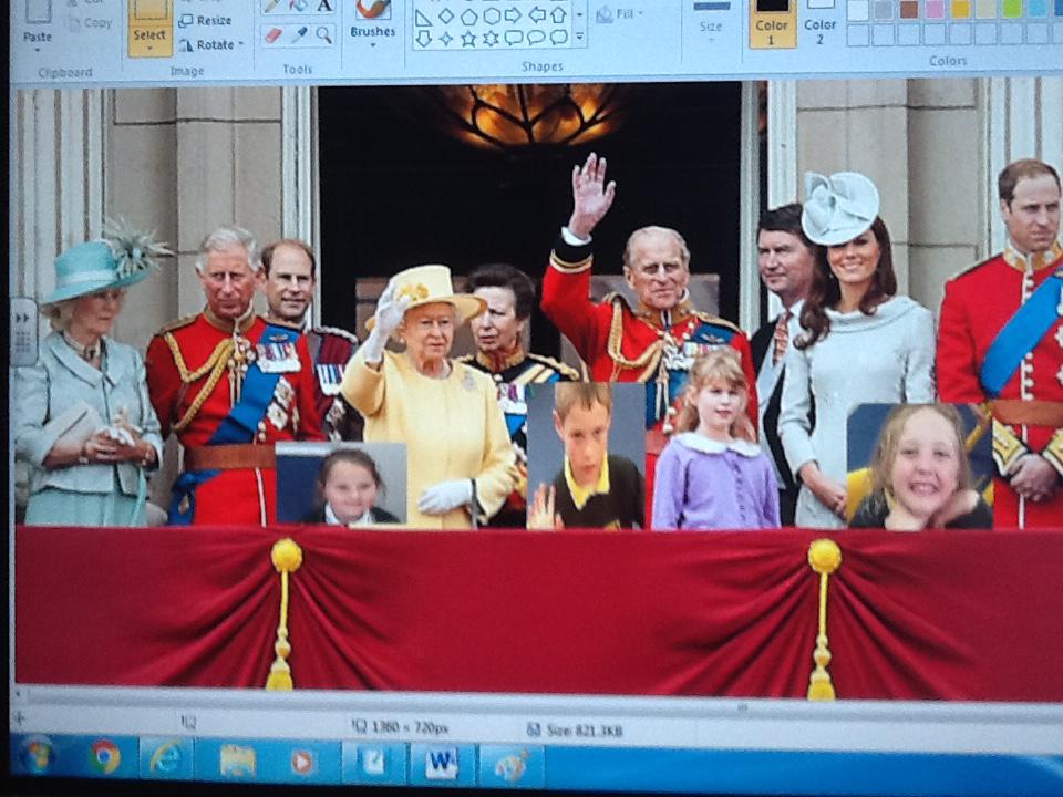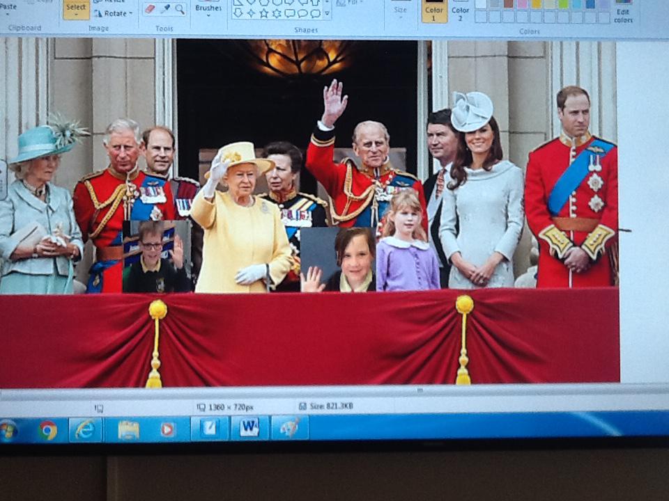 We have been learning lots of things about the Royal family this week and we thought it would be fantastic for us to stand on the balcony at Buckingham Palace. Unfortunately we were not allowed to go on the balcony so we decided to use ICT to pretend. We started off by doing our best royal pose for a photograph and then we copied and pasted our image onto the royal photograph. It was great fu pretending to be part of the Royal family!
