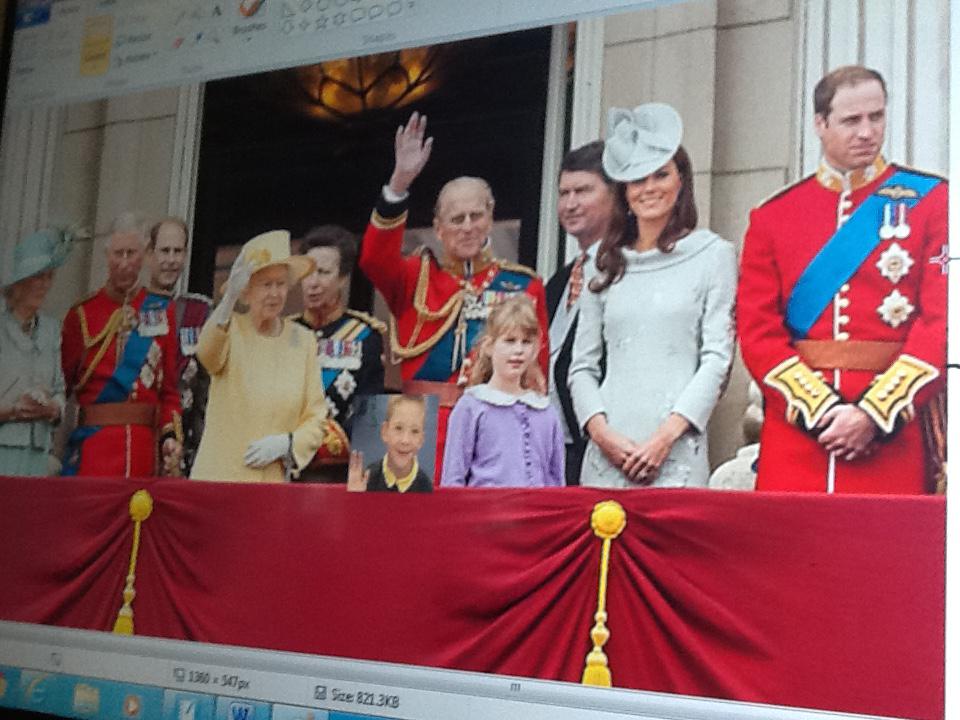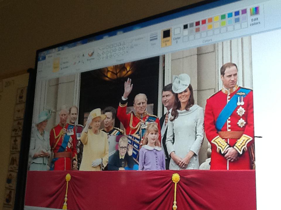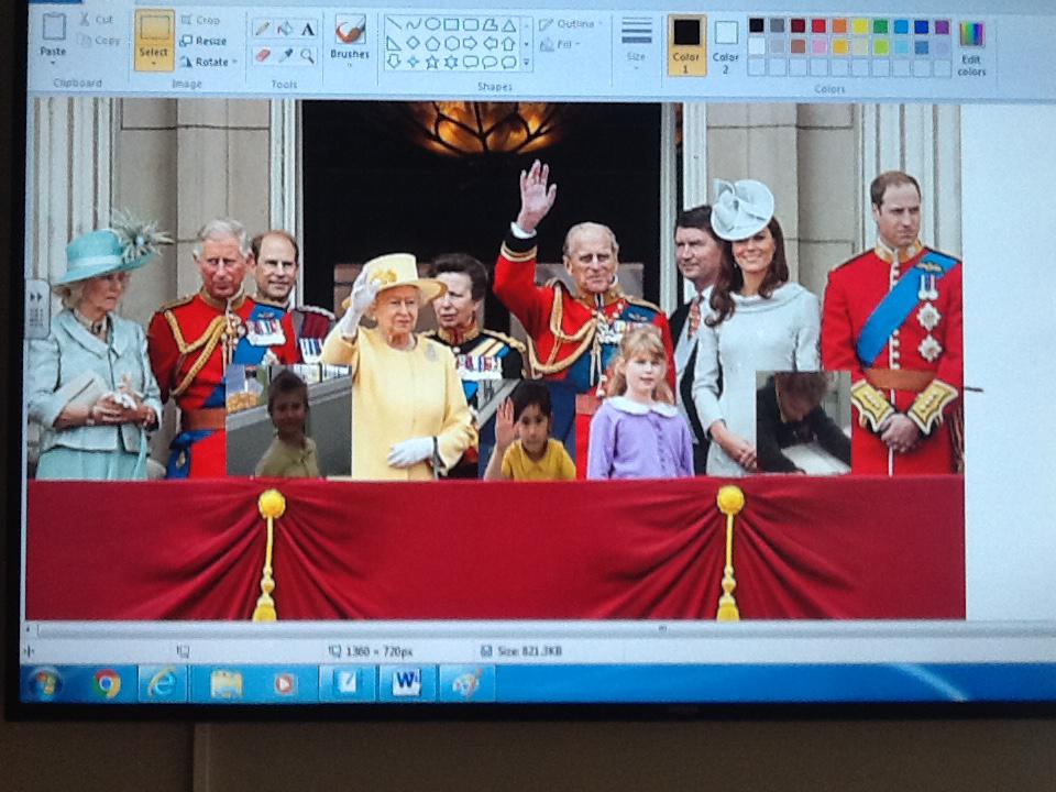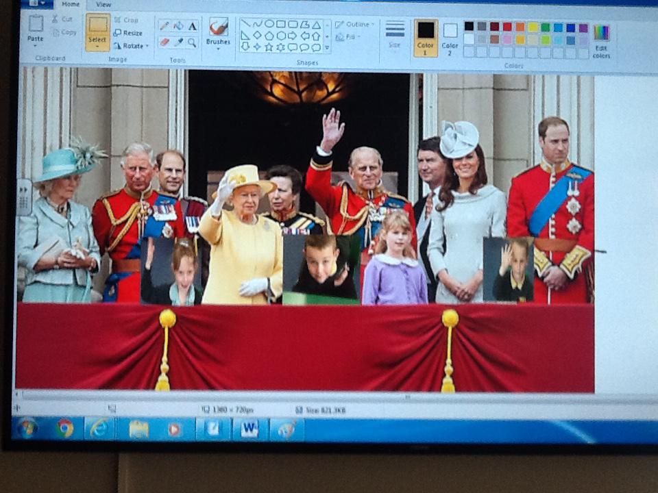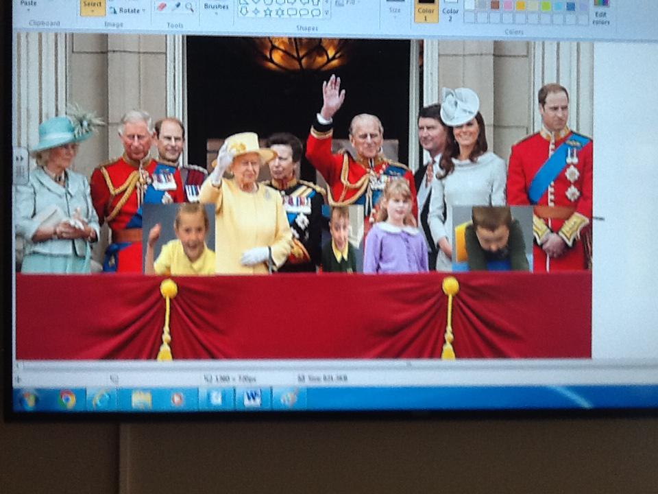 We have been learning lots of things about the Royal family this week and we thought it would be fantastic for us to stand on the balcony at Buckingham Palace. Unfortunately we were not allowed to go on the balcony so we decided to use ICT to pretend. We started off by doing our best royal pose for a photograph and then we copied and pasted our image onto the royal photograph. It was great fu pretending to be part of the Royal family!