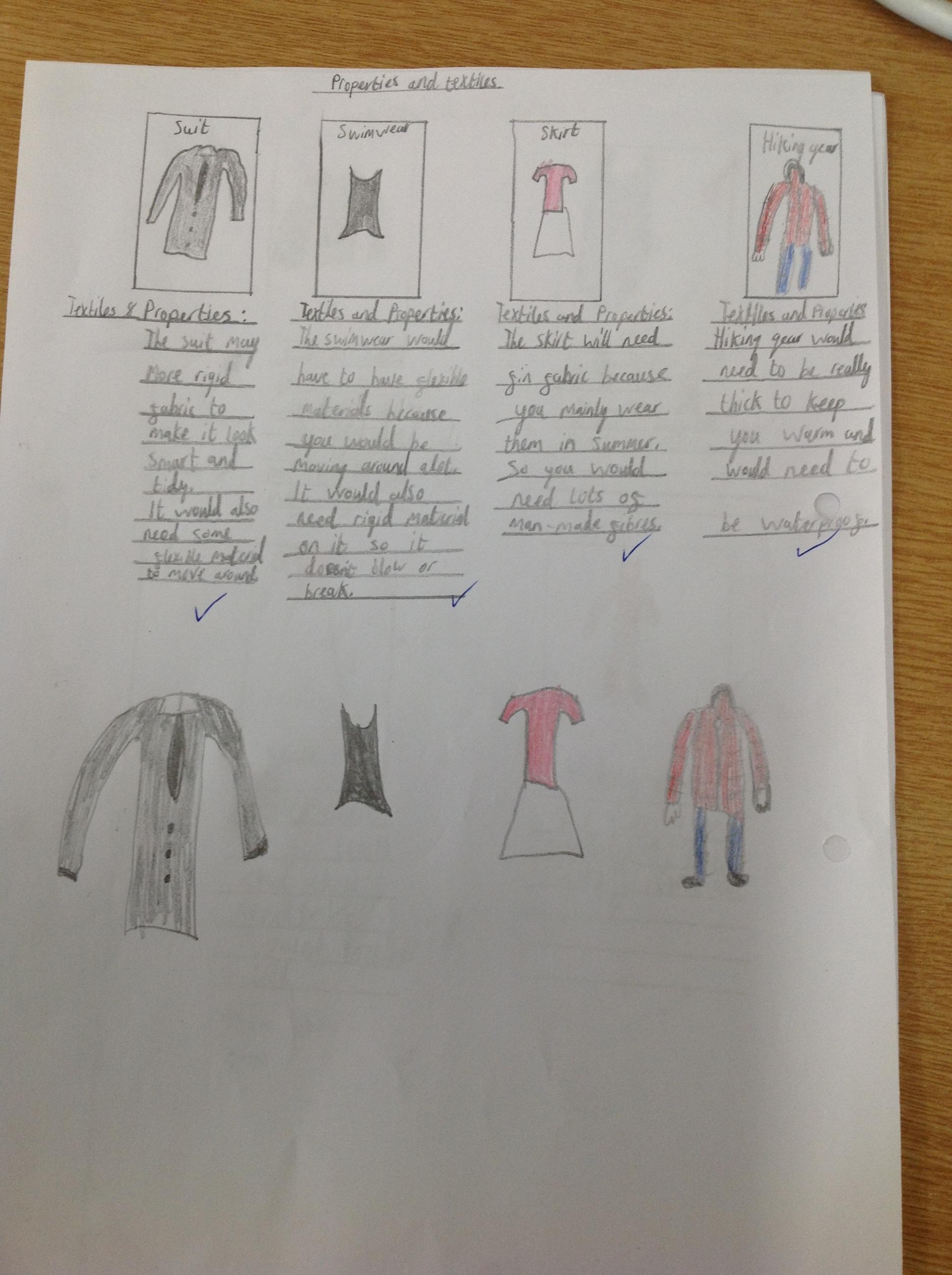 The children were then asked to look at images of different garments designed for different purposes and look at the properties of the textiles used.