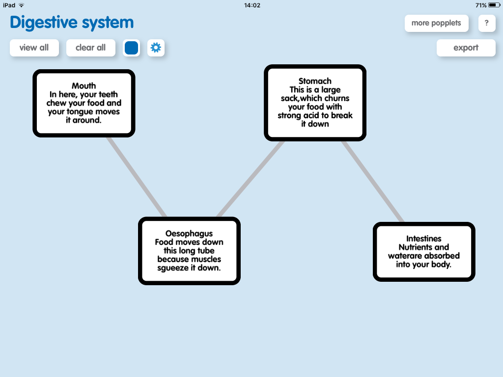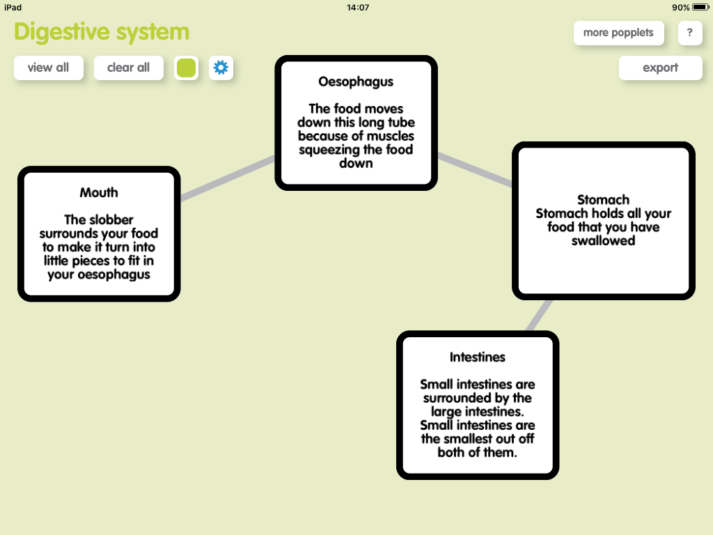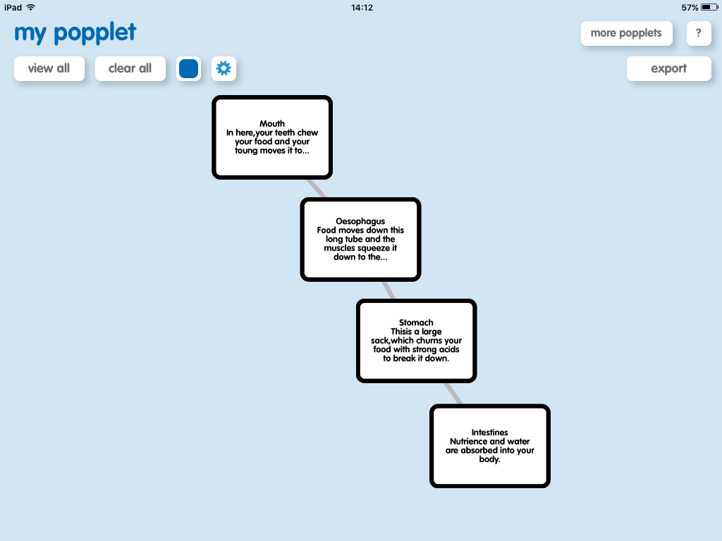 Today we have been using the app Popplet to create a flow diagram for the Digestive System. We started with the mouth, oesophagus, stomach and the intestines. We looked at the order food will enter each organ and what will happen to it while it was there. We will make this more complex over the course of the term!