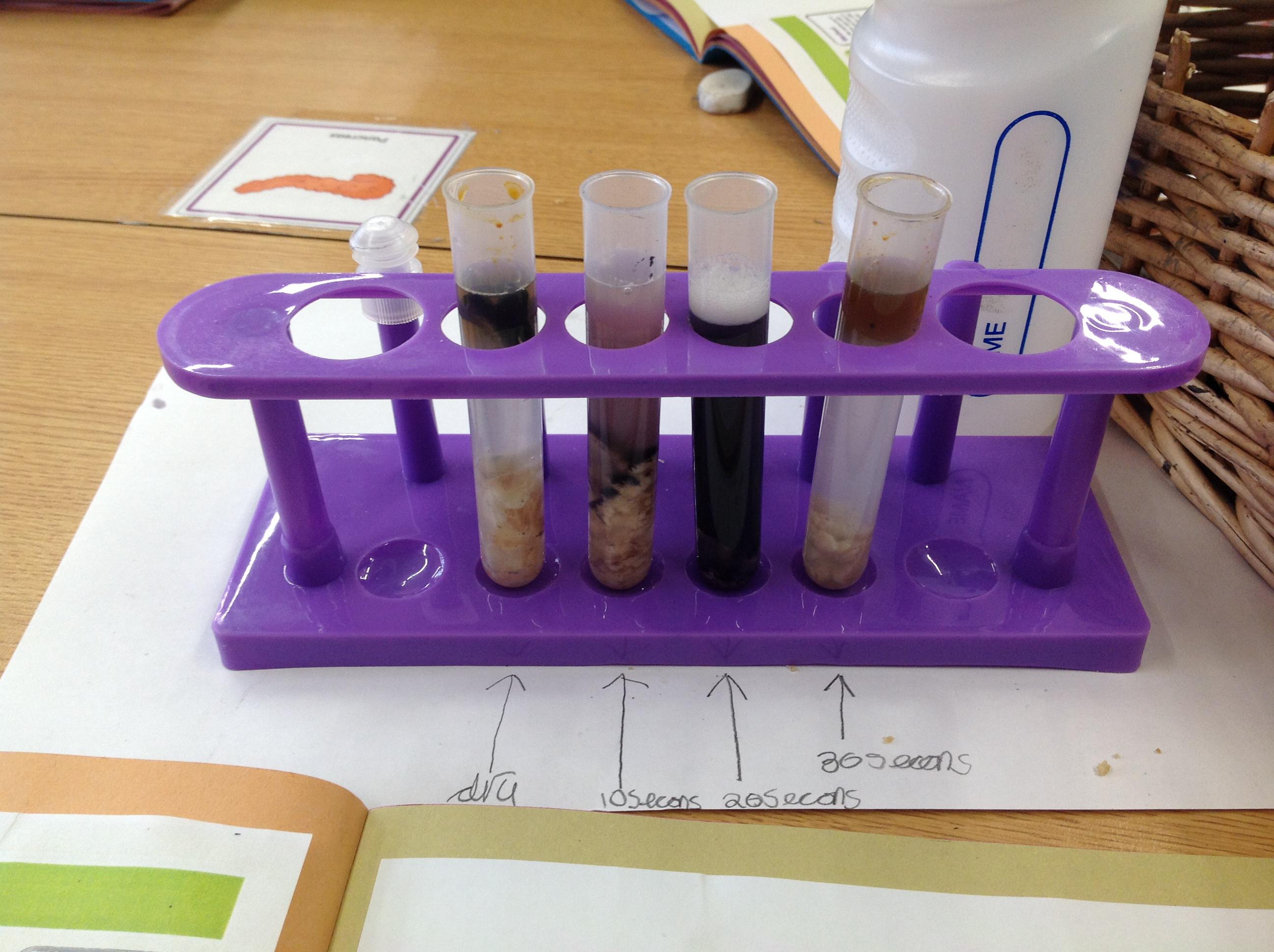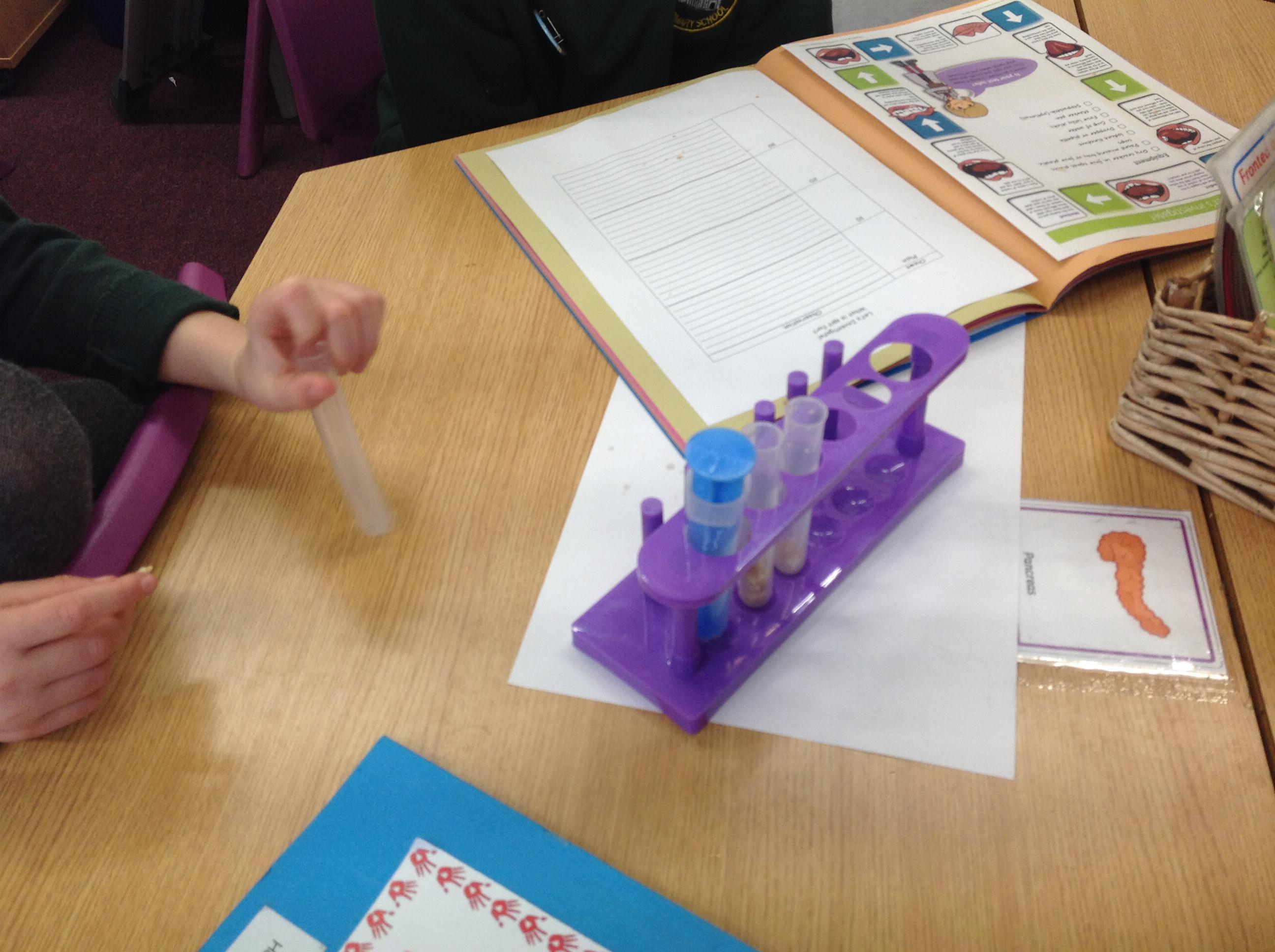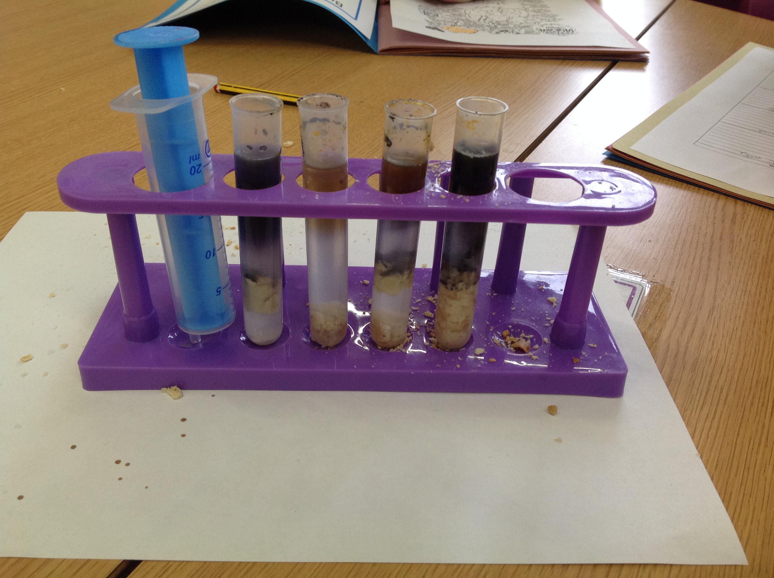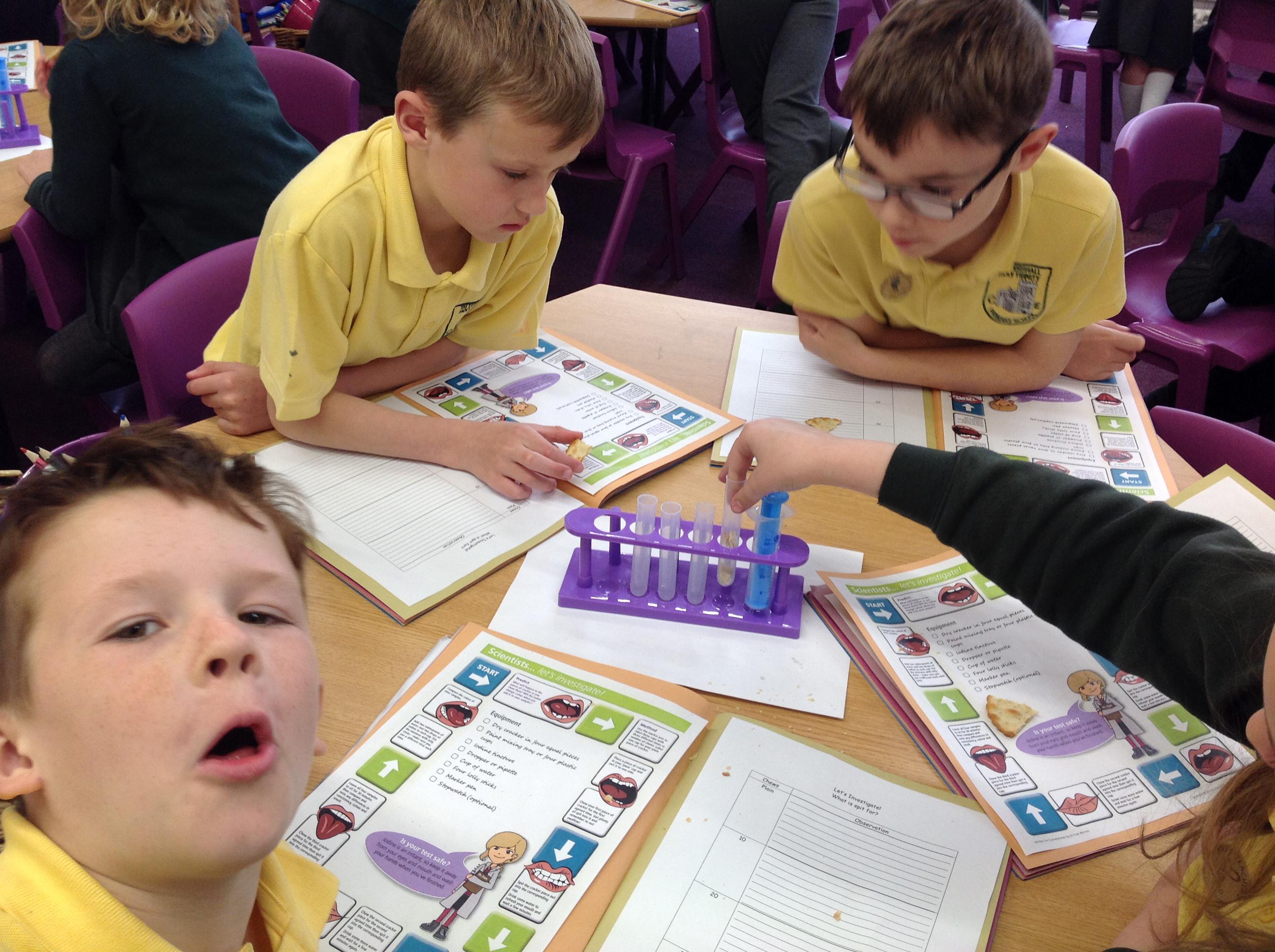 We've investigated what spit is for this afternoon. We discussed that salvia is made up of 99% water, and then enzymes, mucus and electrolytes. We discussed how the enzymes start to break down the starch in foods to start the digestion process. We had to chew crackers for different intervals, mix them with water and then use iodine to make a chemical reaction. The darker the colour, the more starch in the test tube!