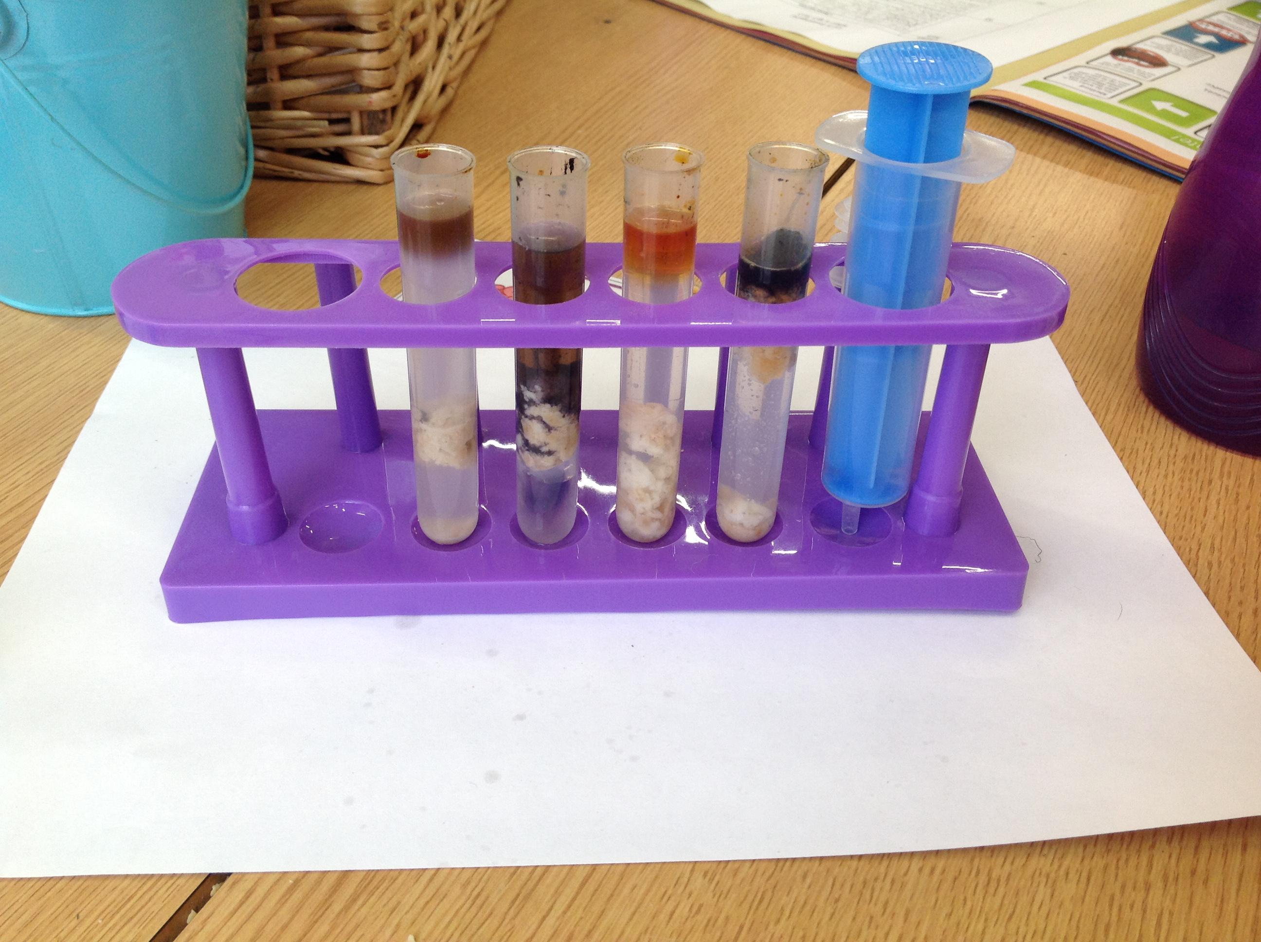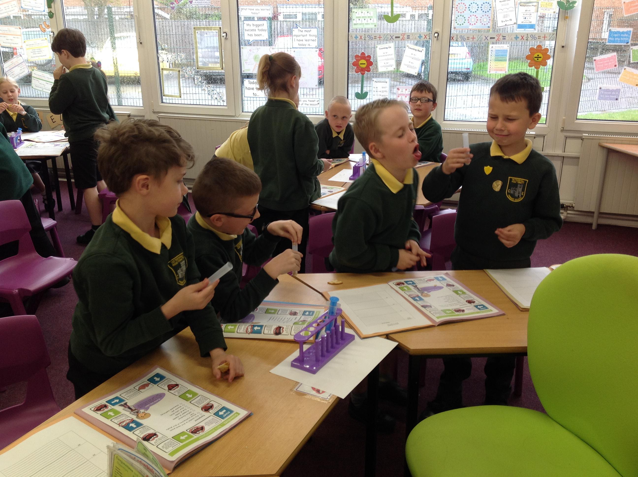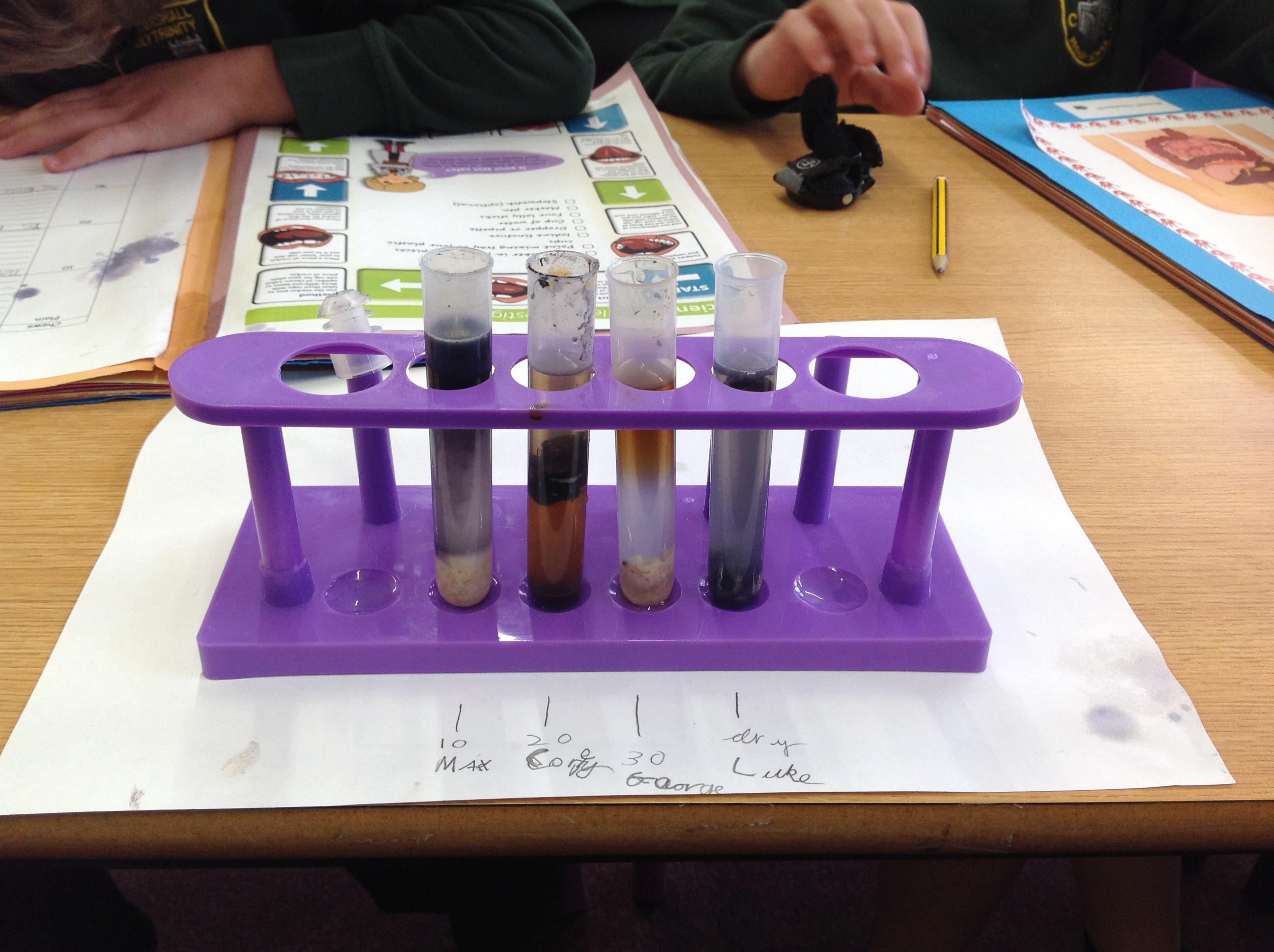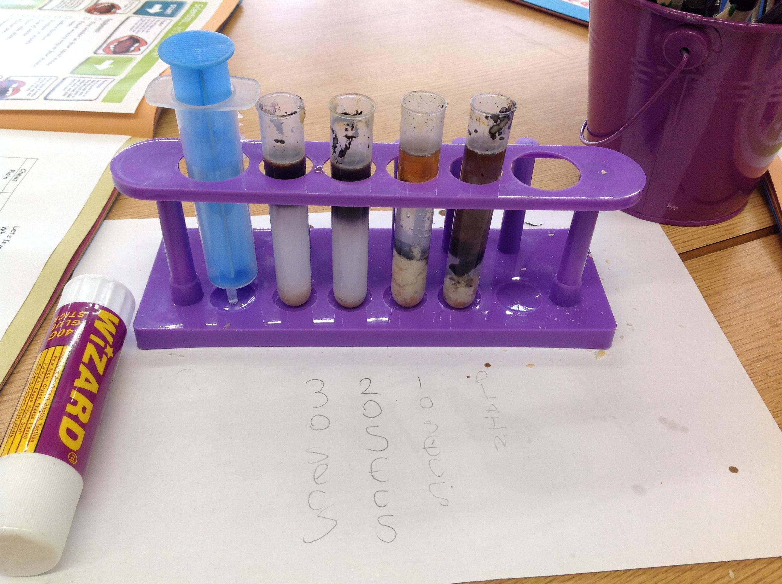 We've investigated what spit is for this afternoon. We discussed that salvia is made up of 99% water, and then enzymes, mucus and electrolytes. We discussed how the enzymes start to break down the starch in foods to start the digestion process. We had to chew crackers for different intervals, mix them with water and then use iodine to make a chemical reaction. The darker the colour, the more starch in the test tube!