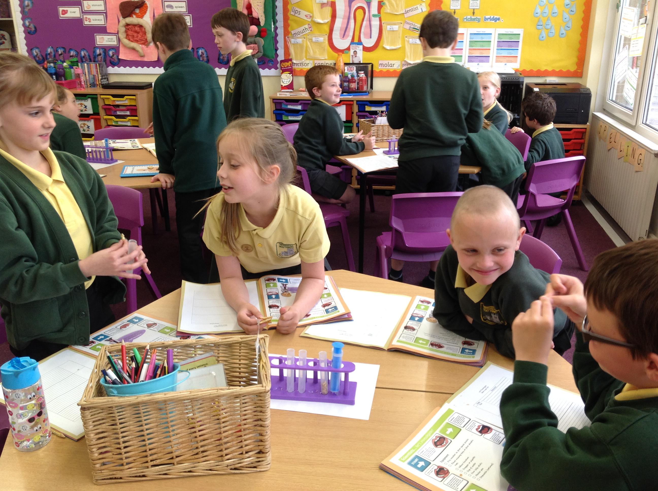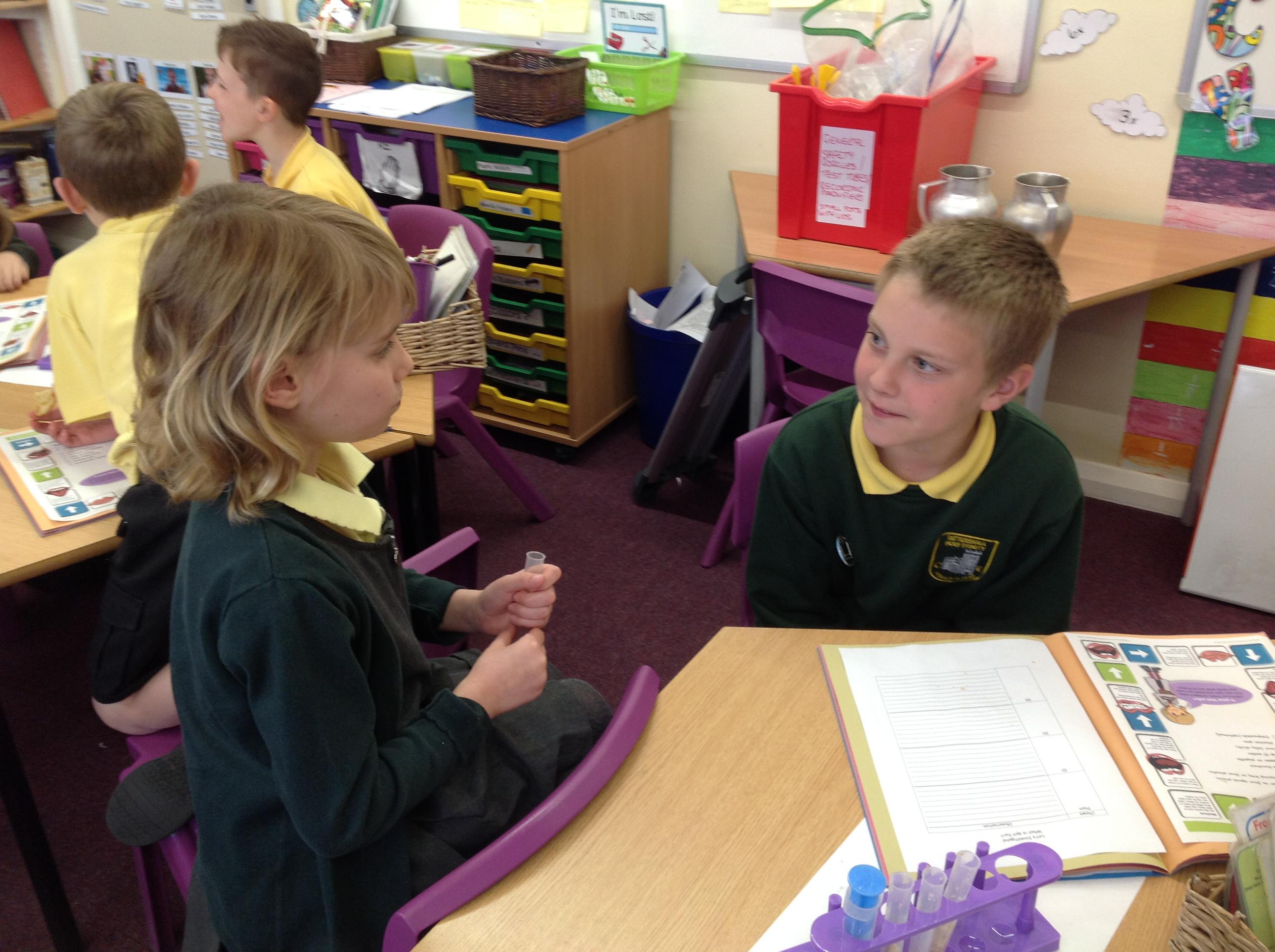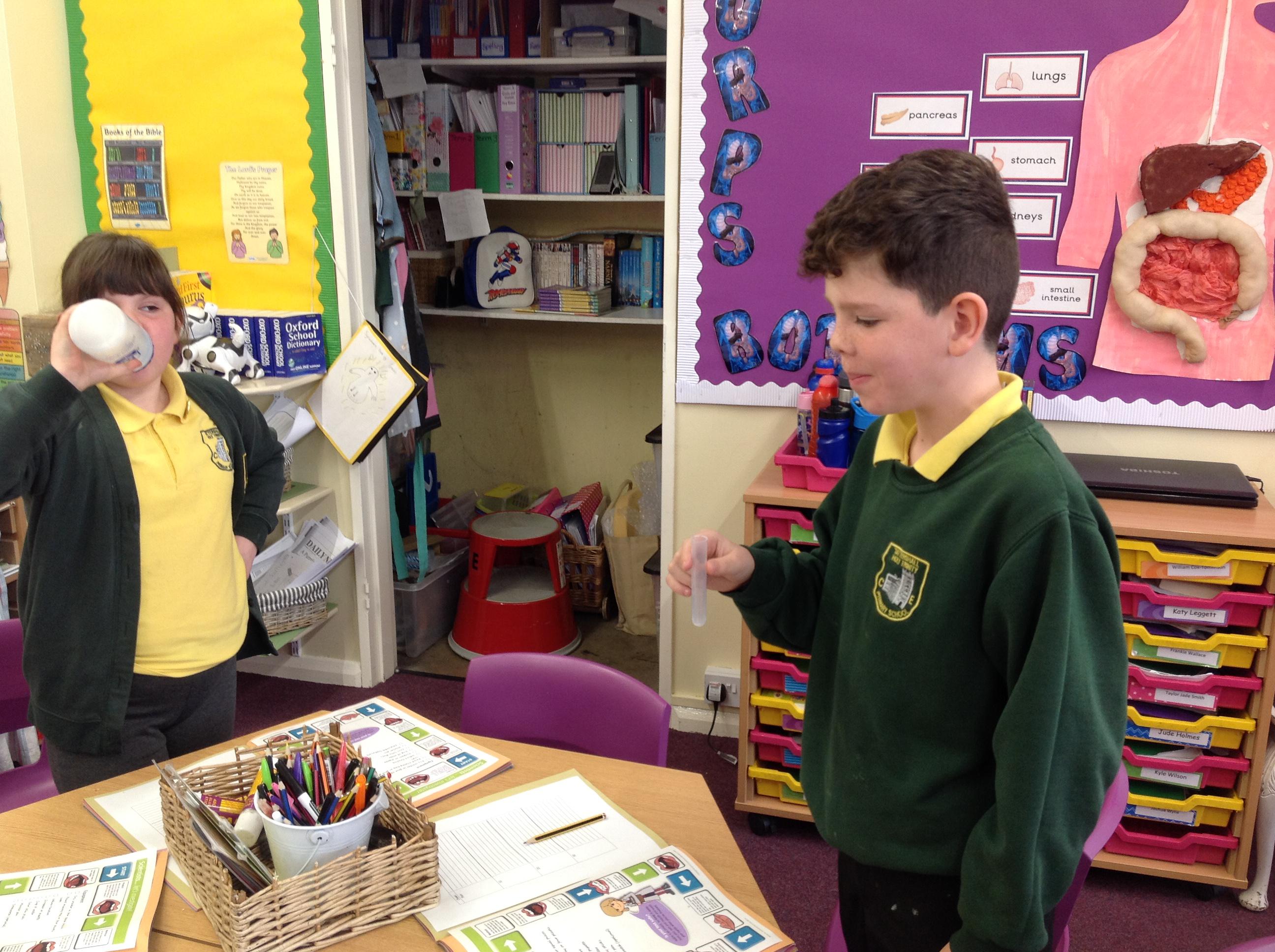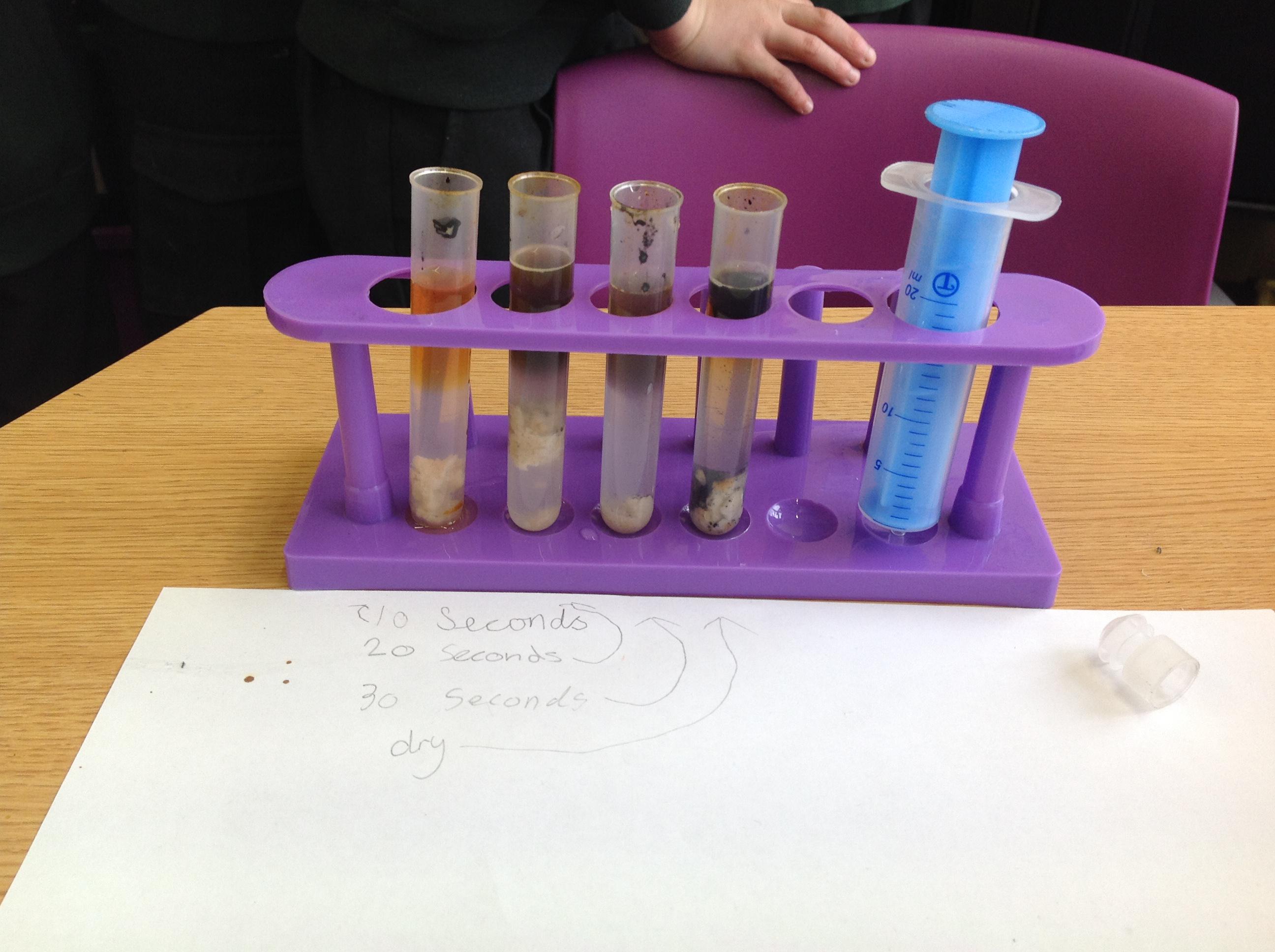 We've investigated what spit is for this afternoon. We discussed that salvia is made up of 99% water, and then enzymes, mucus and electrolytes. We discussed how the enzymes start to break down the starch in foods to start the digestion process. We had to chew crackers for different intervals, mix them with water and then use iodine to make a chemical reaction. The darker the colour, the more starch in the test tube!
