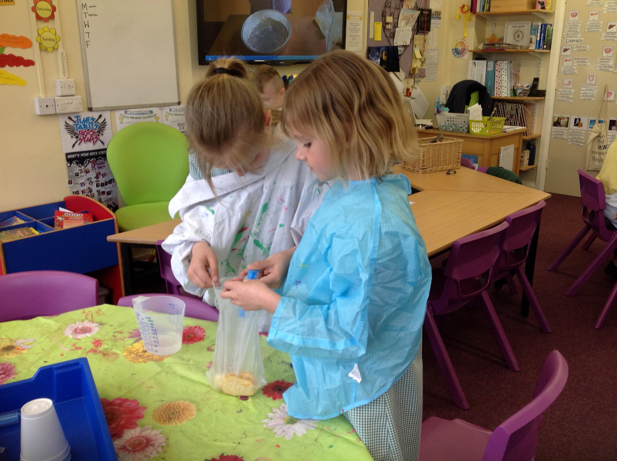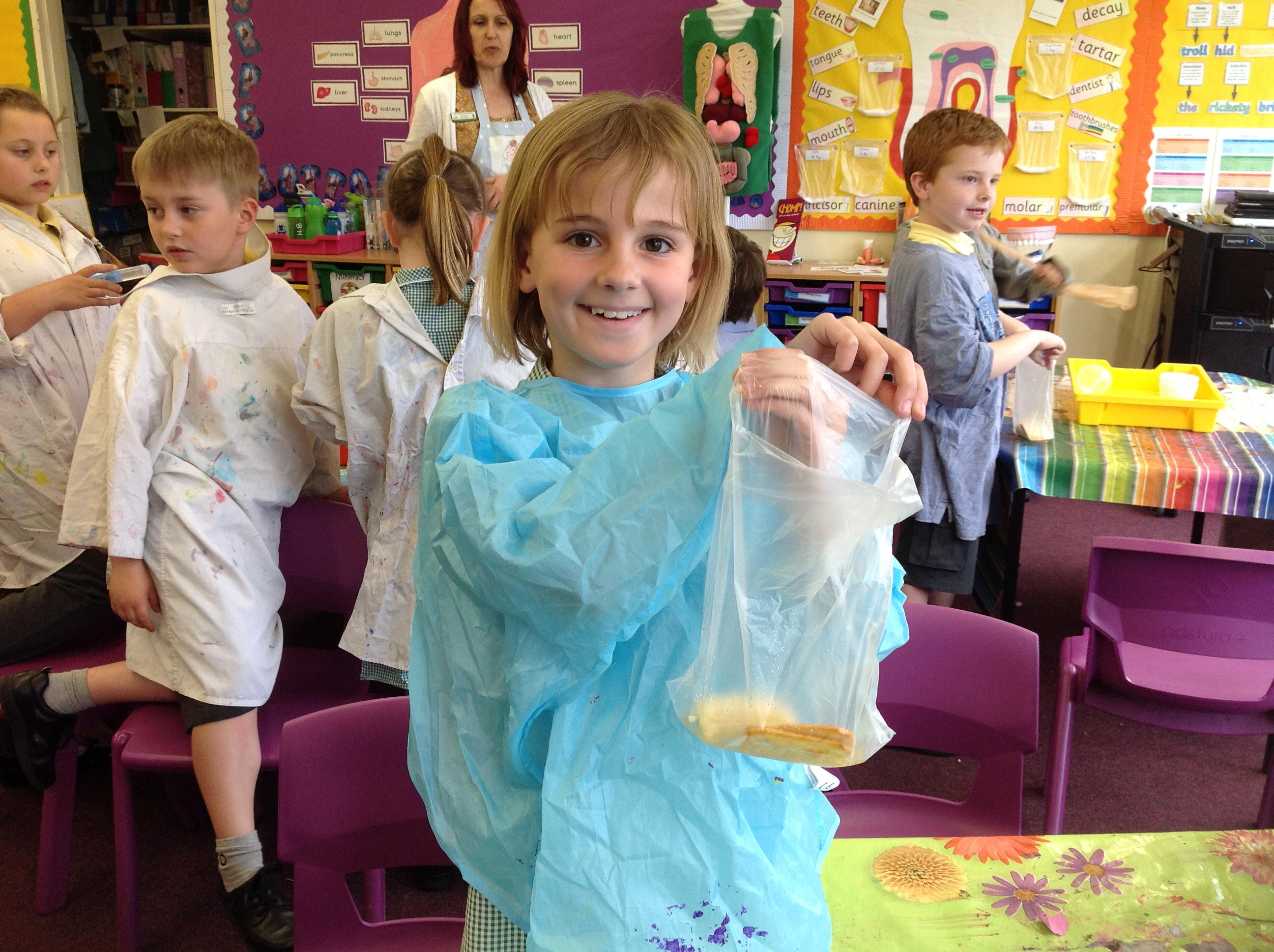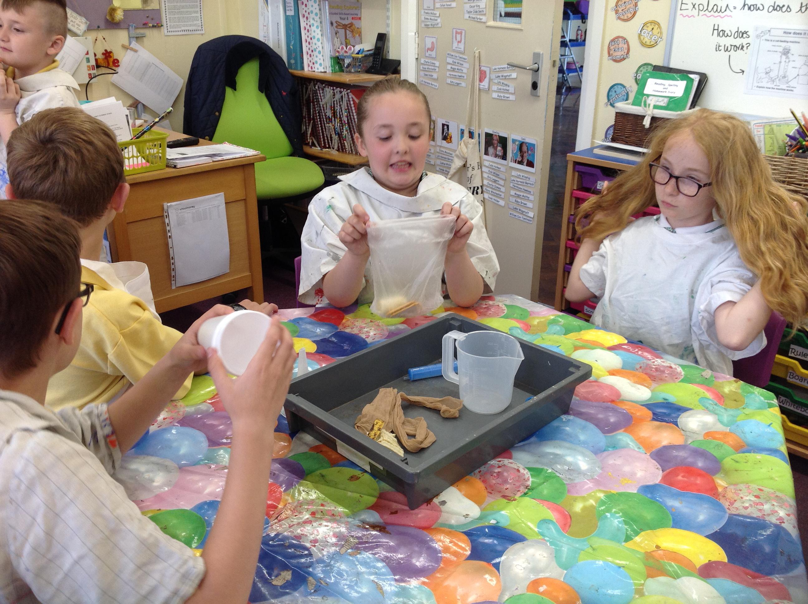 We created our own mini digestive system today! We started by mushing banana, crackers, water and vinegar together in a plastic bag to act as the stomach. The vinegar was like the stomach acid breaking down the food. Then we transferred it to a pair of tights to be the small intestines. Once the nutrients (liquids) had been squeezed out, the left over indigestible food went into the cup, and then imitated going to the loo!