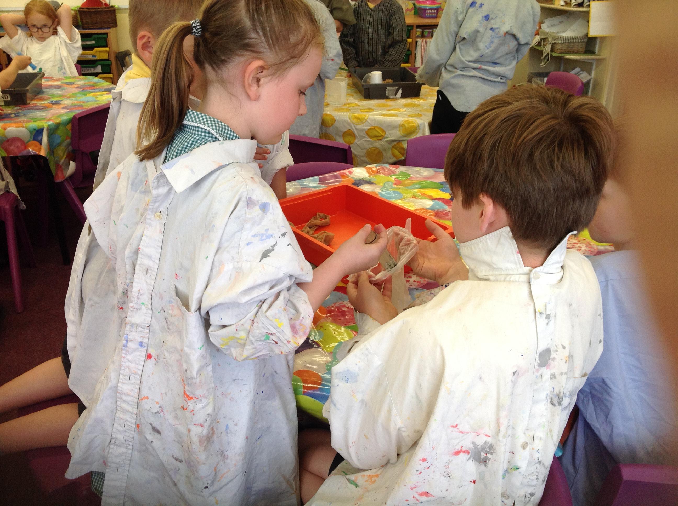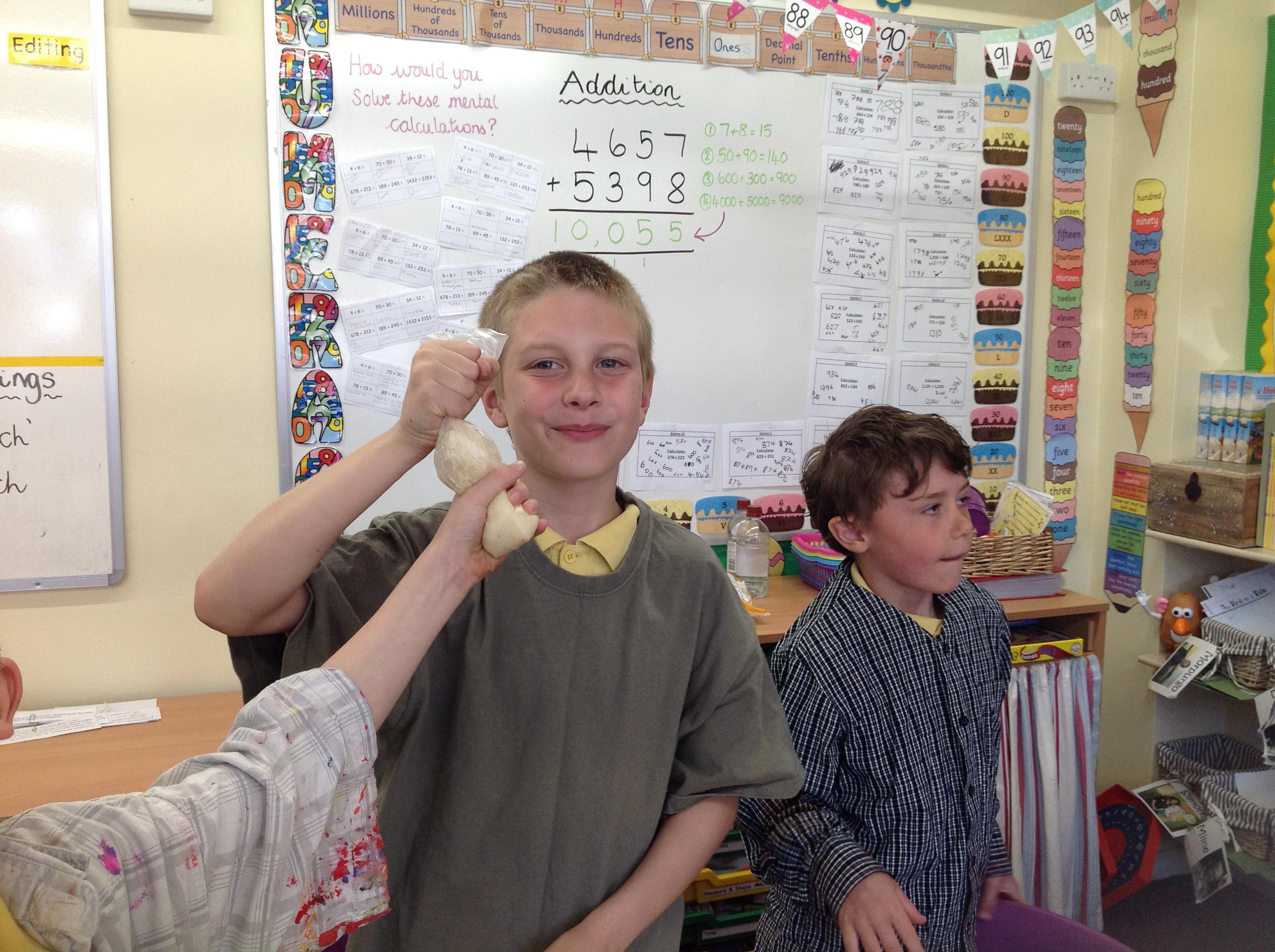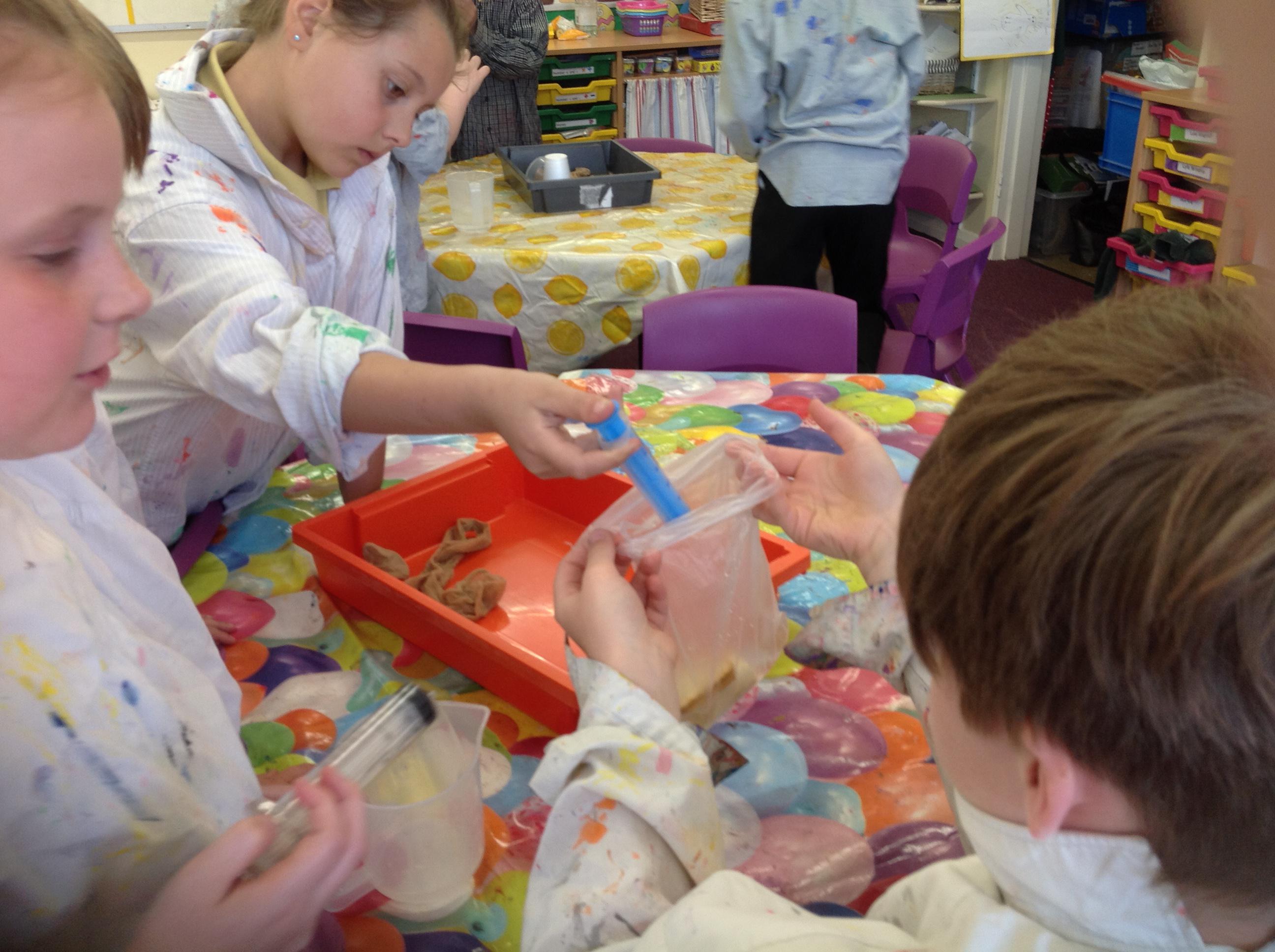We created our own mini digestive system today! We started by mushing banana, crackers, water and vinegar together in a plastic bag to act as the stomach. The vinegar was like the stomach acid breaking down the food. Then we transferred it to a pair of tights to be the small intestines. Once the nutrients (liquids) had been squeezed out, the left over indigestible food went into the cup, and then imitated going to the loo!