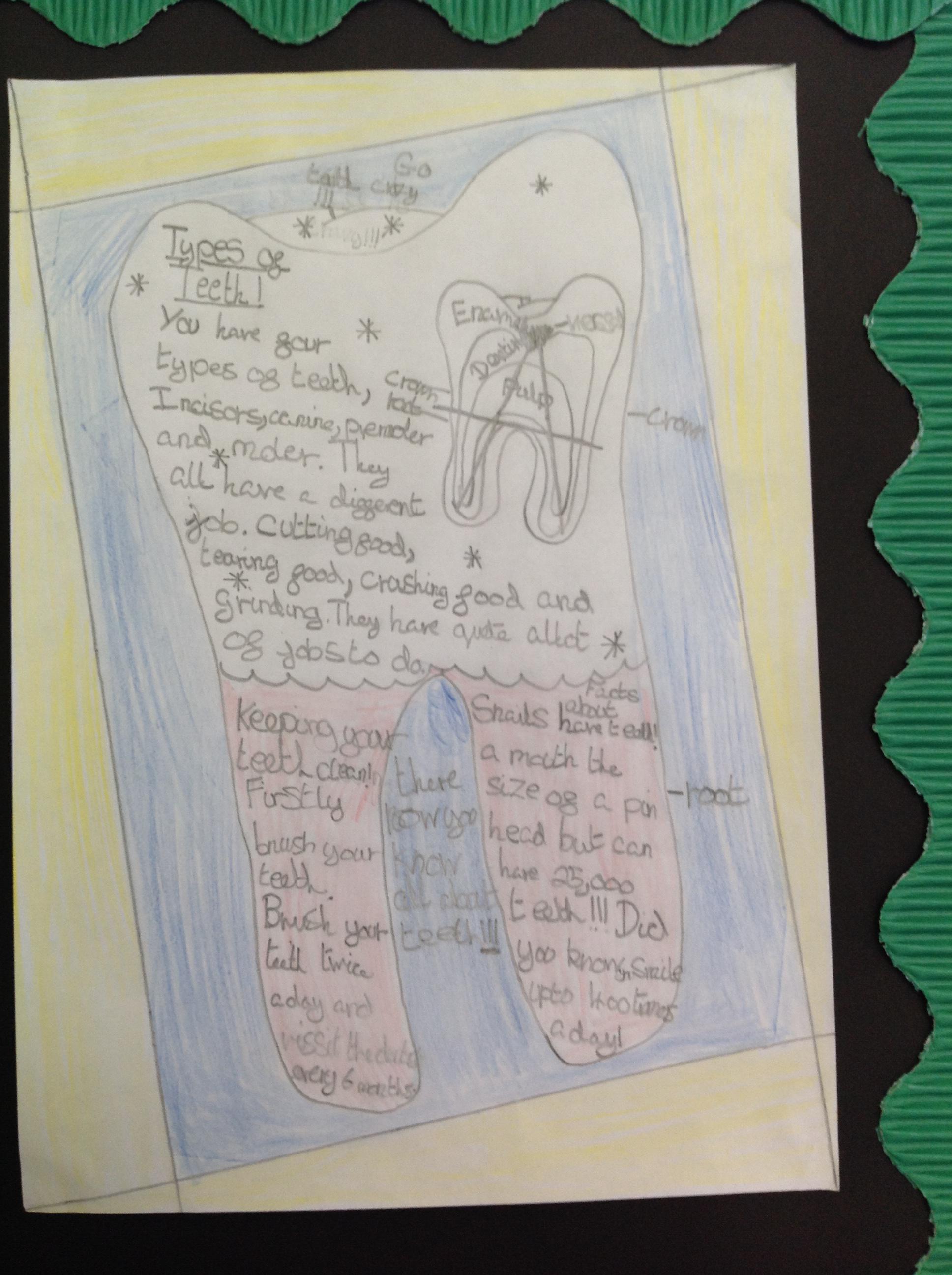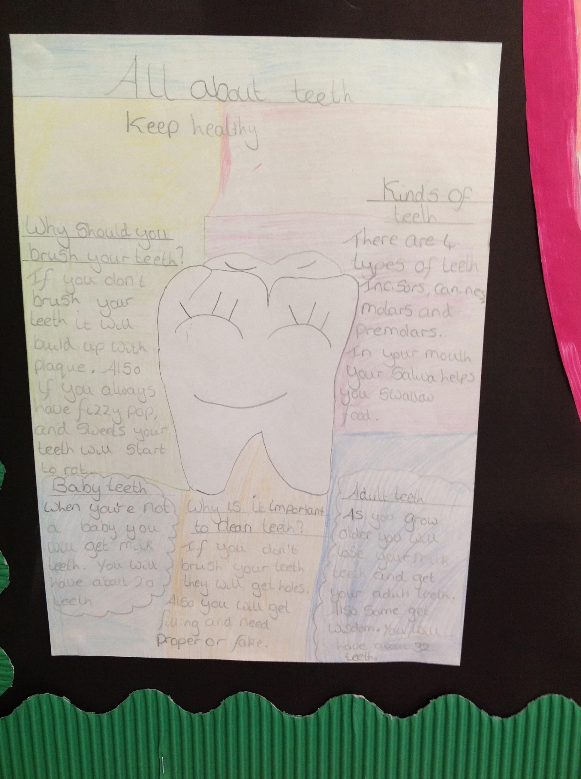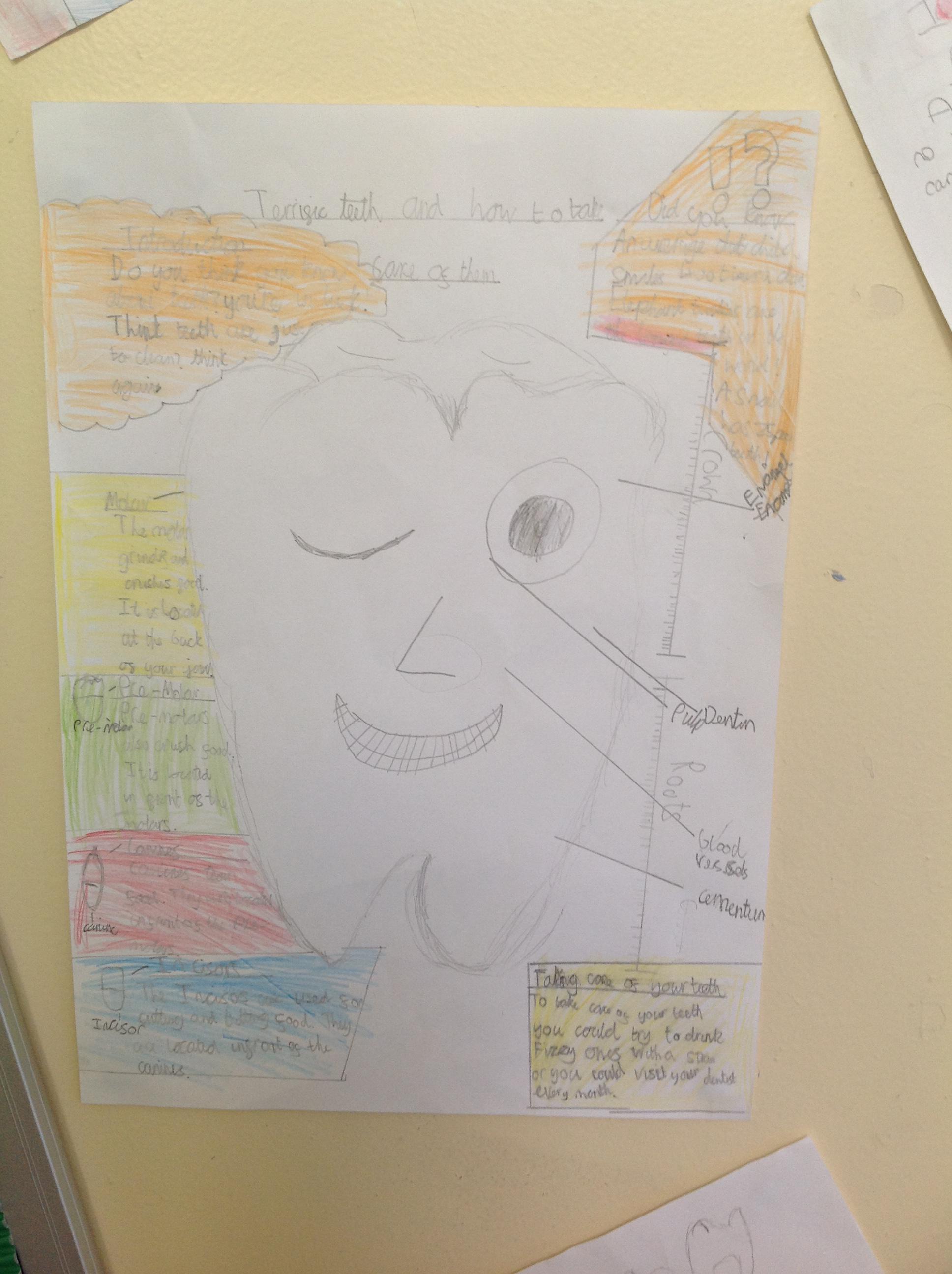 In English, we've been using our topic knowledge to design a factfile full of information all about teeth. We had to think about subheadings and linking our facts to the title. We also had to think about using factual diagrams and labelling them correctly.