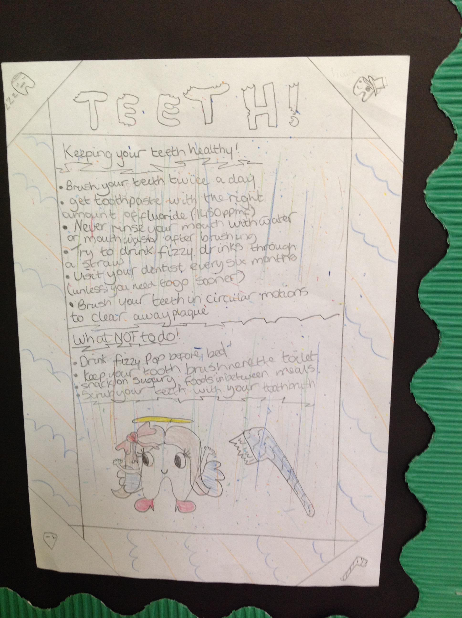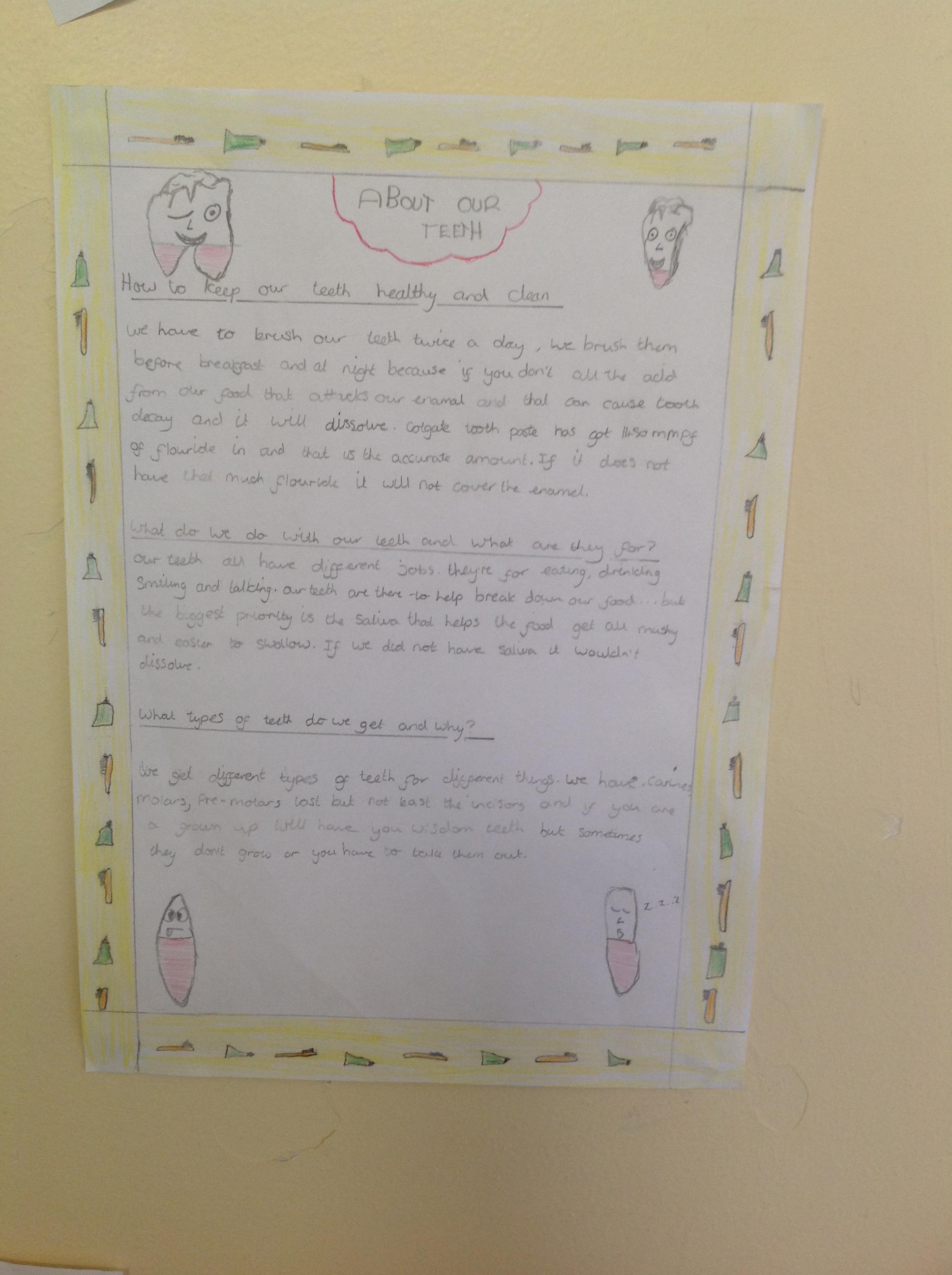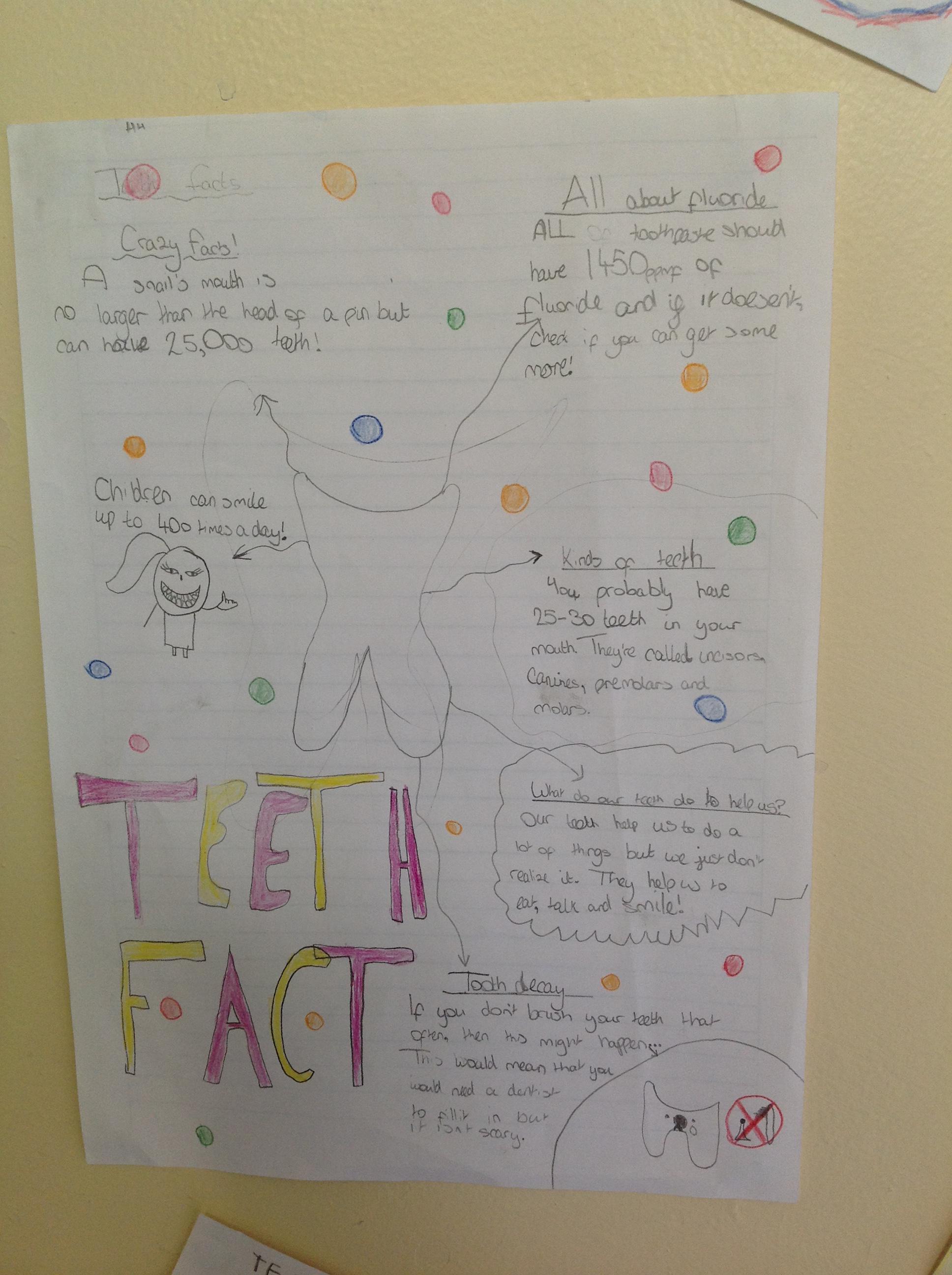 In English, we've been using our topic knowledge to design a factfile full of information all about teeth. We had to think about subheadings and linking our facts to the title. We also had to think about using factual diagrams and labelling them correctly.