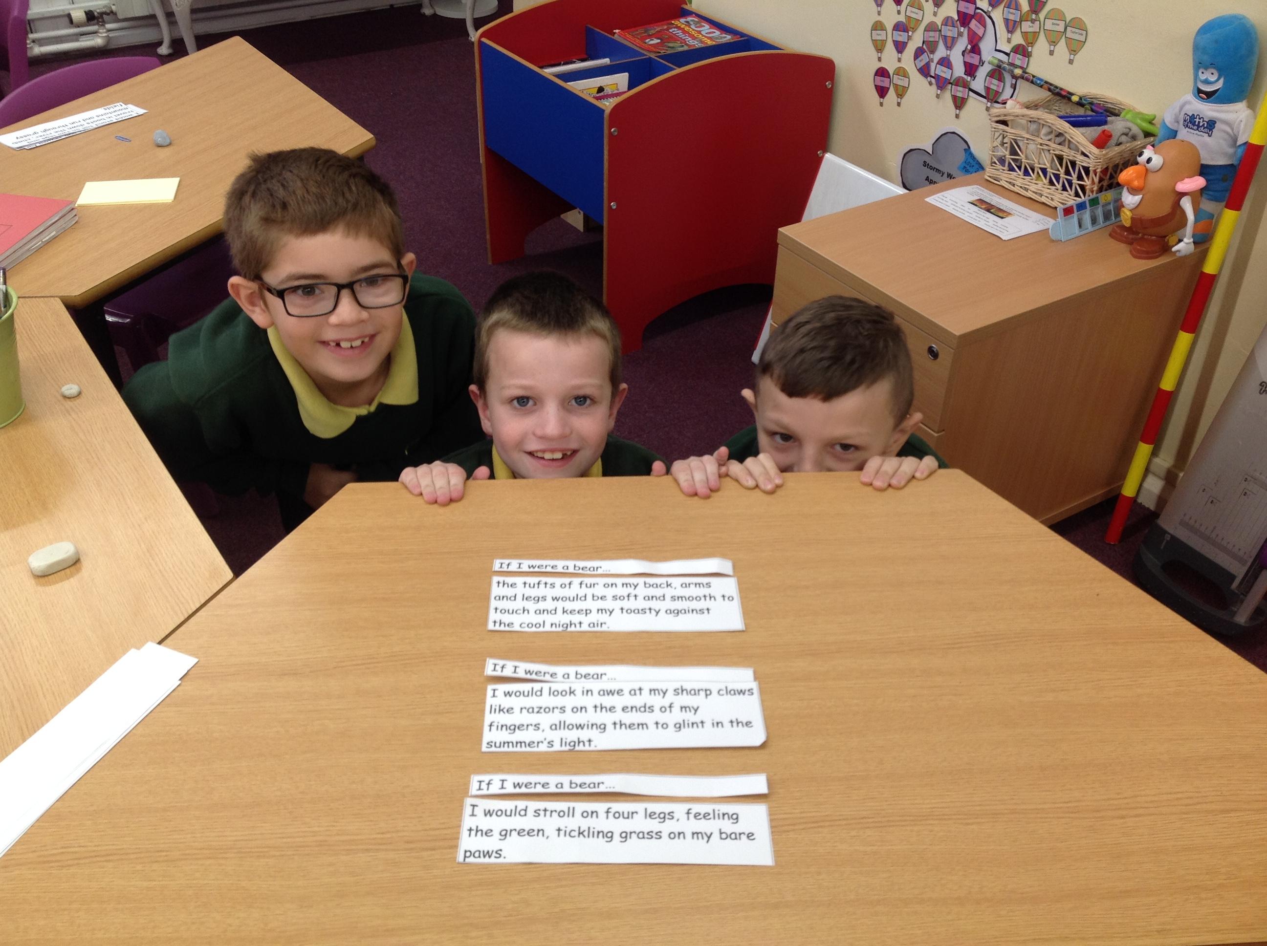 We've been using Brother Bear to write some poetry imagining what it would be like if we were a Bear! This group chose appropriate sentences for their poem and then put them in an order that sounded good! We can't wait to read their final copies!