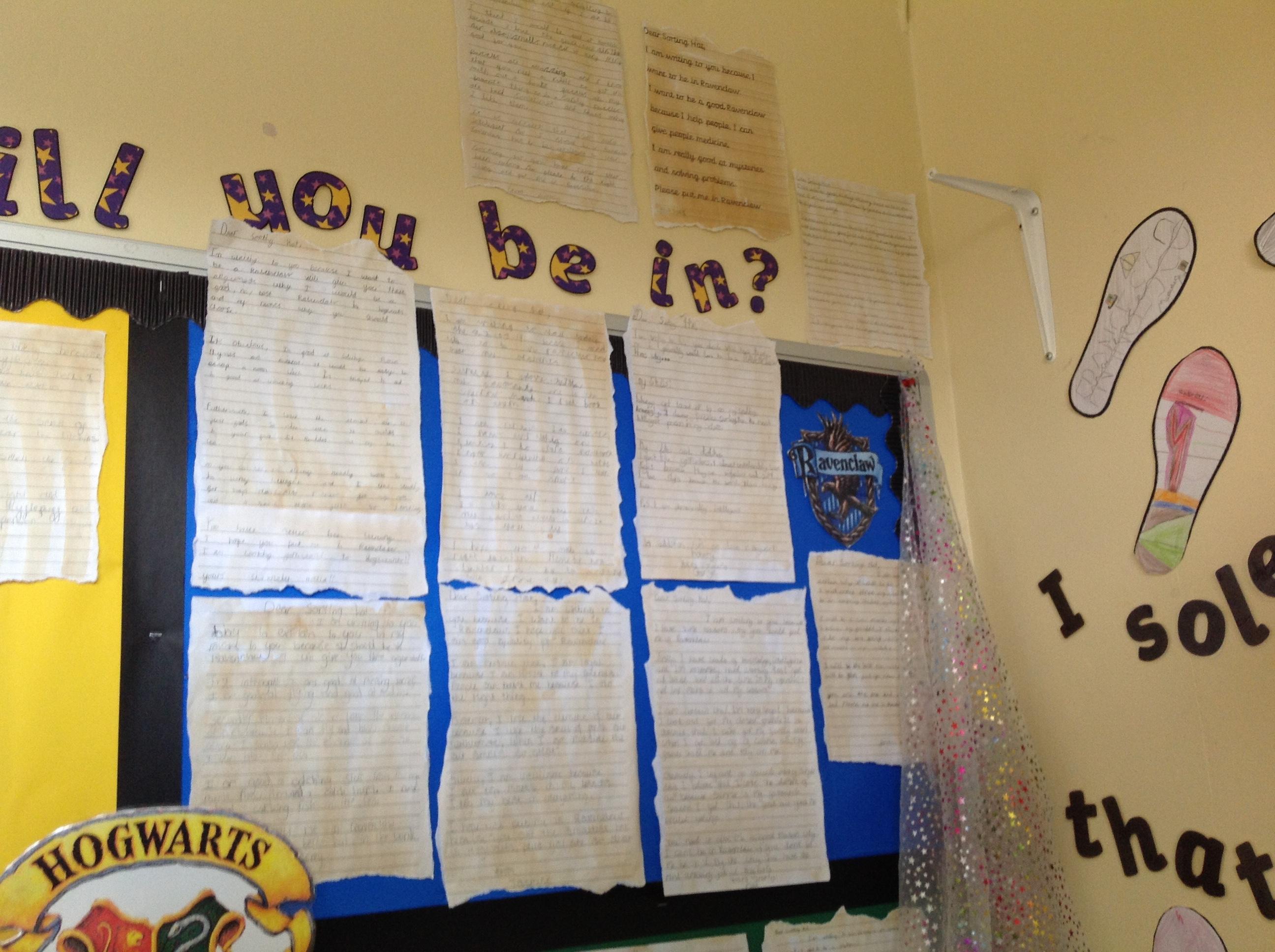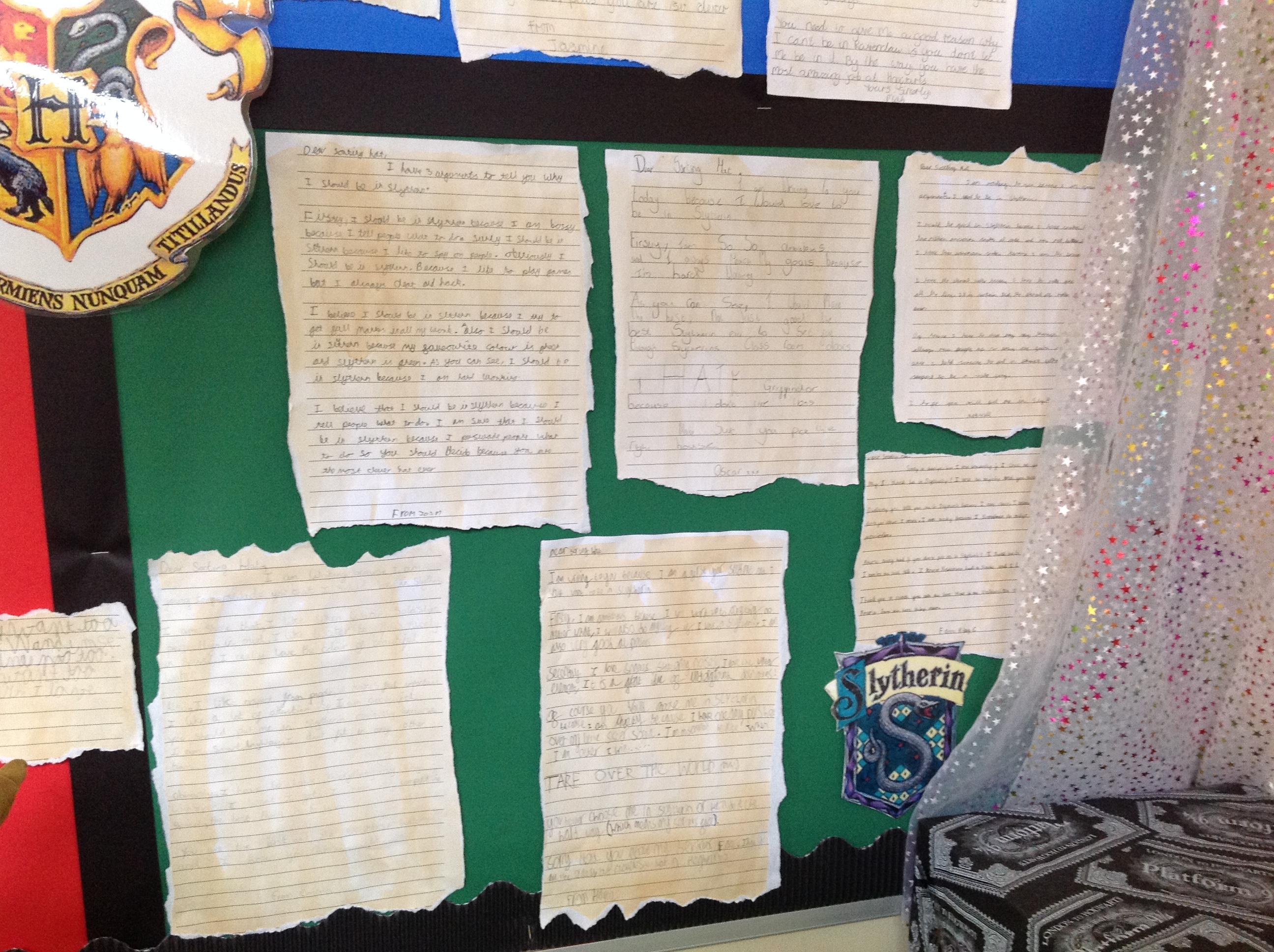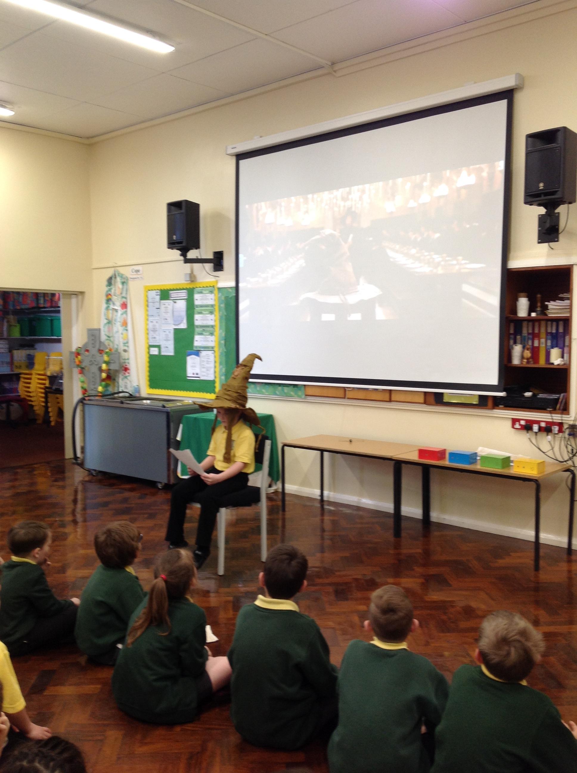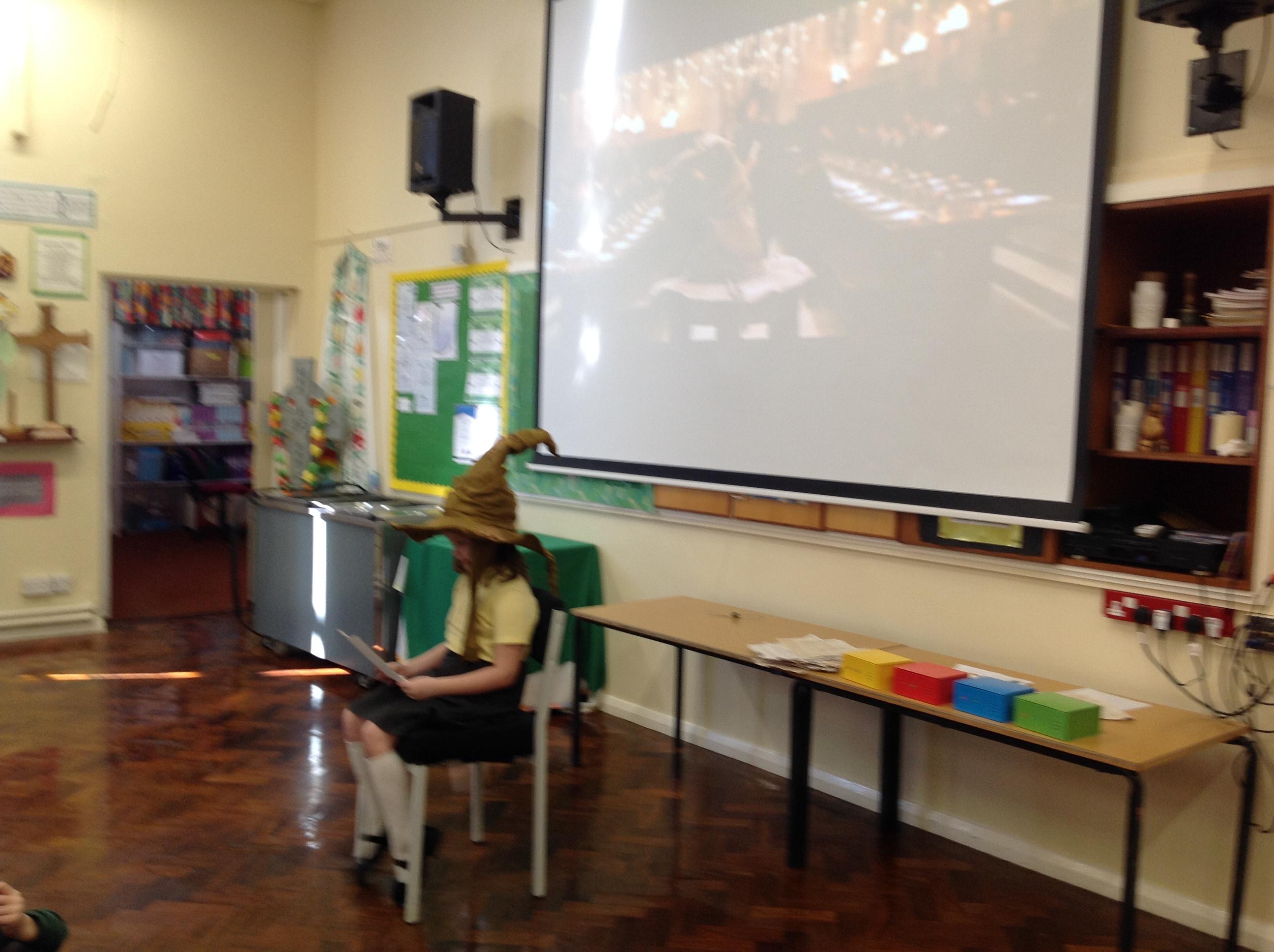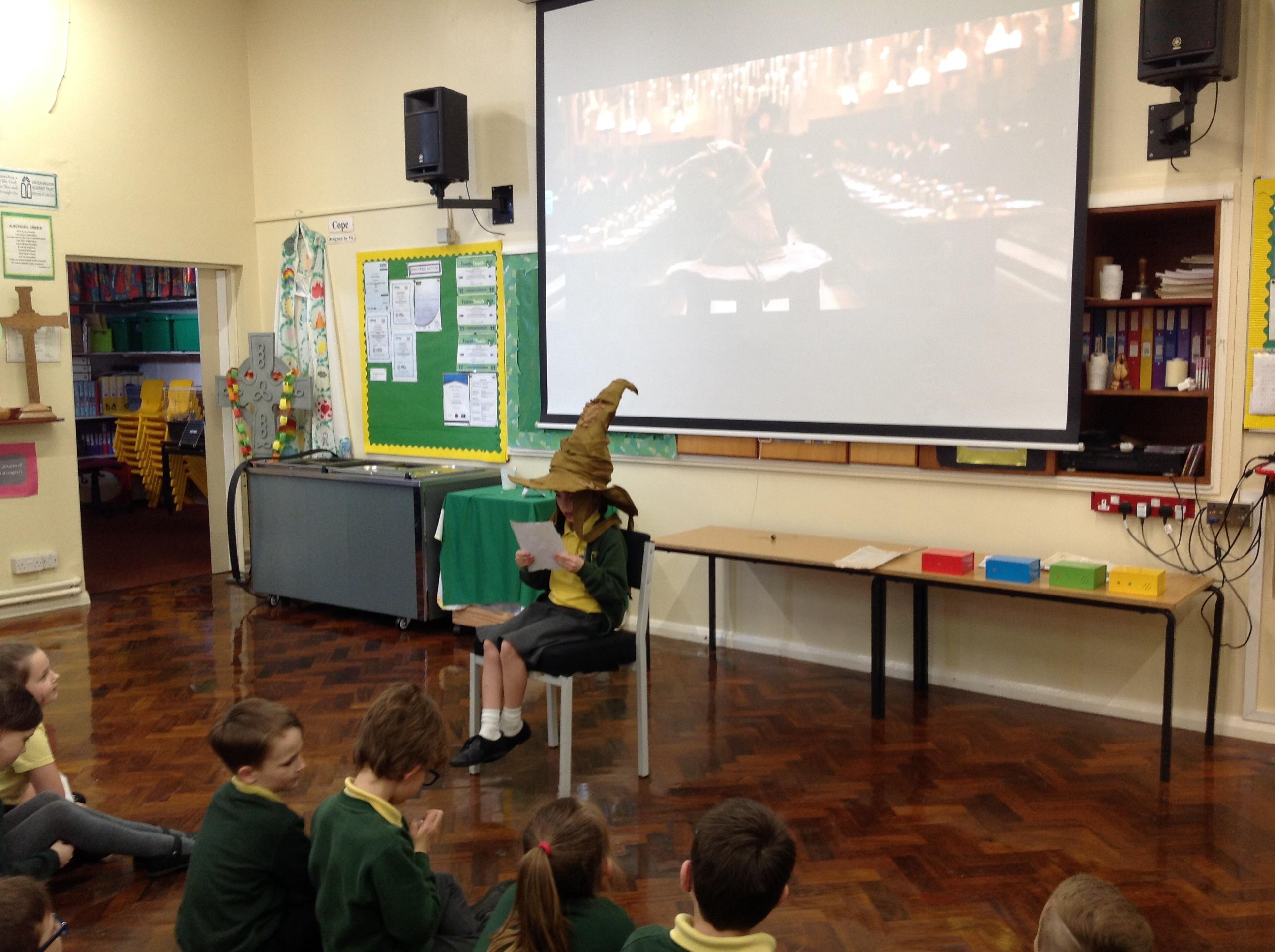 This week, we have been looking at persuasive writing techniques and we have written to the Sorting Hat to persuade them to put us in a certain house. This afternoon, we had a Sorting Ceremony of our own! We all got to wear the Sorting Hat and read our letters...and then we were sorted into our chosen house! We get to wear a new badge for the rest of the topic showing which house we are in!