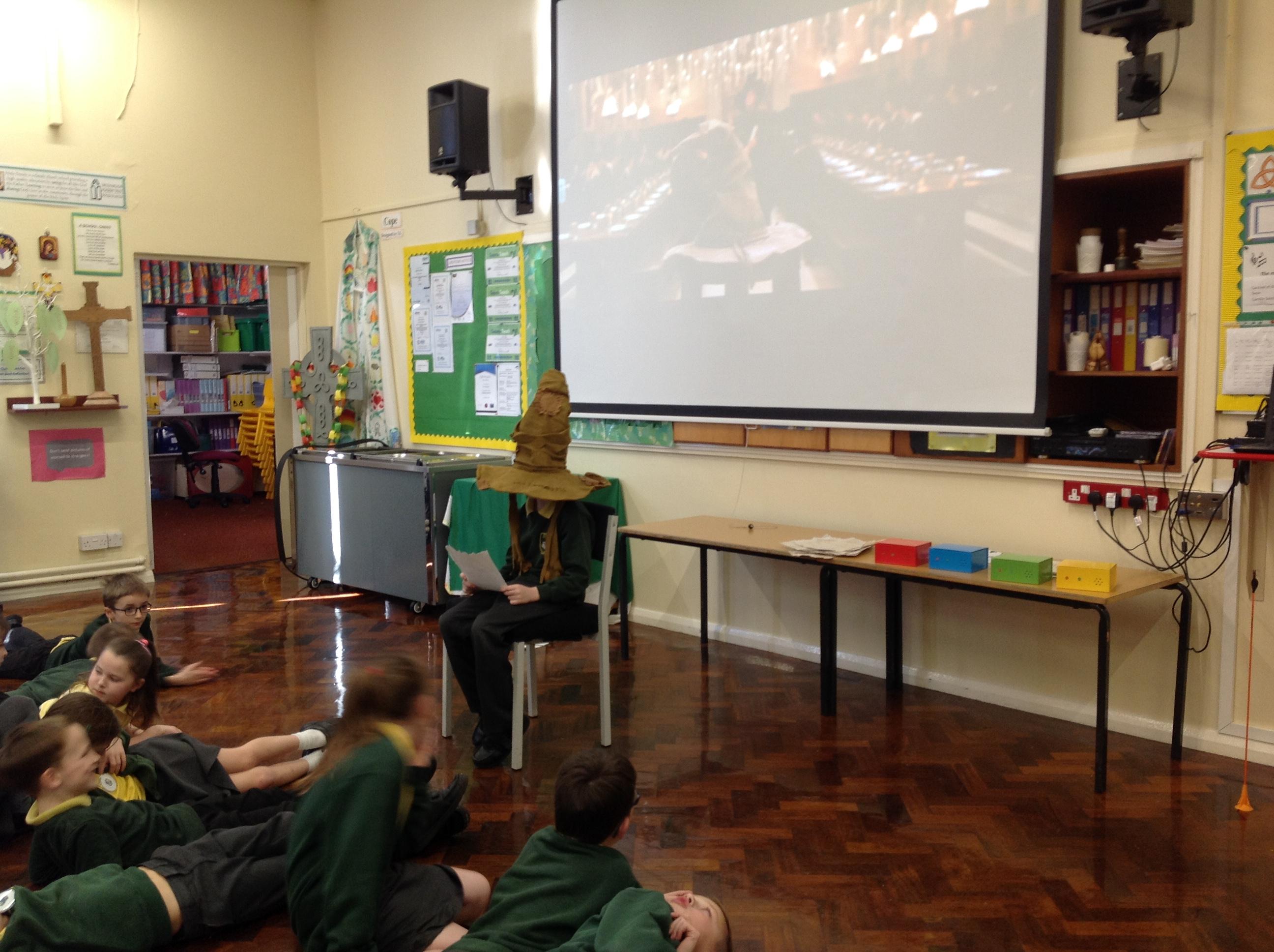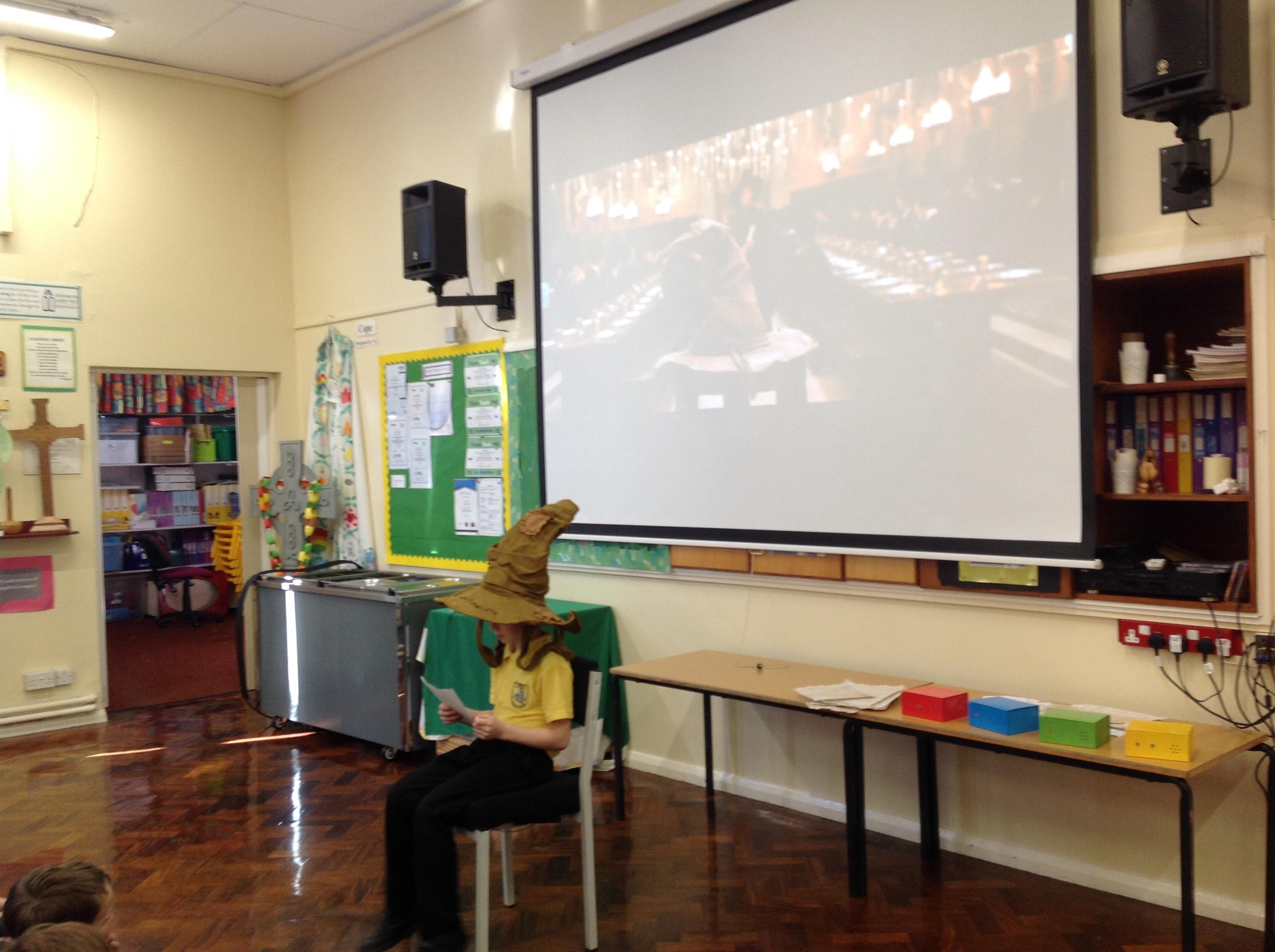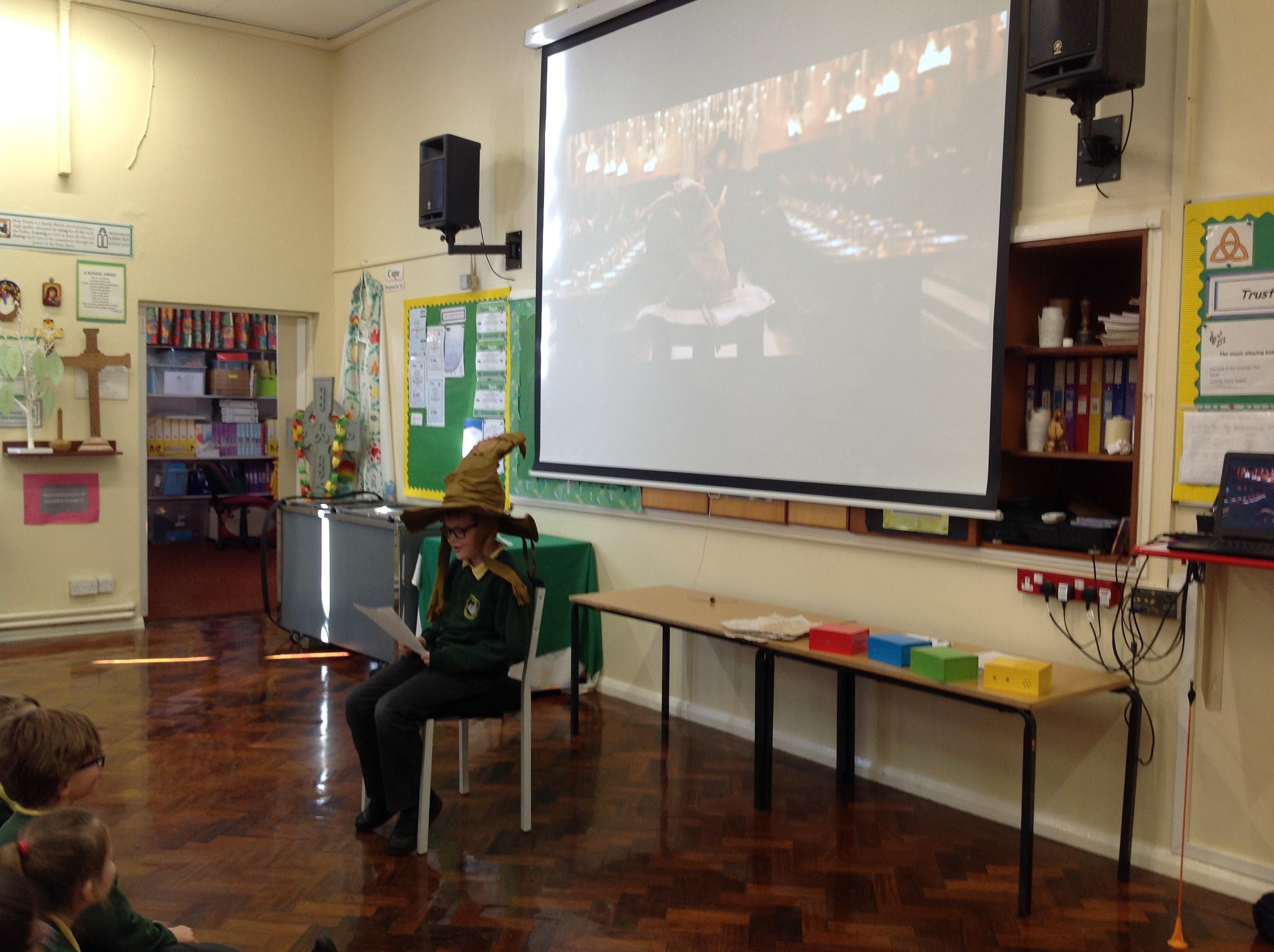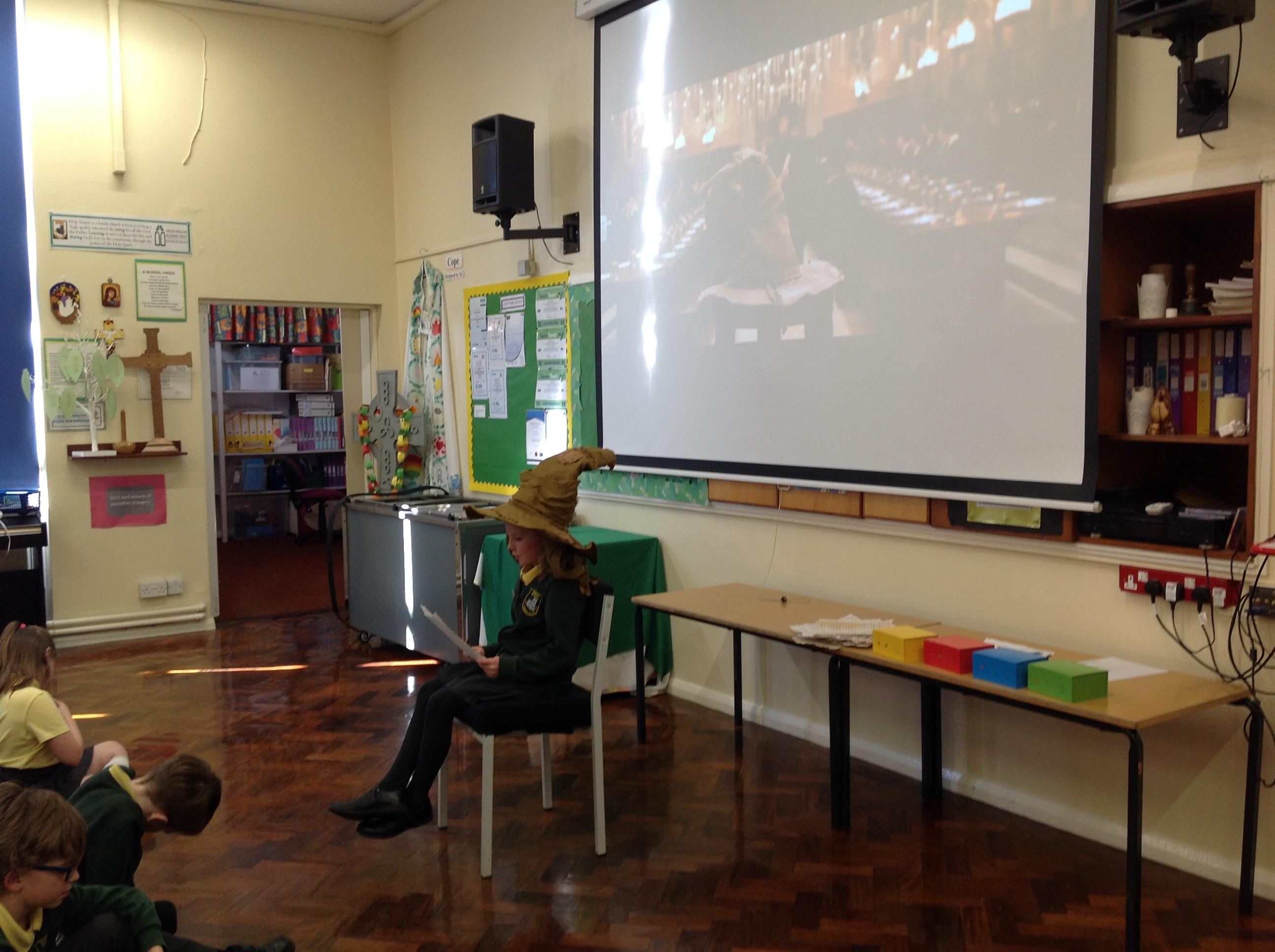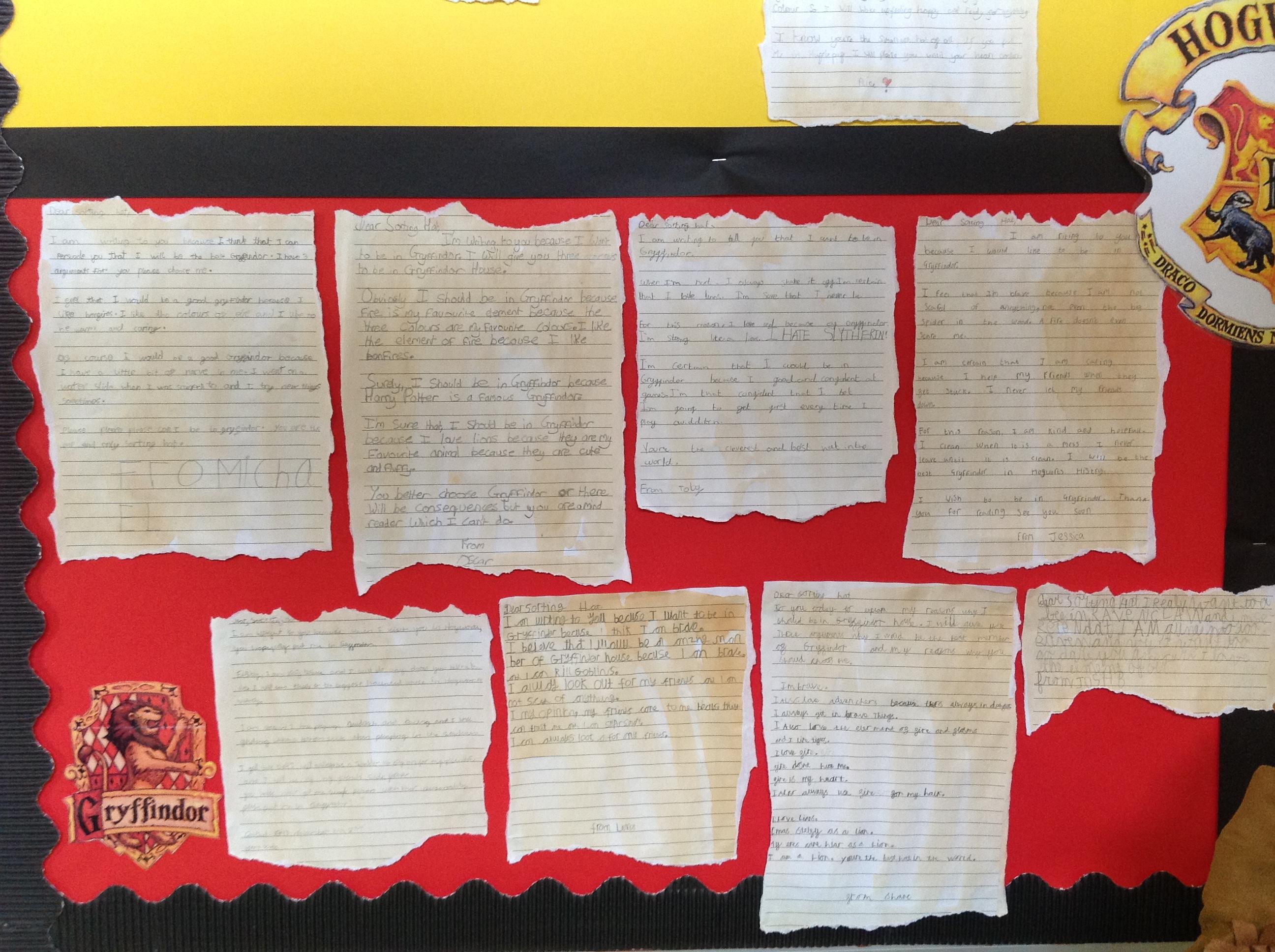 This week, we have been looking at persuasive writing techniques and we have written to the Sorting Hat to persuade them to put us in a certain house. This afternoon, we had a Sorting Ceremony of our own! We all got to wear the Sorting Hat and read our letters...and then we were sorted into our chosen house! We get to wear a new badge for the rest of the topic showing which house we are in!