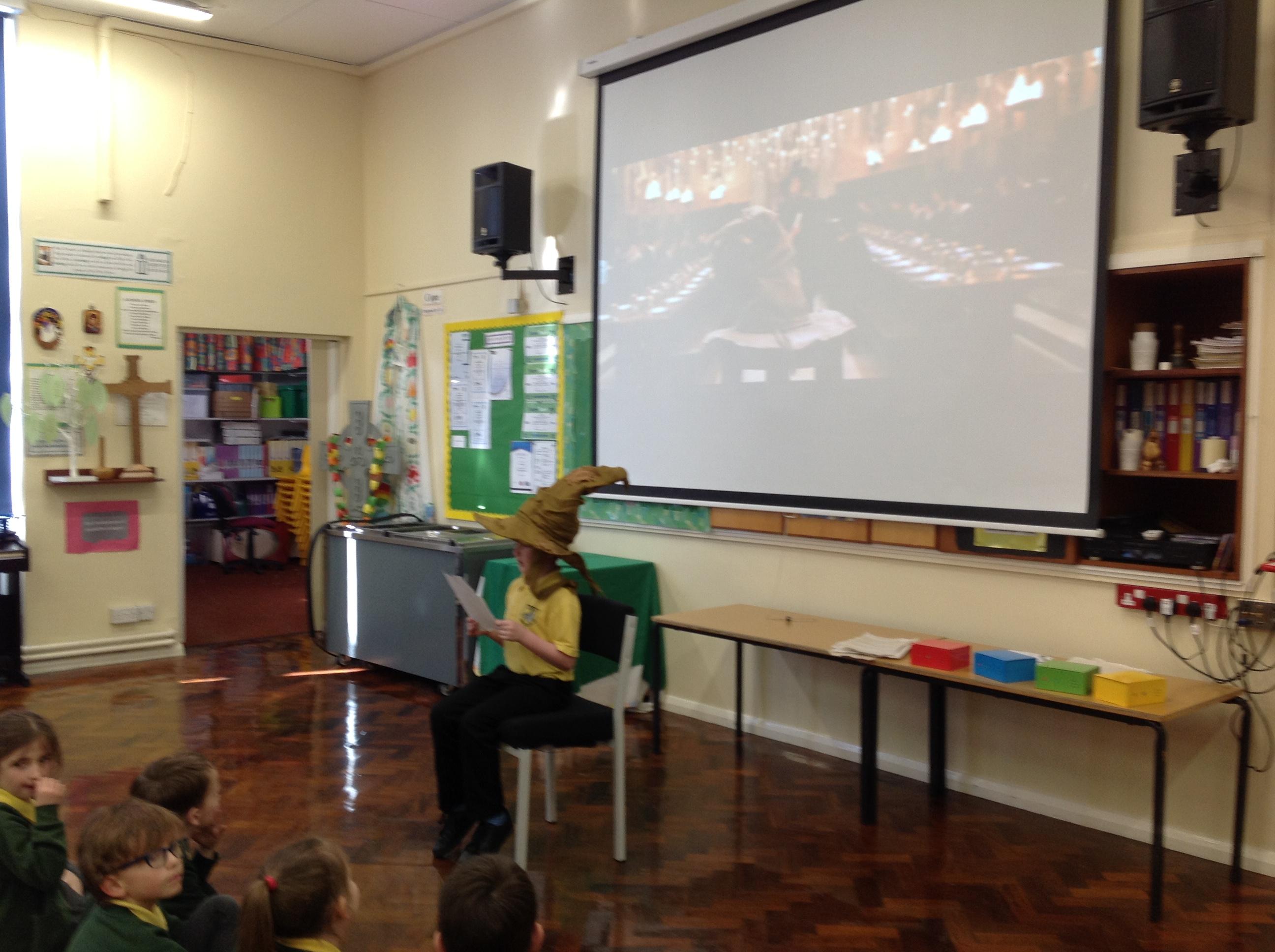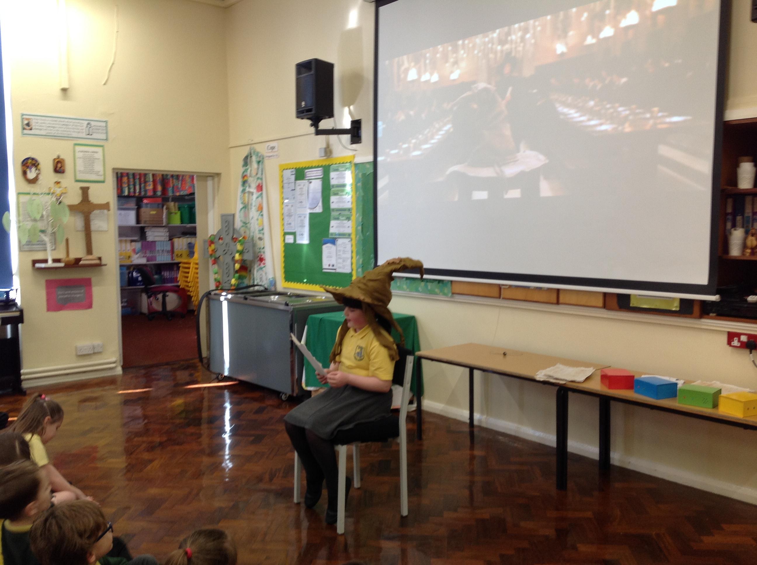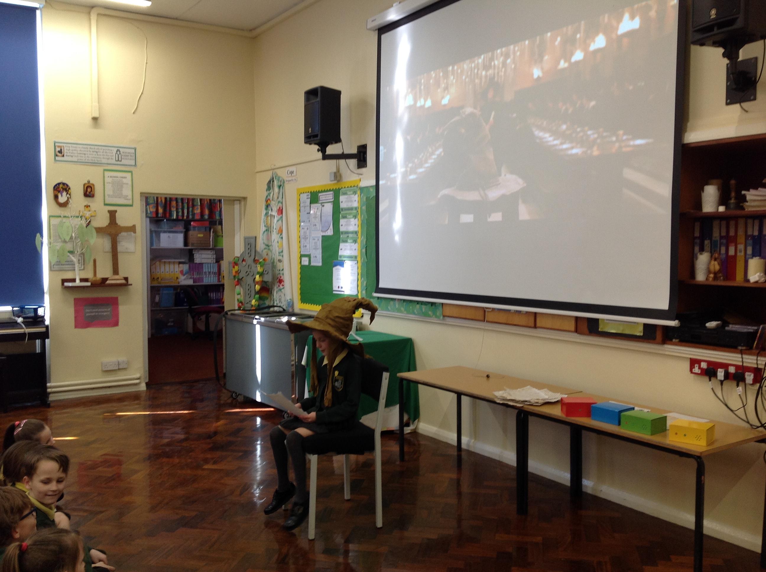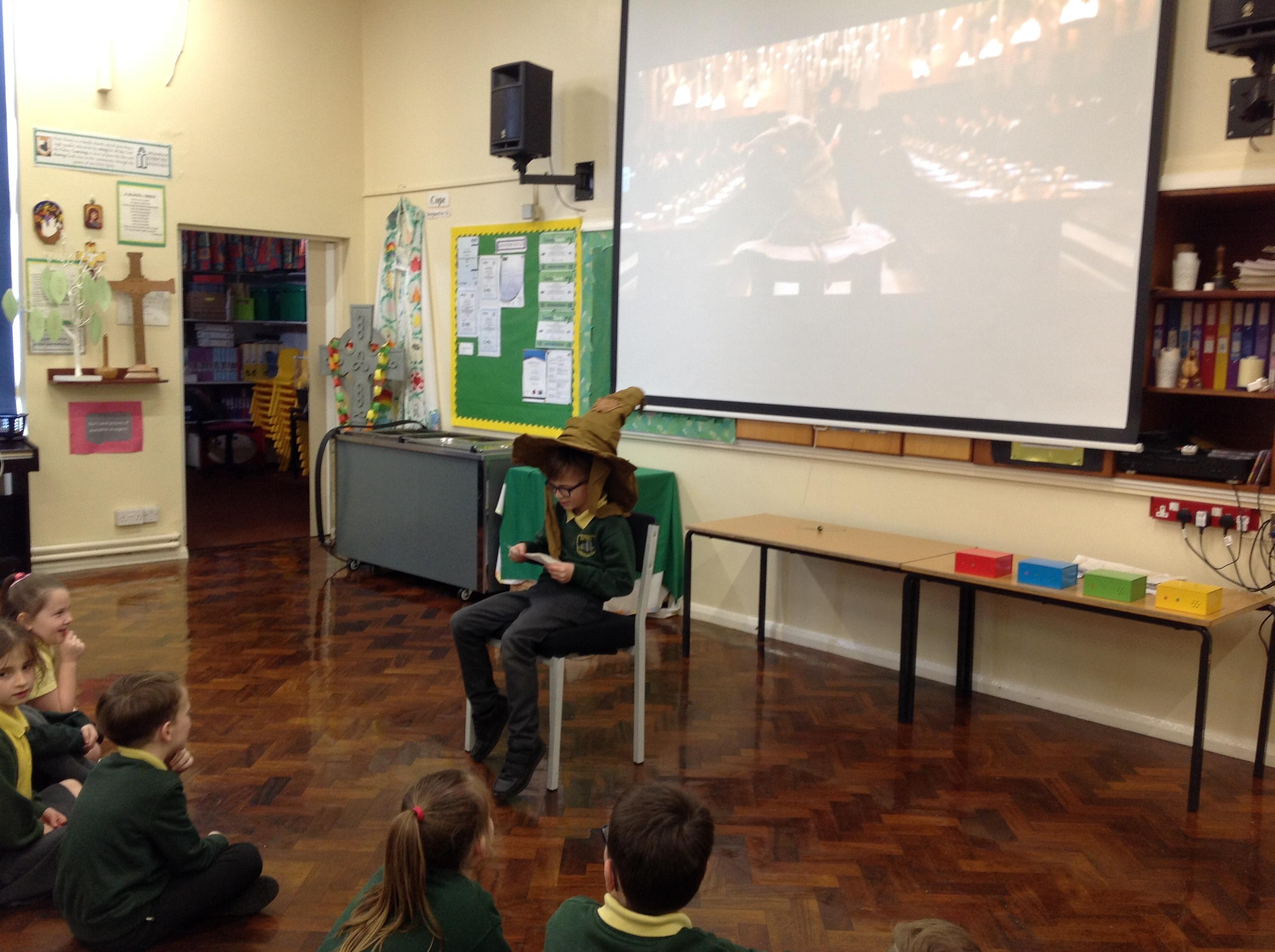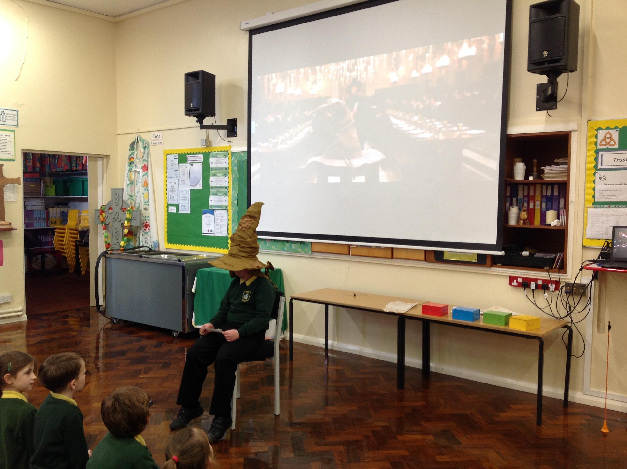This week, we have been looking at persuasive writing techniques and we have written to the Sorting Hat to persuade them to put us in a certain house. This afternoon, we had a Sorting Ceremony of our own! We all got to wear the Sorting Hat and read our letters...and then we were sorted into our chosen house! We get to wear a new badge for the rest of the topic showing which house we are in!