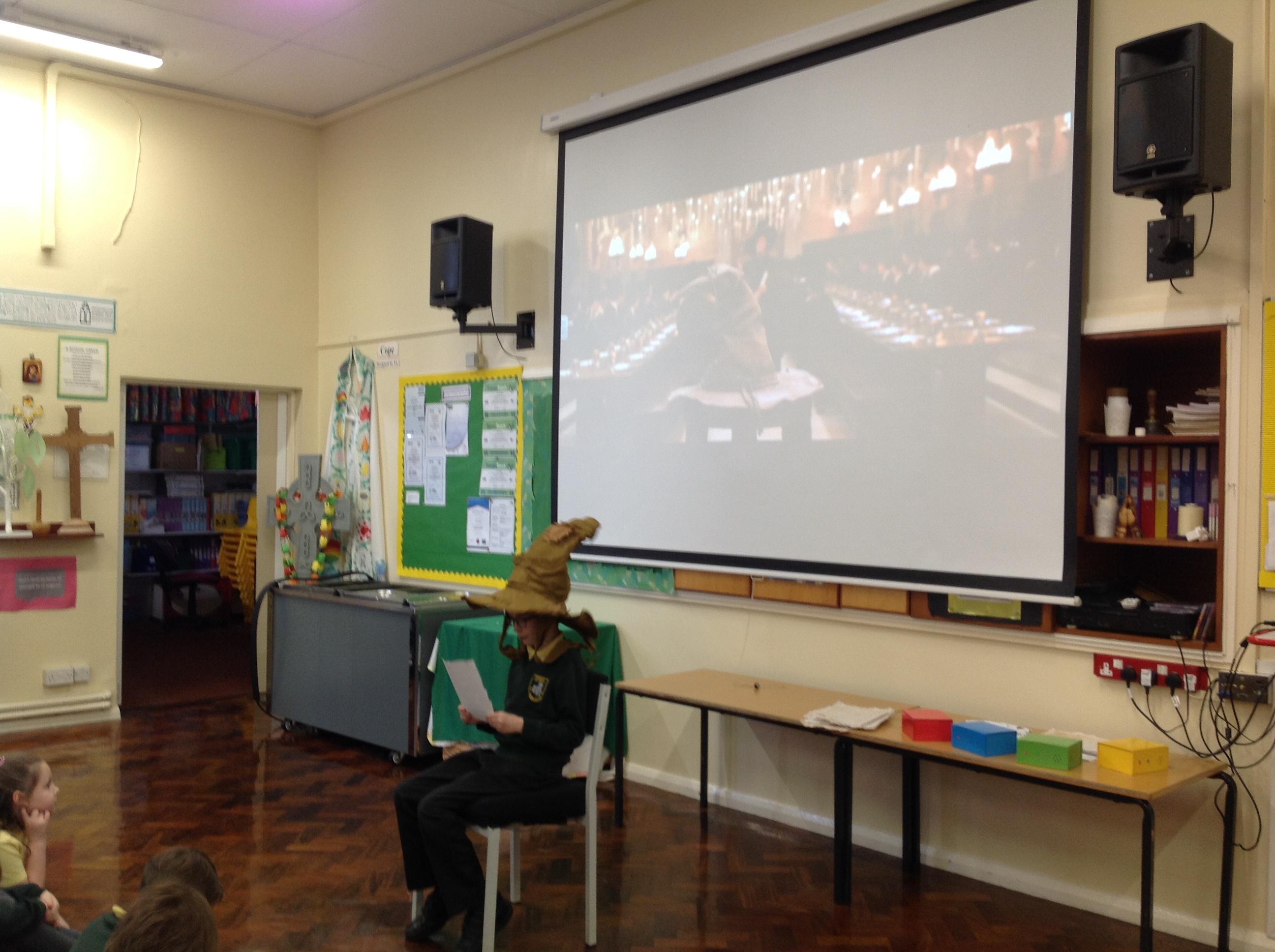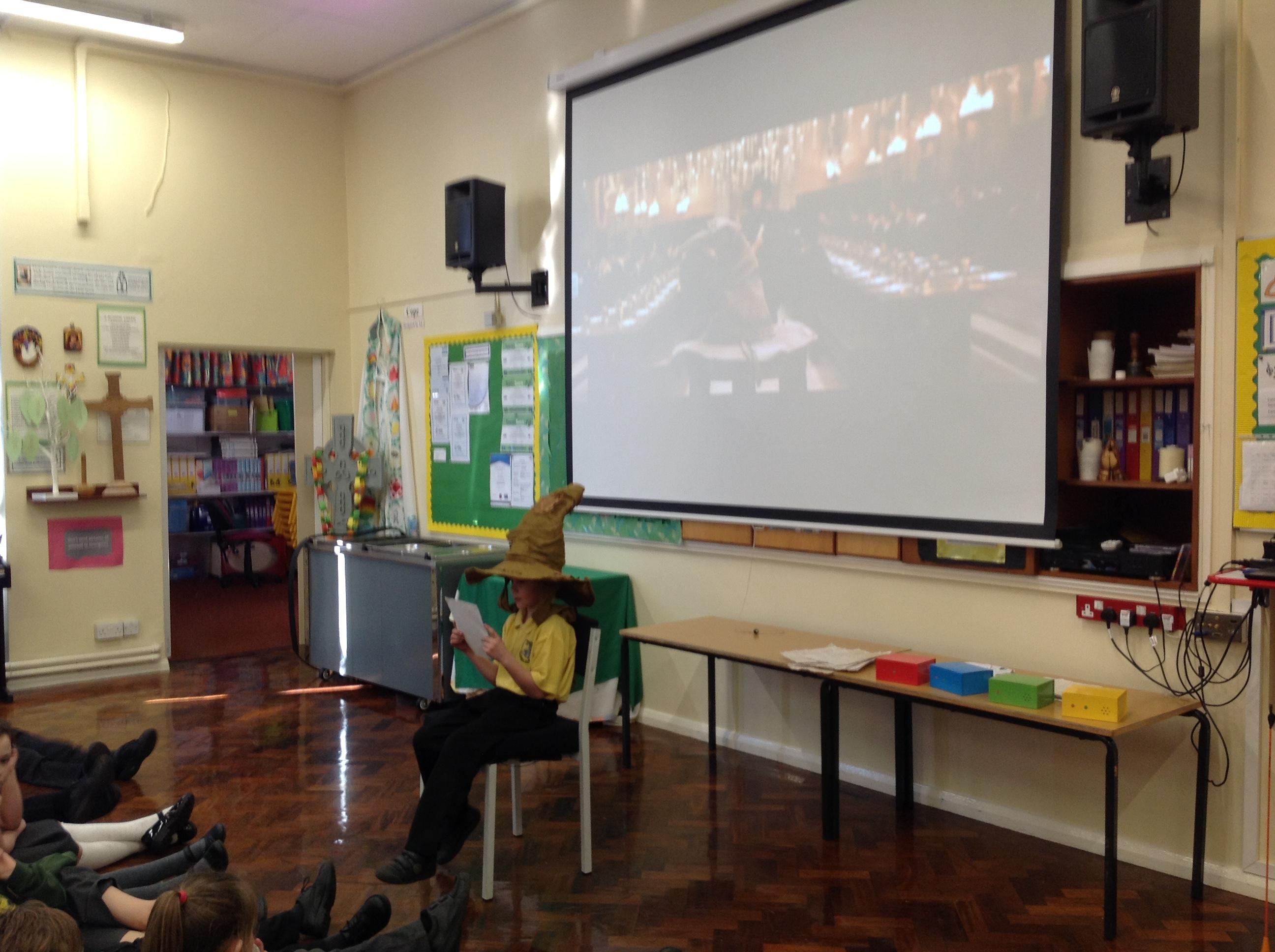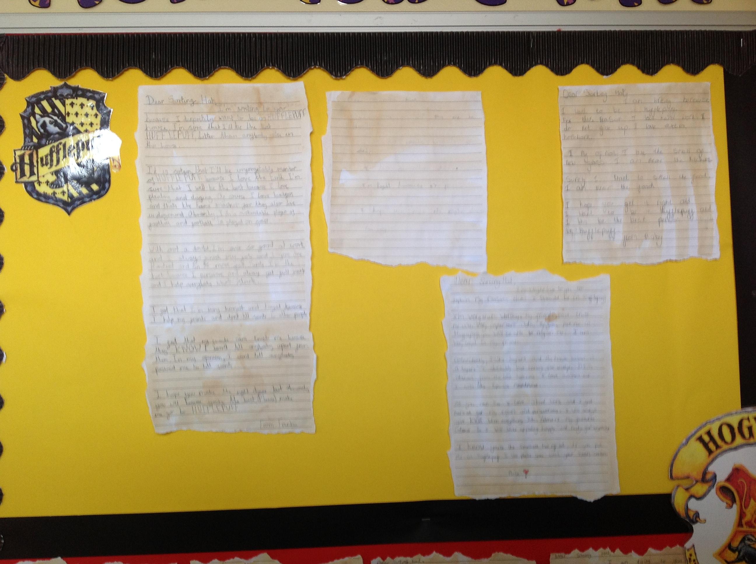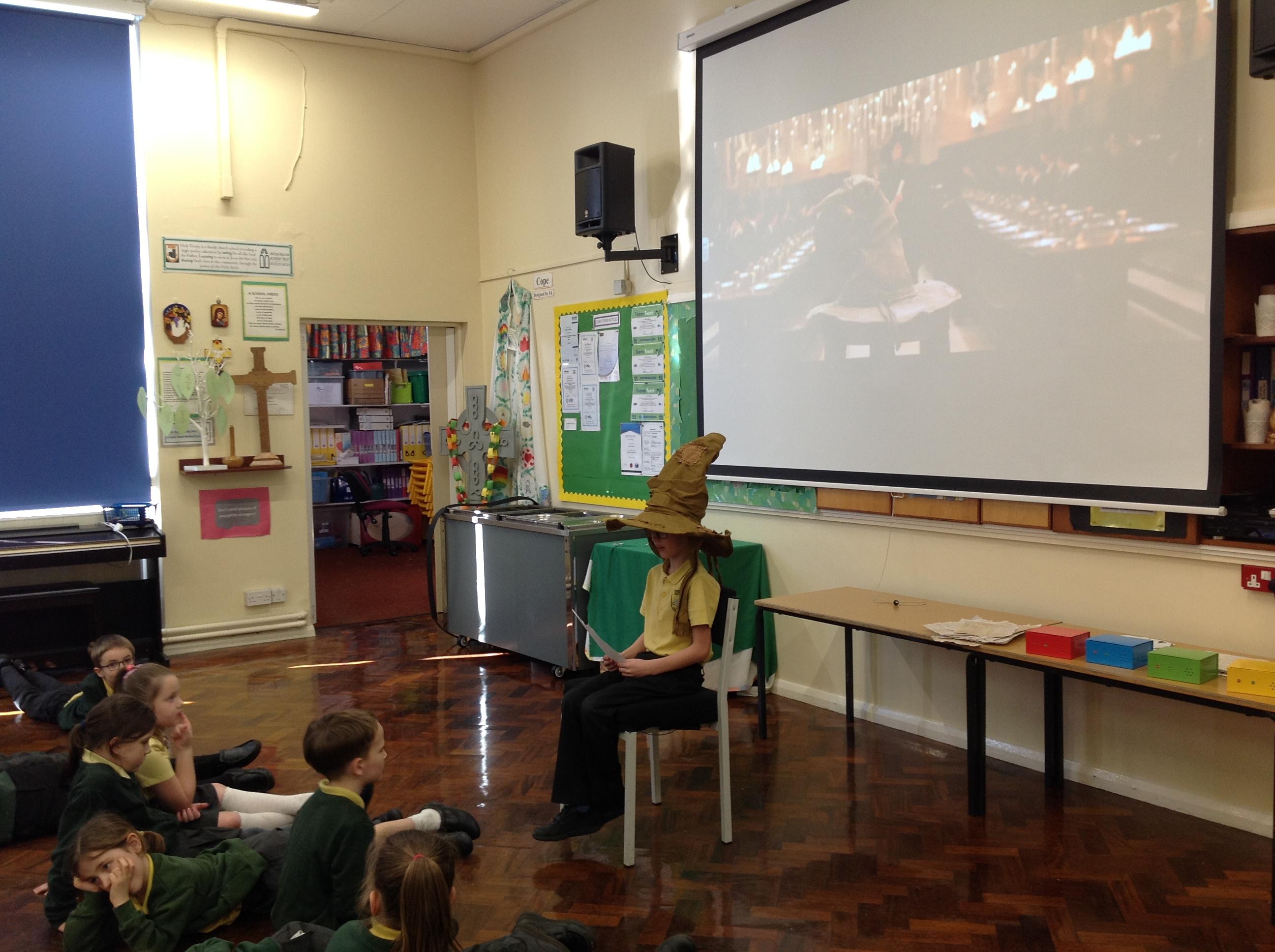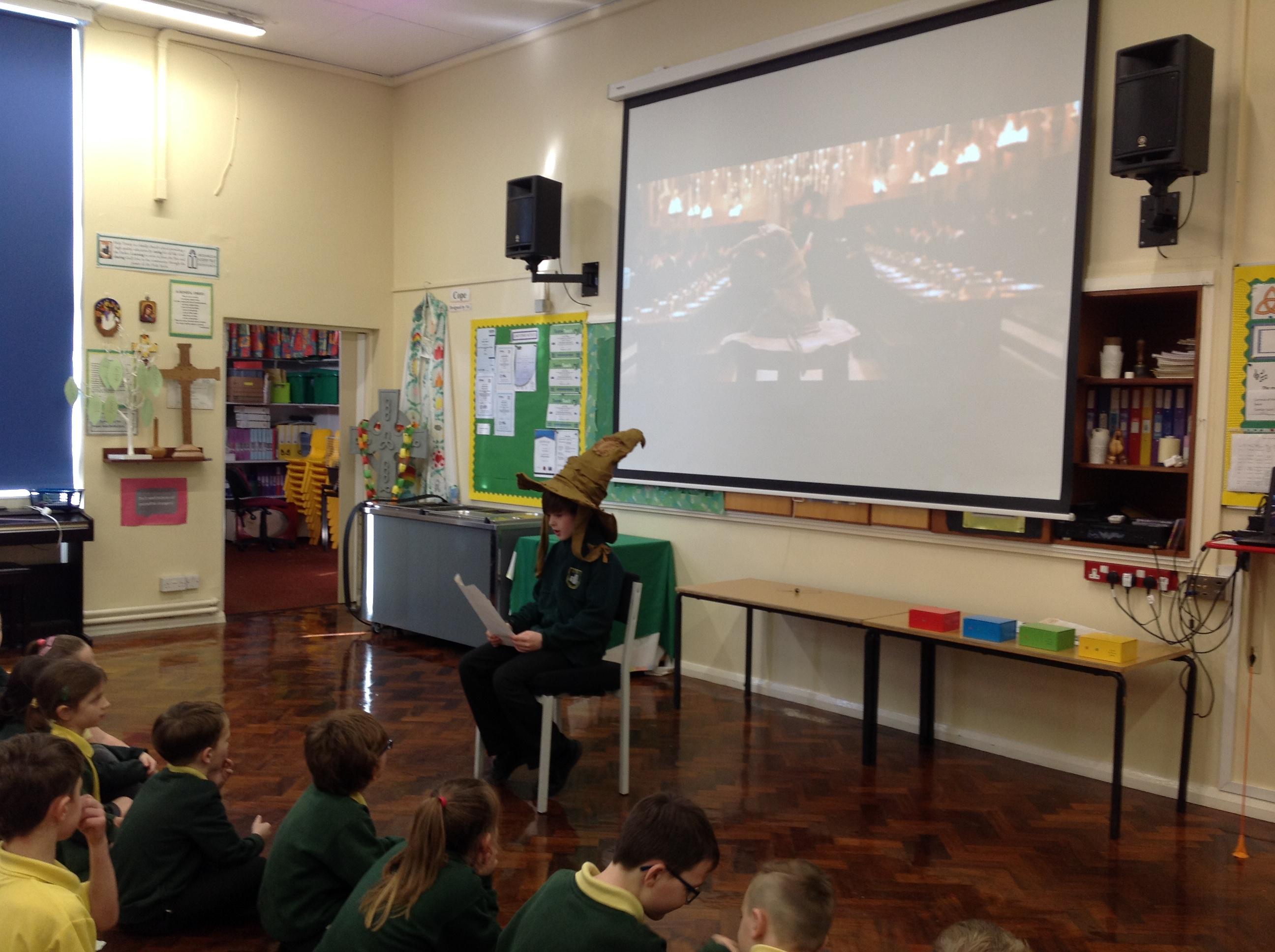 This week, we have been looking at persuasive writing techniques and we have written to the Sorting Hat to persuade them to put us in a certain house. This afternoon, we had a Sorting Ceremony of our own! We all got to wear the Sorting Hat and read our letters...and then we were sorted into our chosen house! We get to wear a new badge for the rest of the topic showing which house we are in!