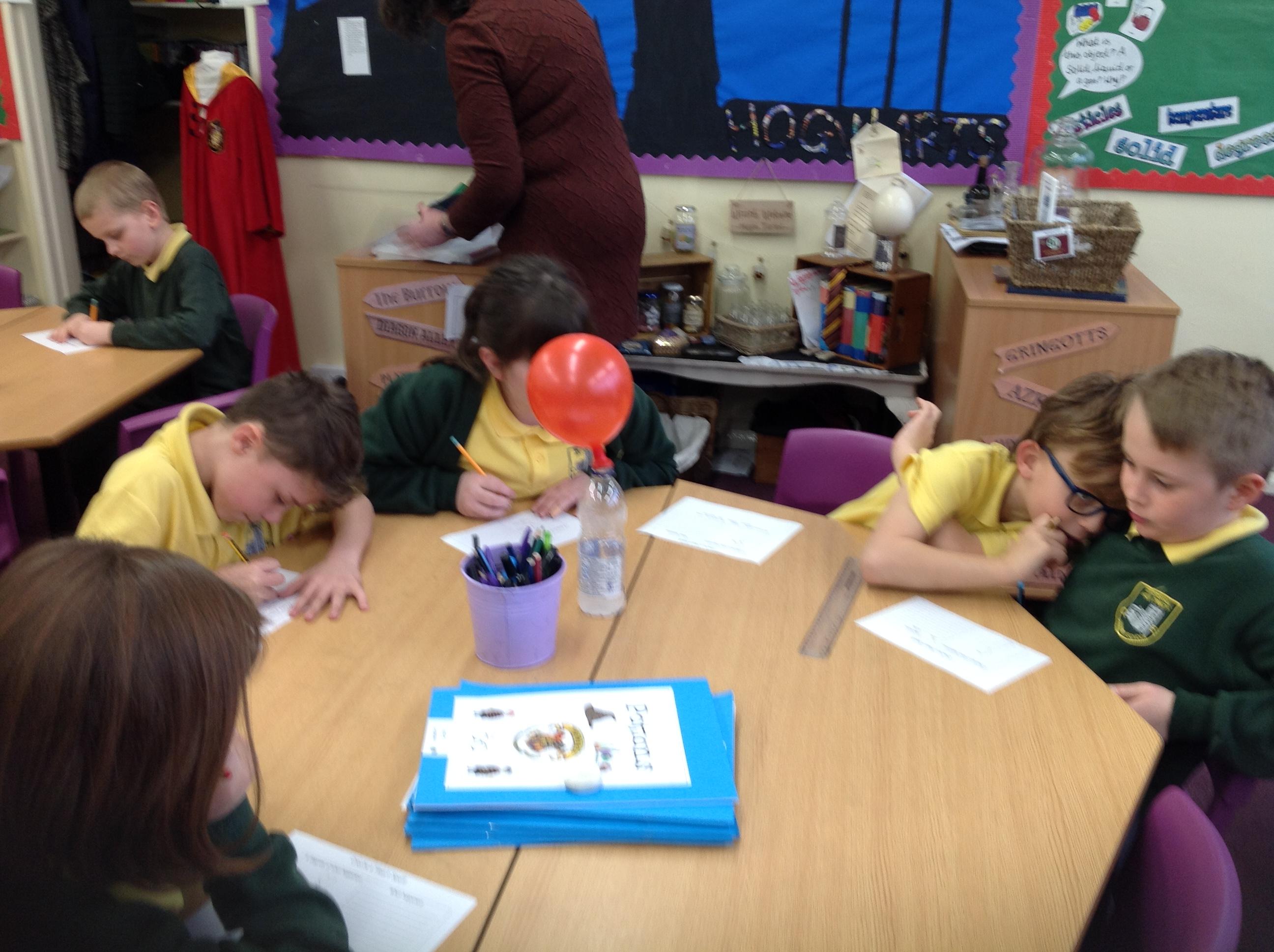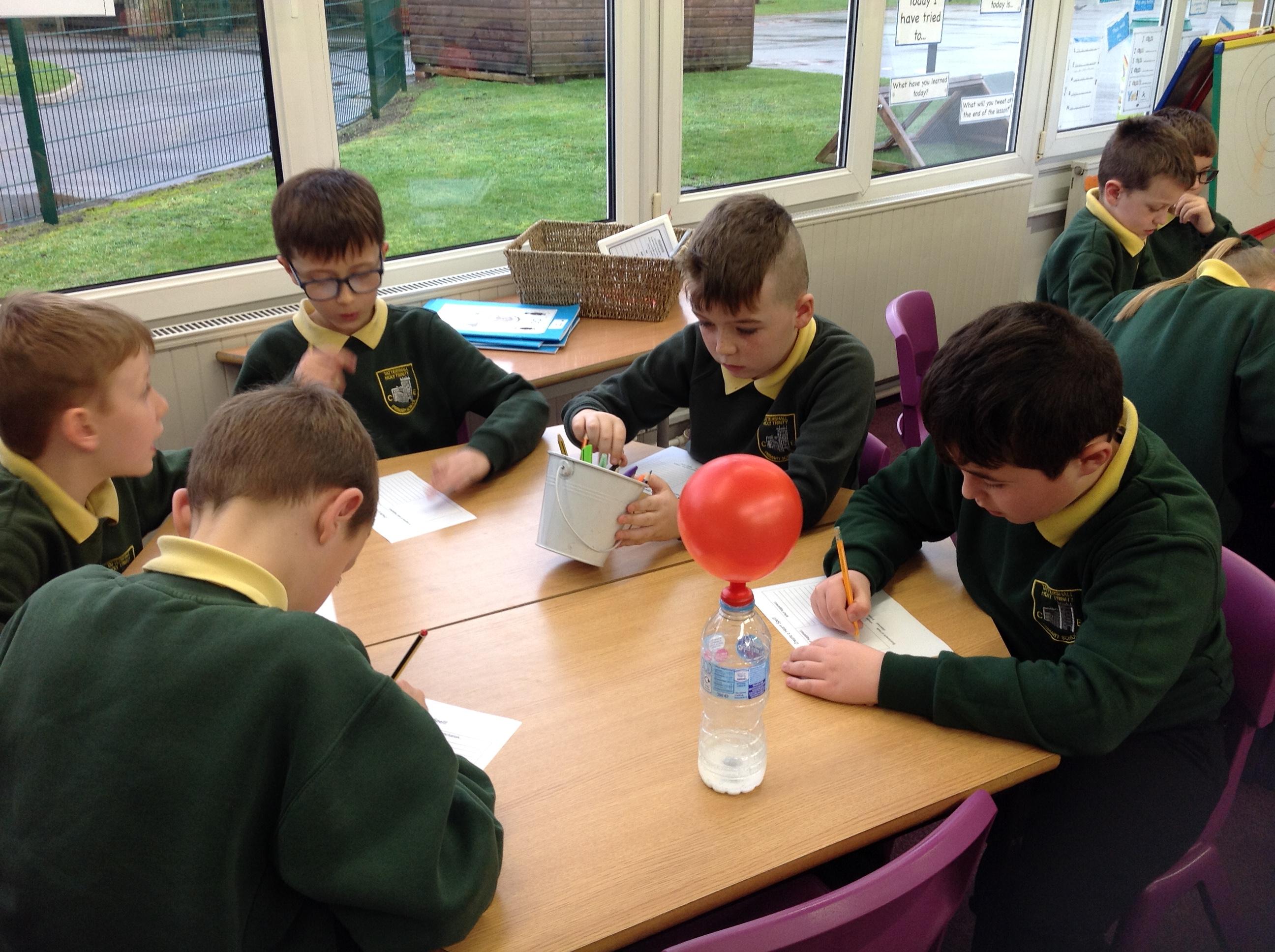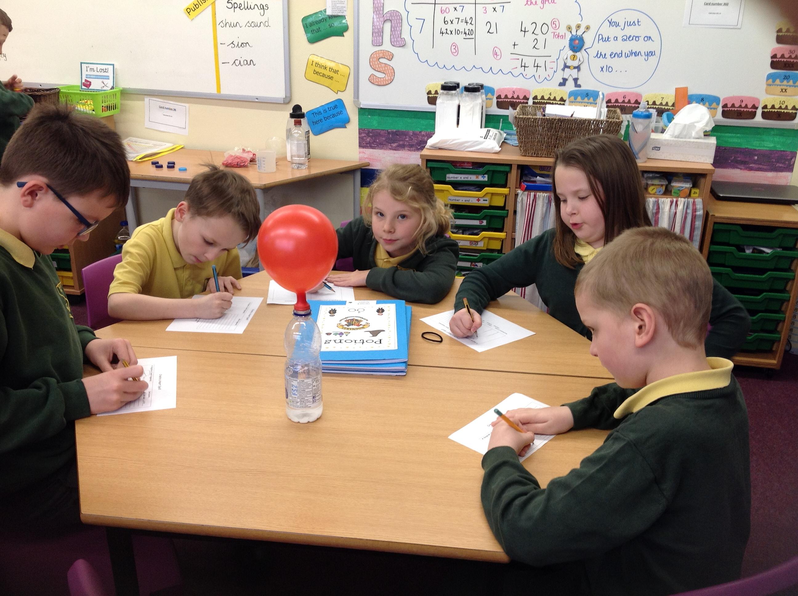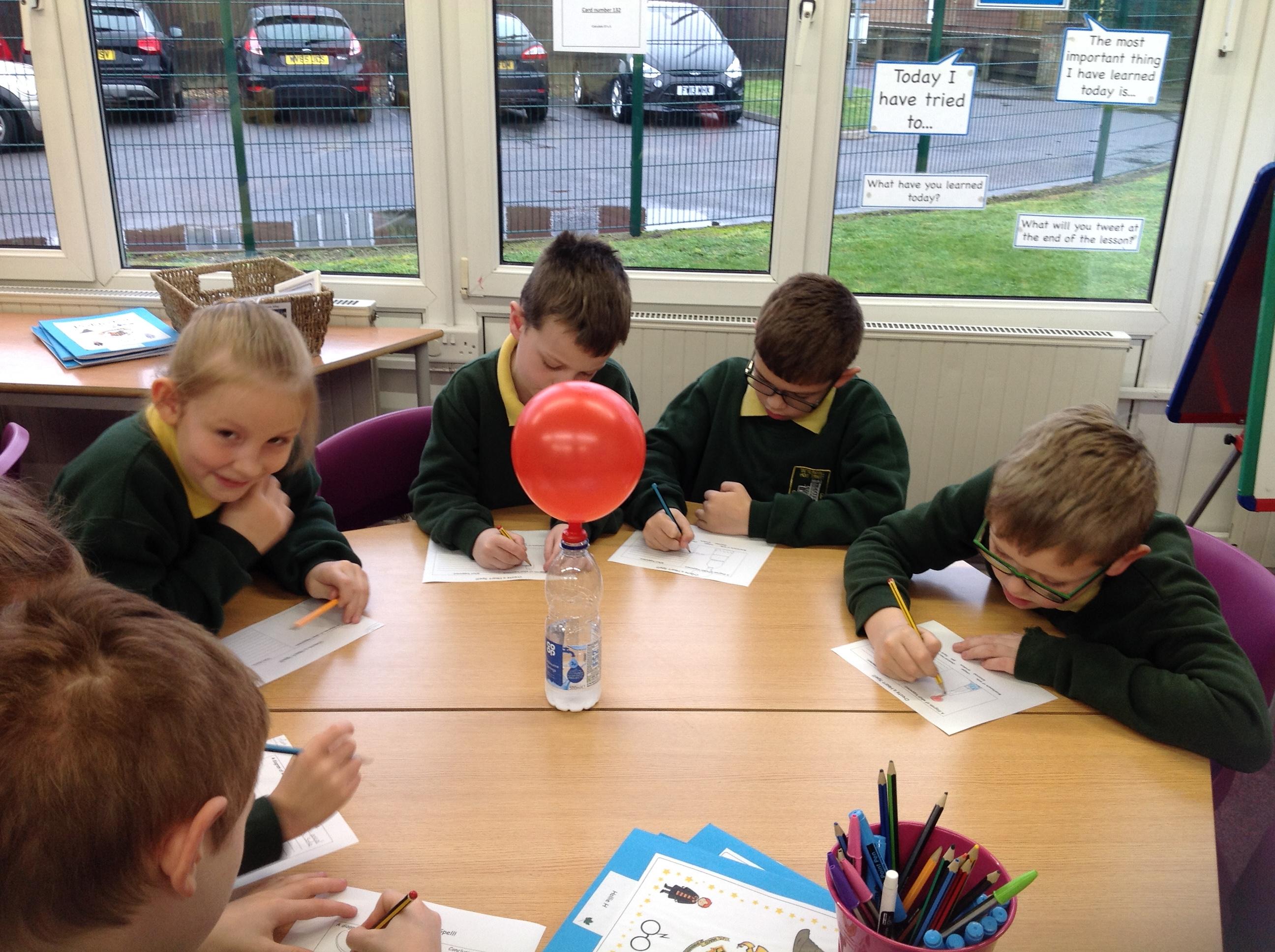 We have had a very exciting afternoon! We were set a challenge to inflate a balloon using bicarbonate of soda and vinegar! We put the balloon over the vinegar and poured in the bicarbonate of soda. This created a chemical reaction, which gave off a gas that filled the balloon!