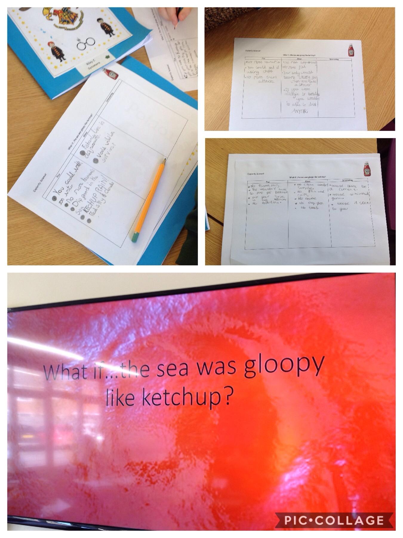 We pondered one of life's big questions today...what if the sea was gloopy like ketchup! We had a fantastic discussion and it was great to hear lots of ideas linking back to our previous topics! We had to think of a plus, minus and interesting point towards this question!