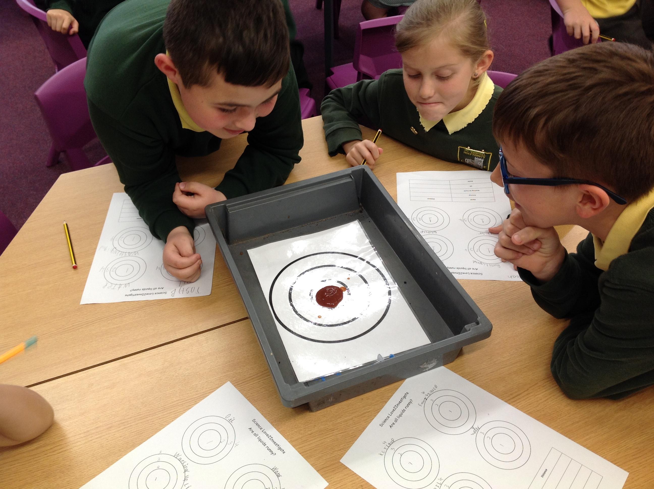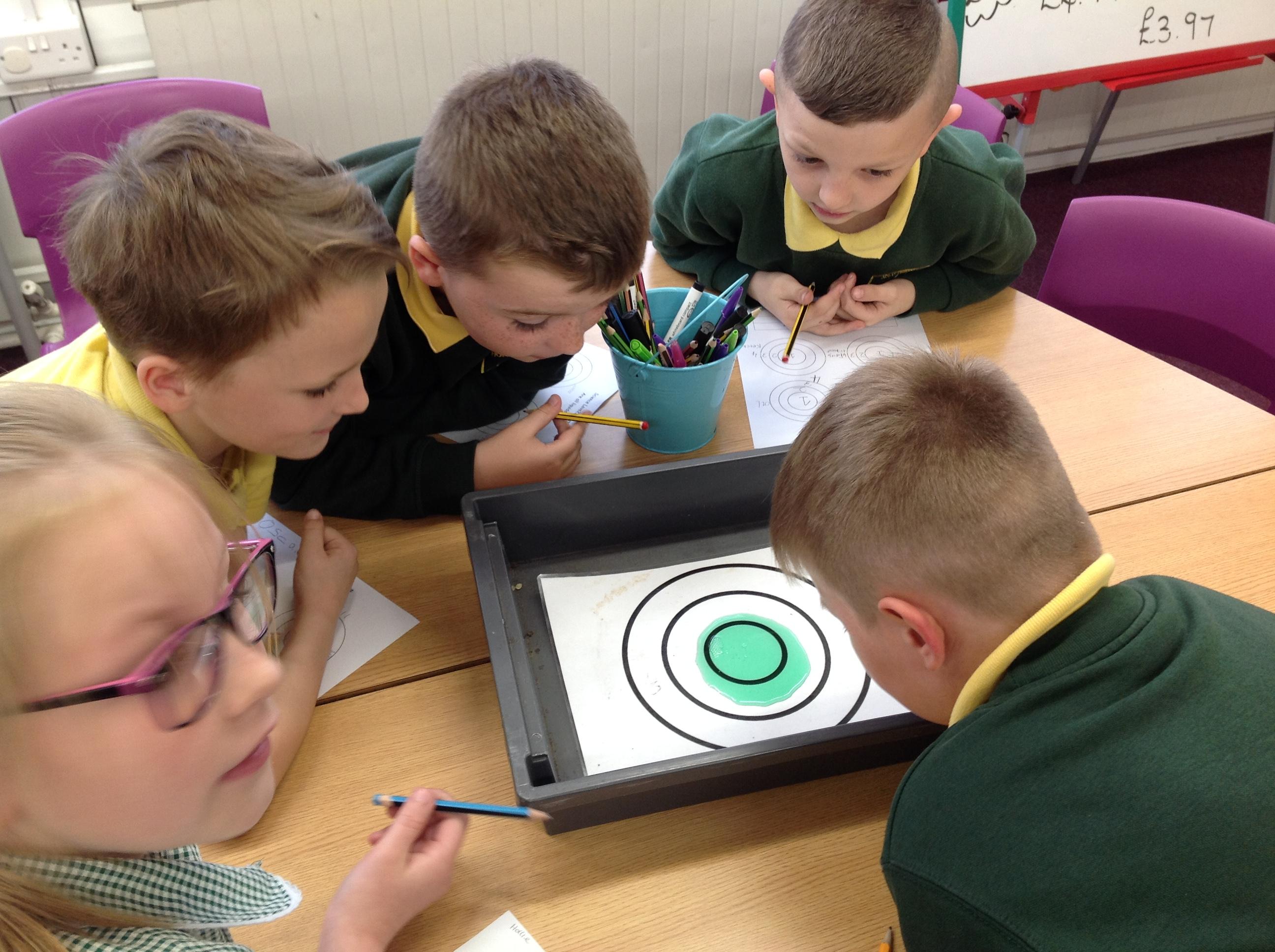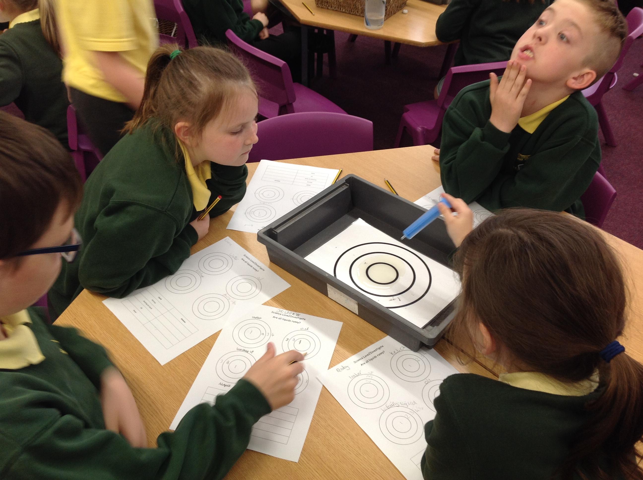 Today we have investigated this question...are all liquids runny? We had a target board and placed 10ml of ketchup, oil, water and fairy liquid in the middle and measured how far it spread. We recorded which zone of the target board they entered and drew diagrams of how they spread out!