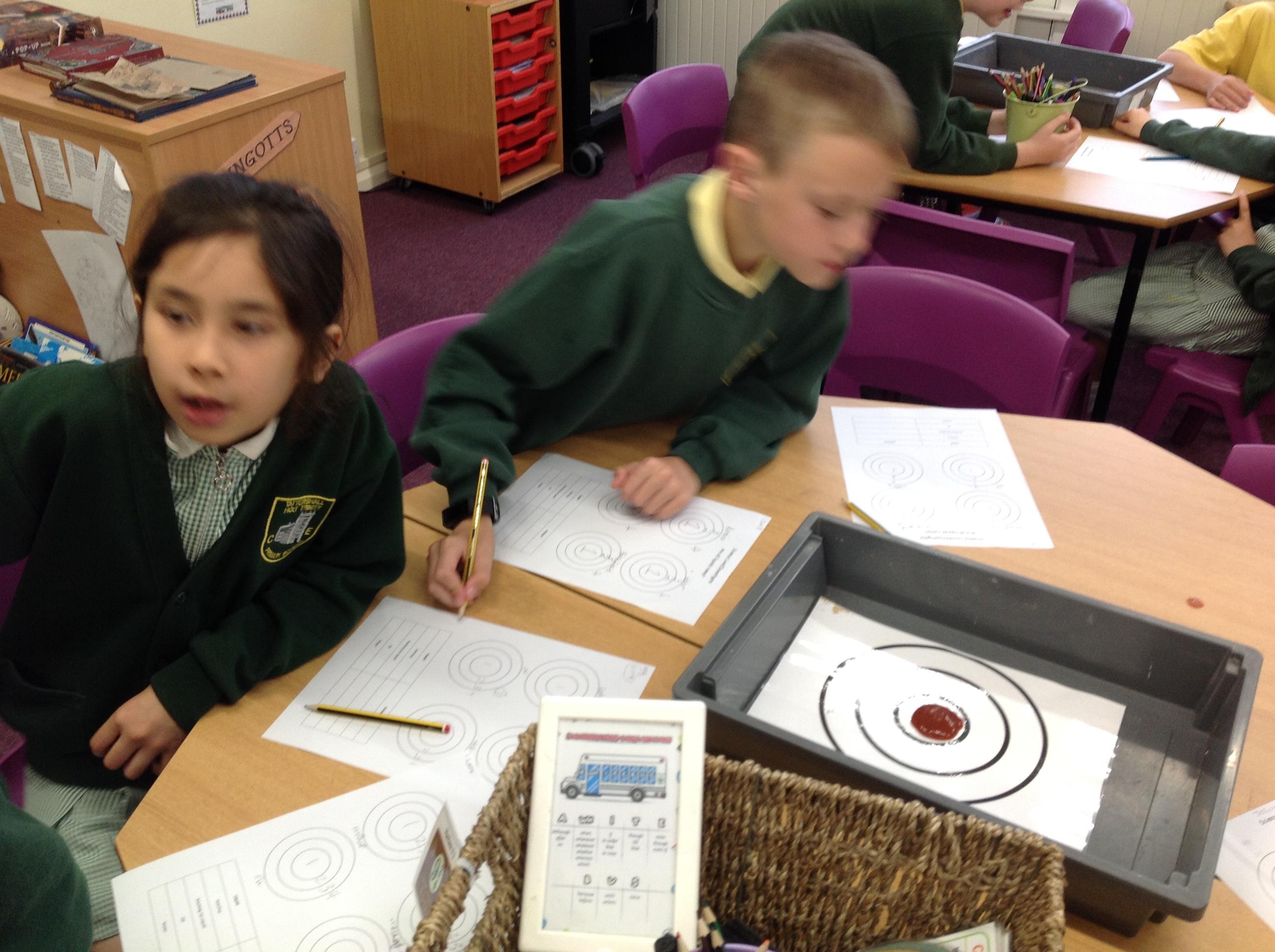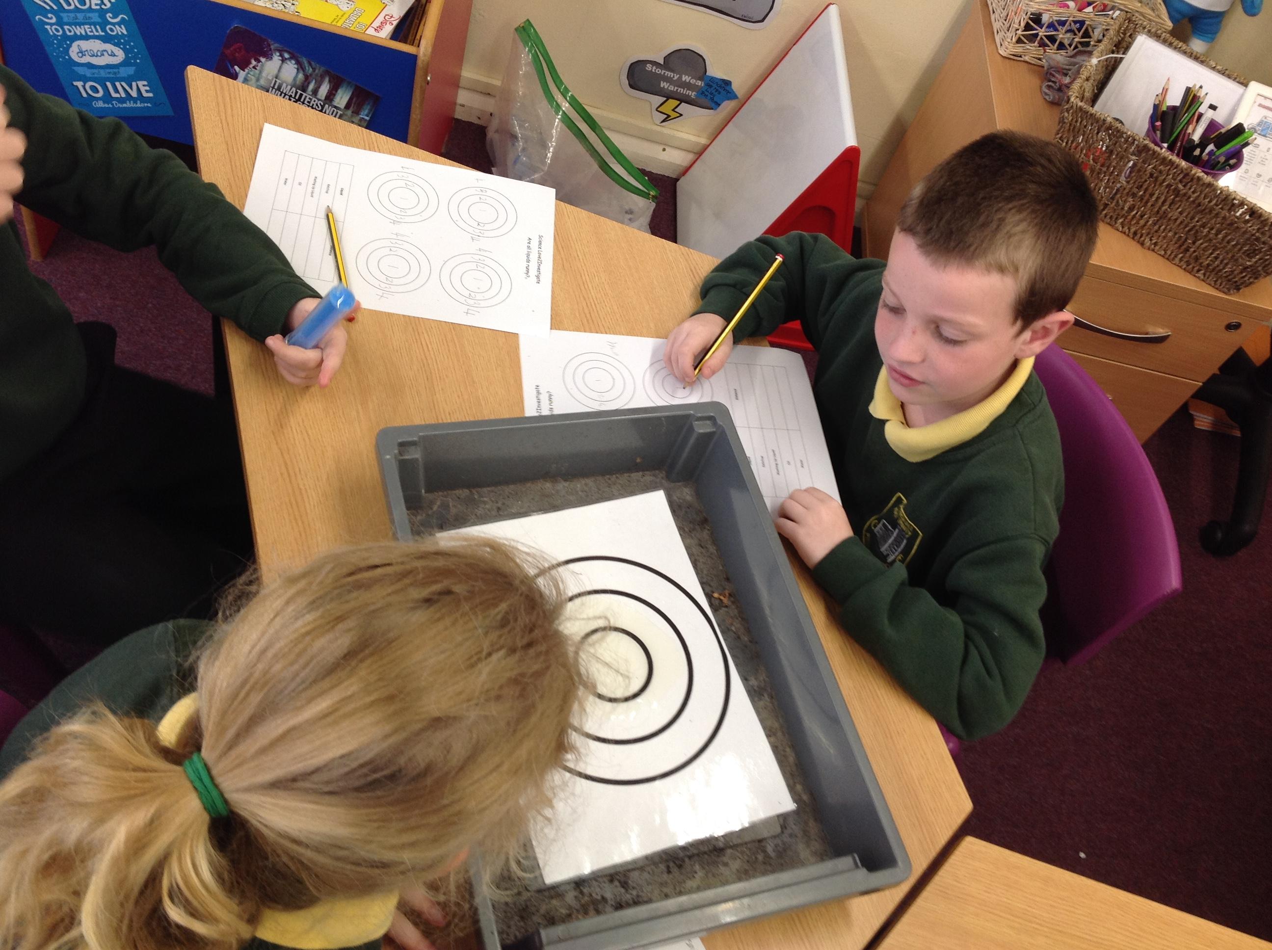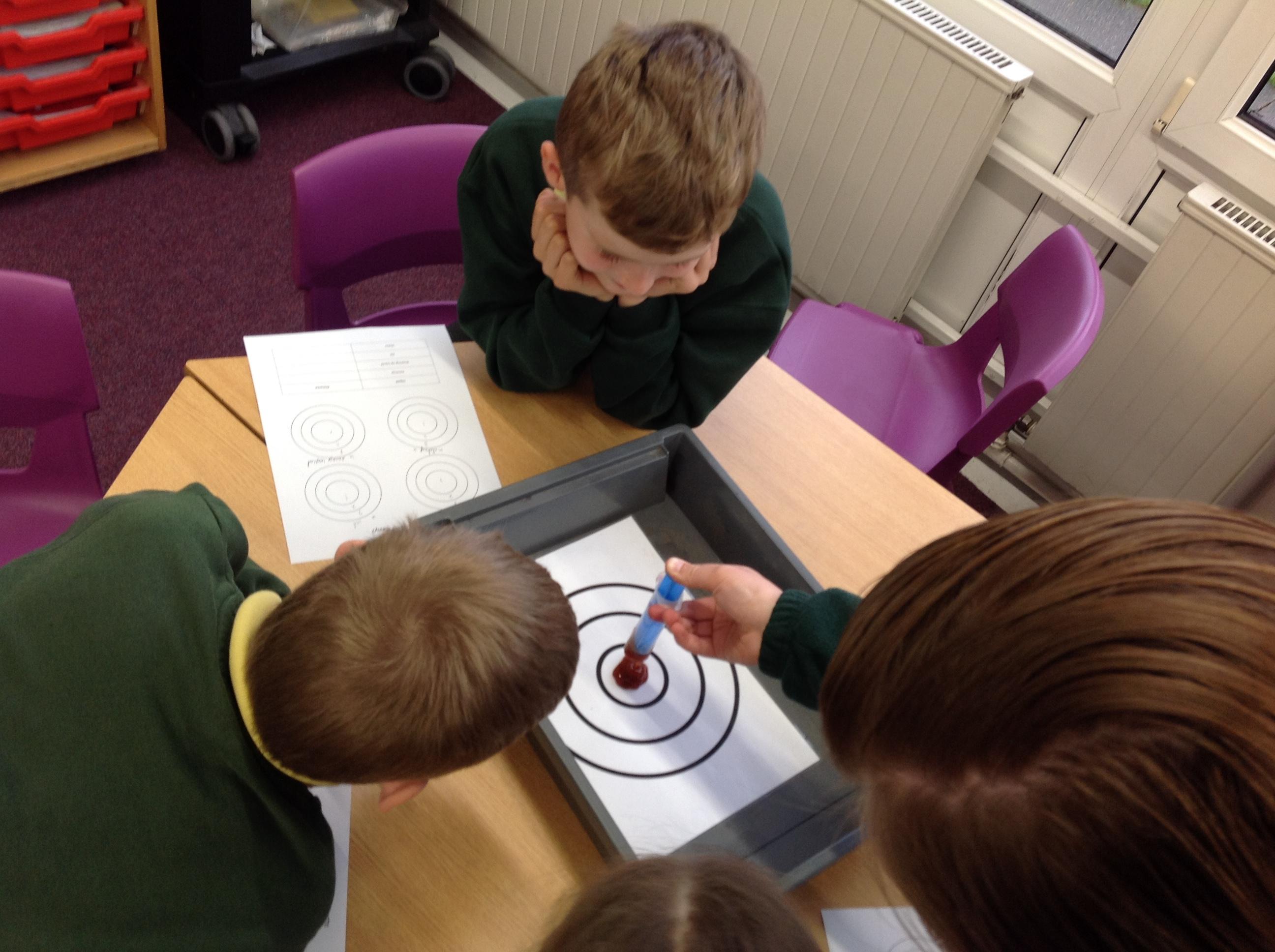 Today we have investigated this question...are all liquids runny? We had a target board and placed 10ml of ketchup, oil, water and fairy liquid in the middle and measured how far it spread. We recorded which zone of the target board they entered and drew diagrams of how they spread out!