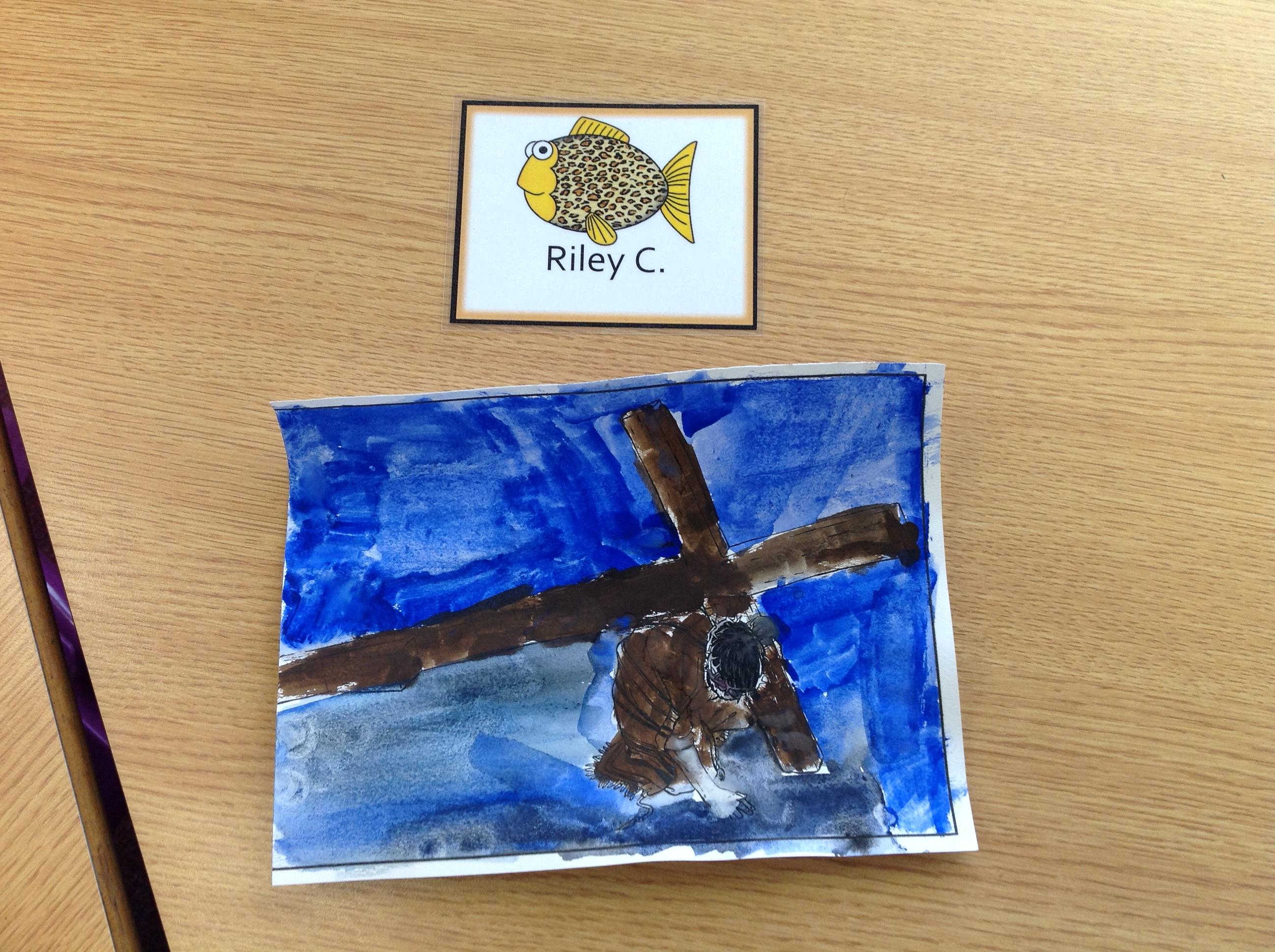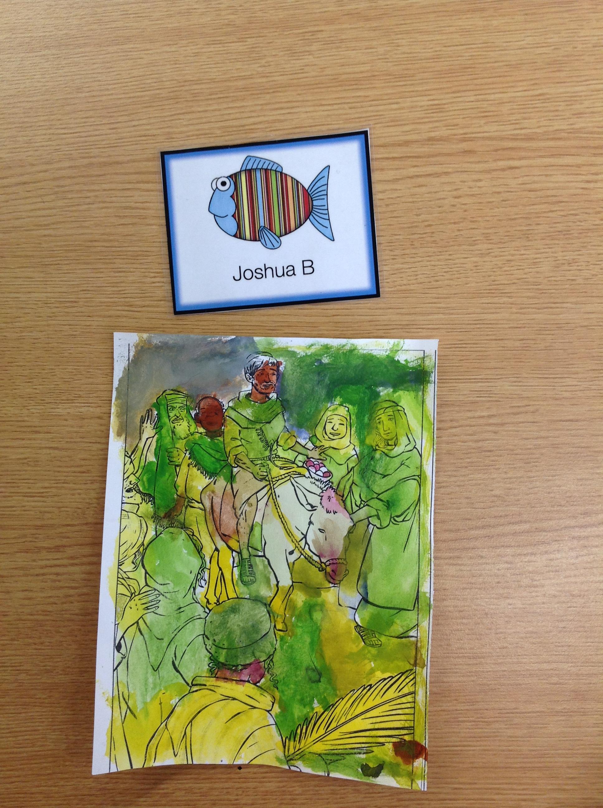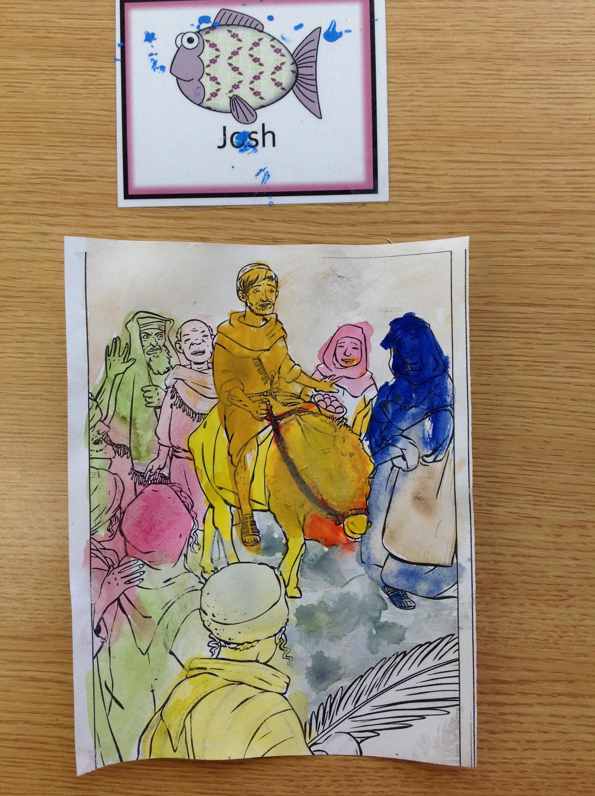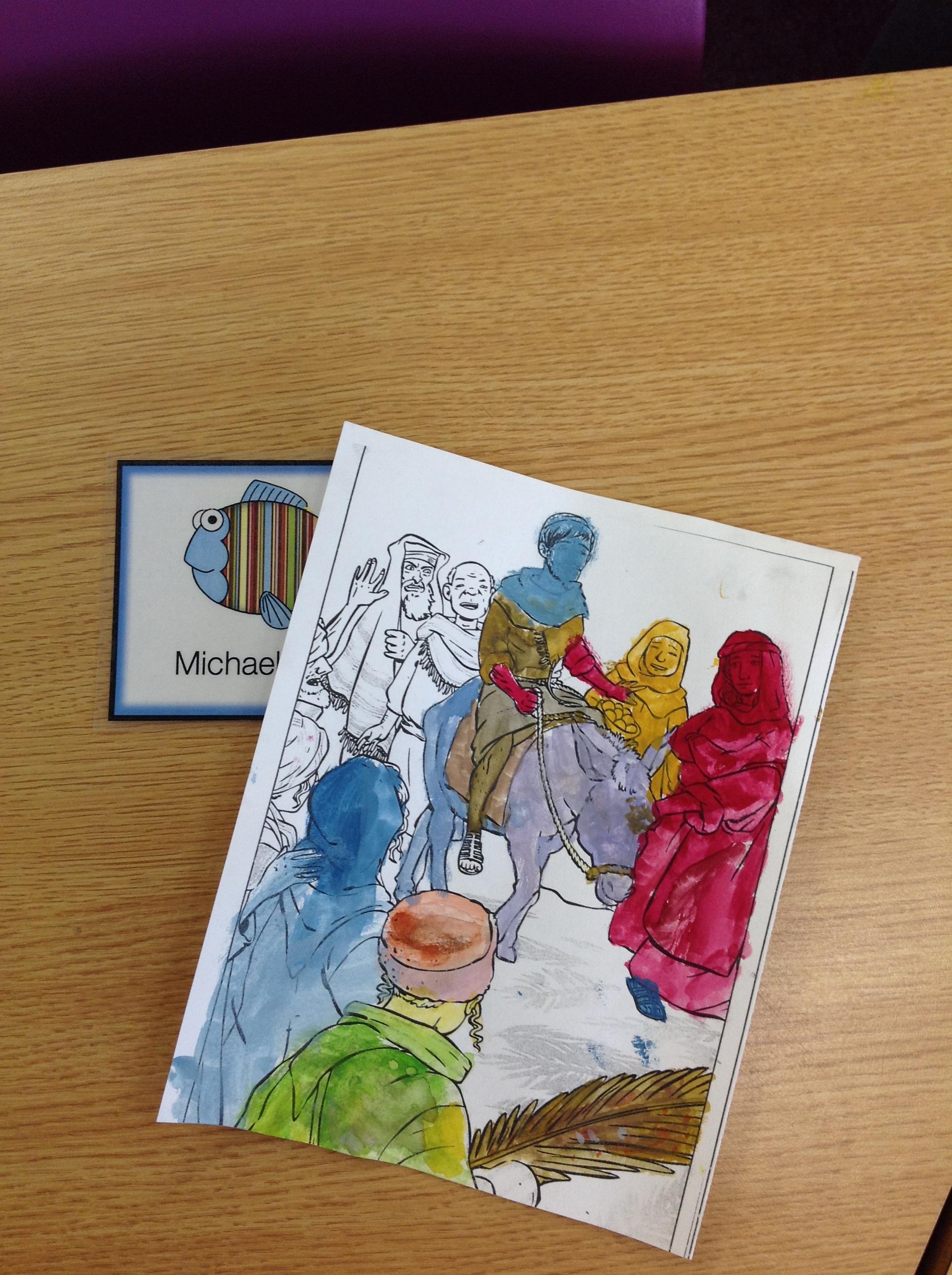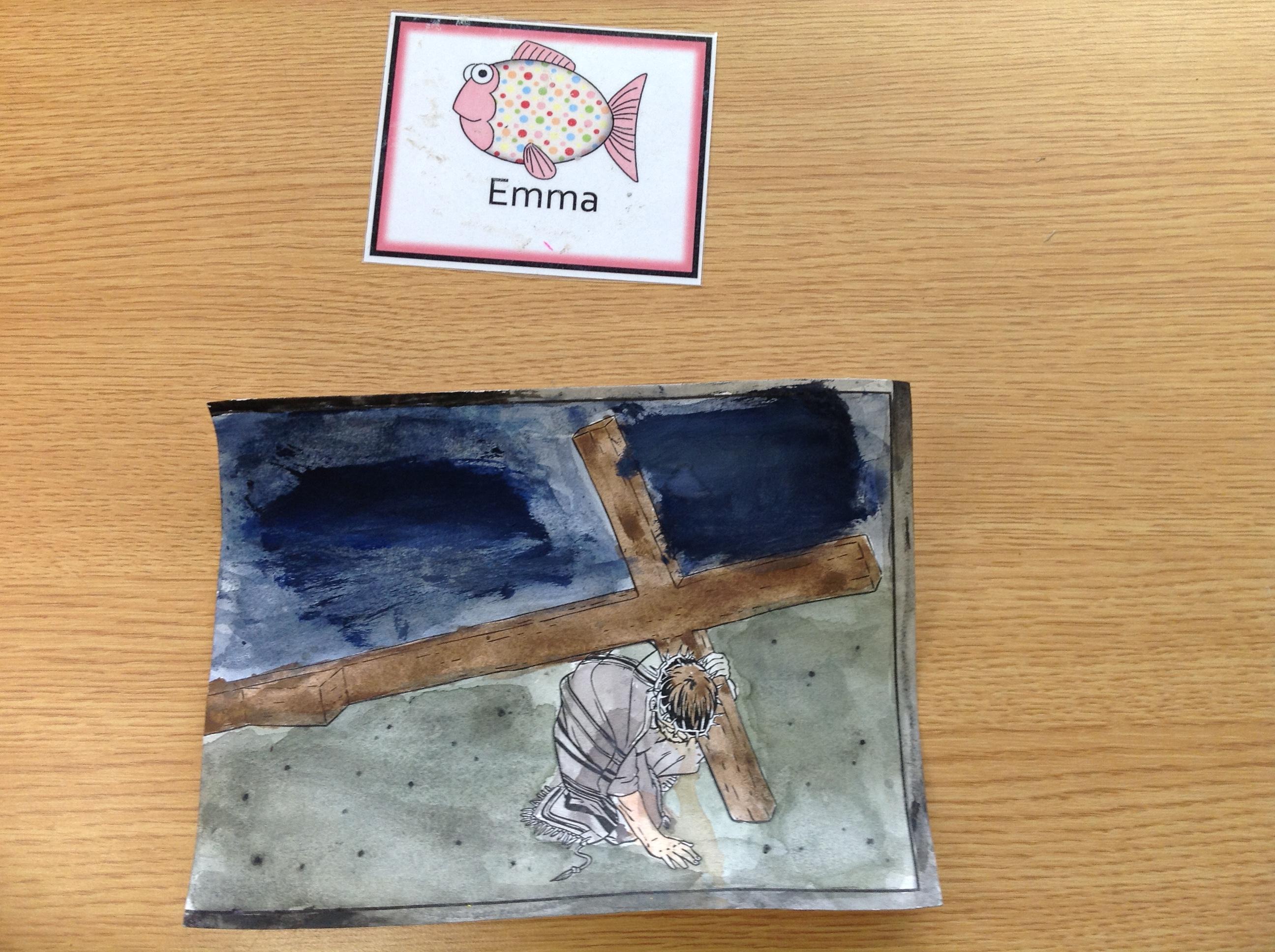 We having been thinking about the Easter Week and how Mary felt at different points of the story. We used watercolours to paint these pictures using colours that echoed Mary's feelings at that point in the story.