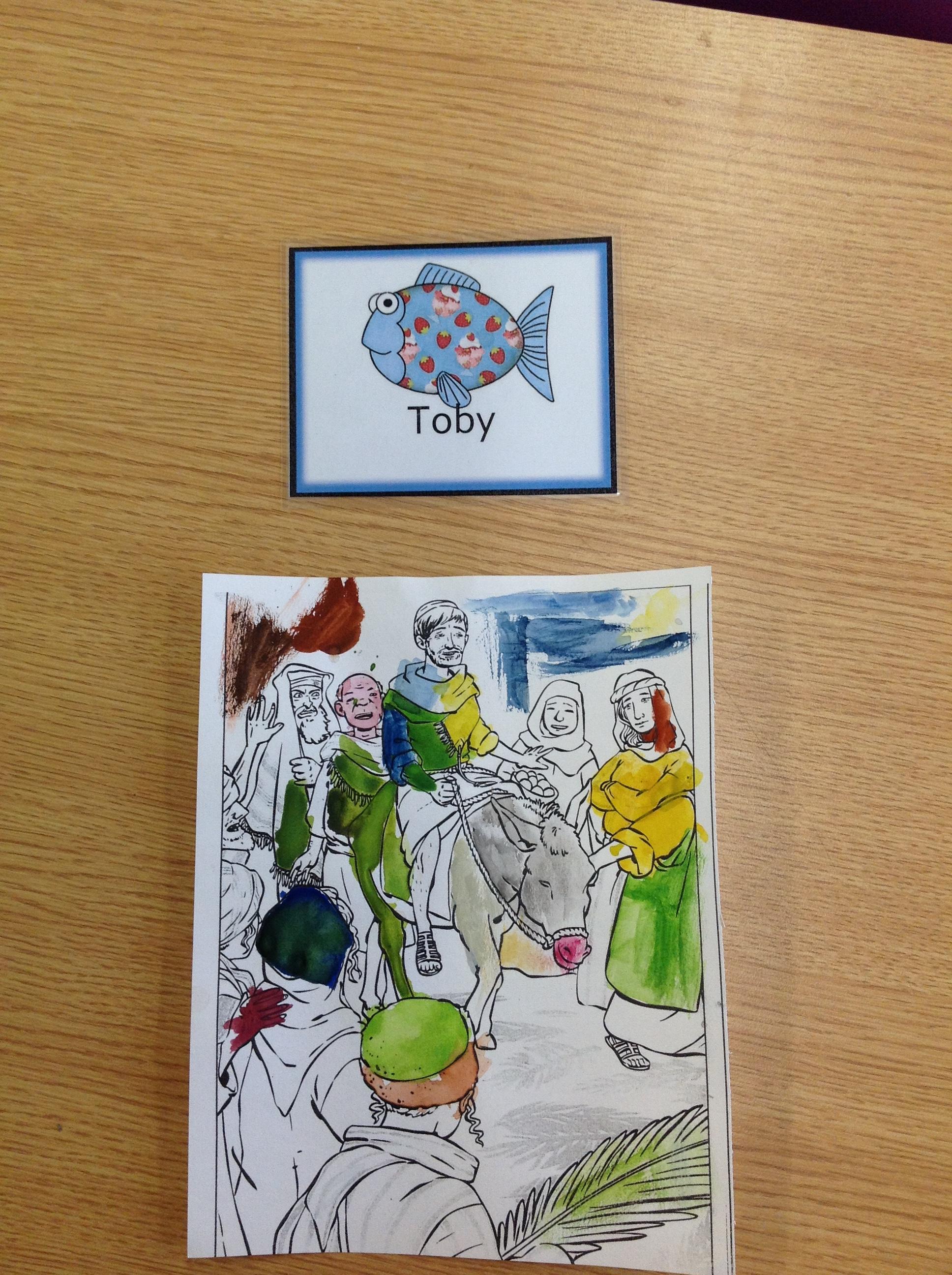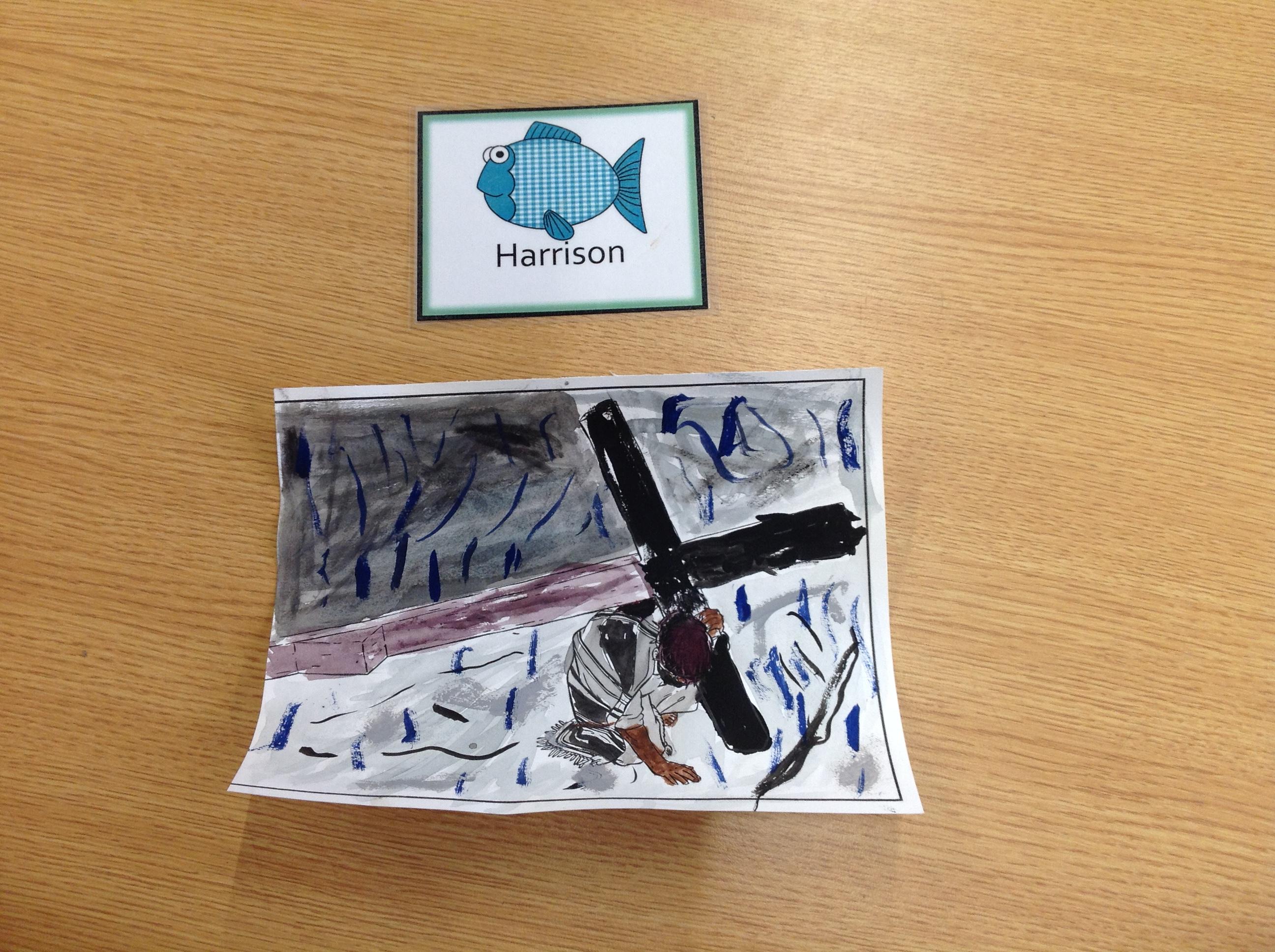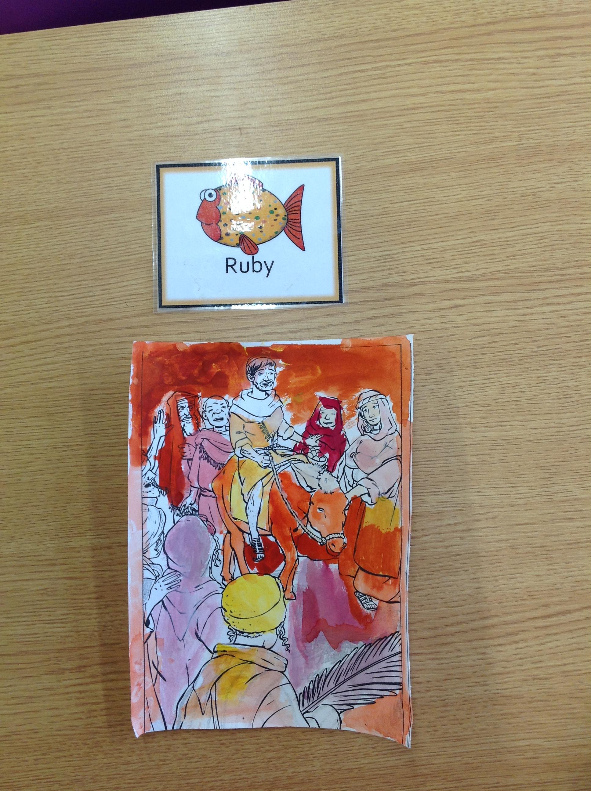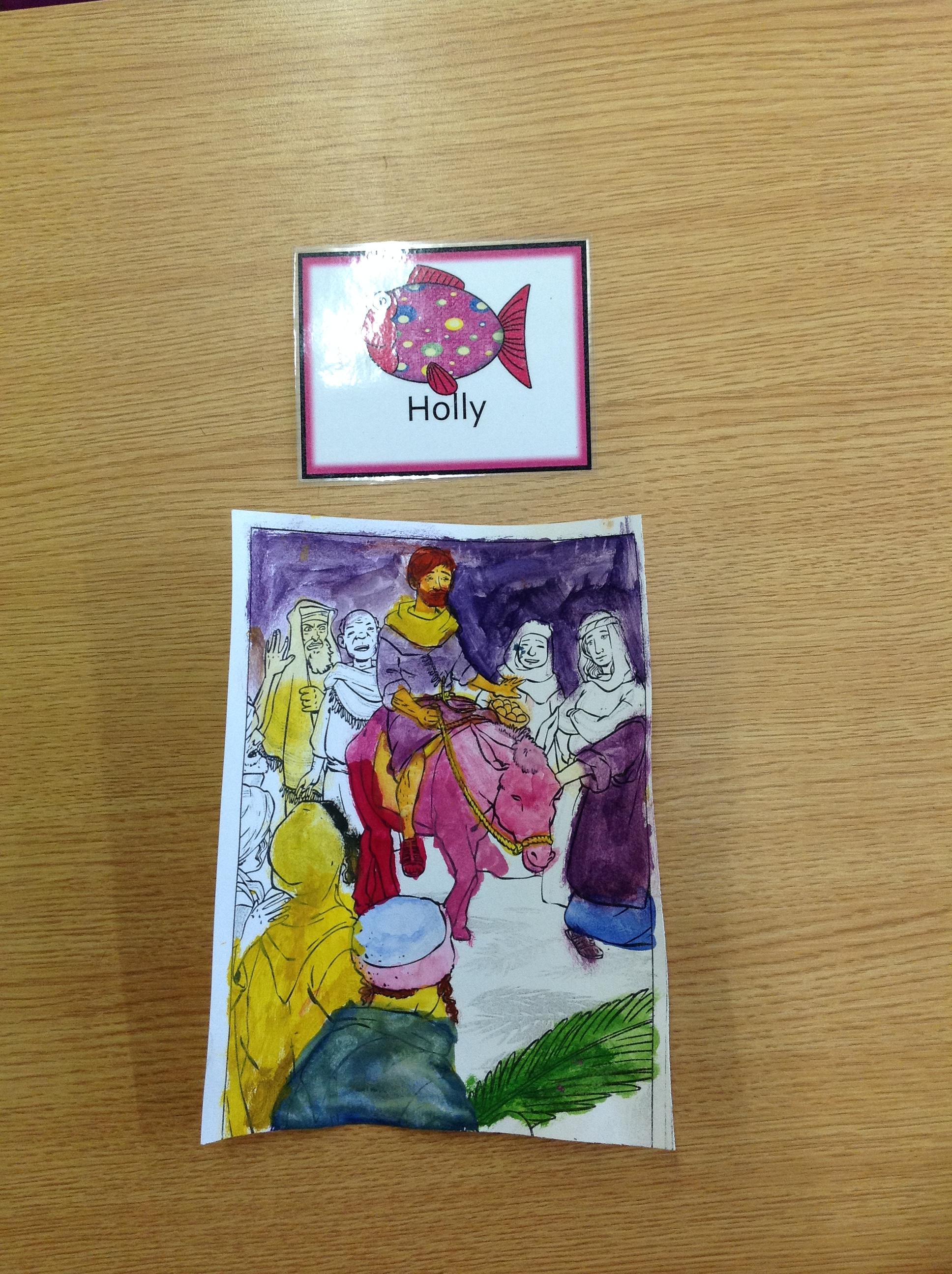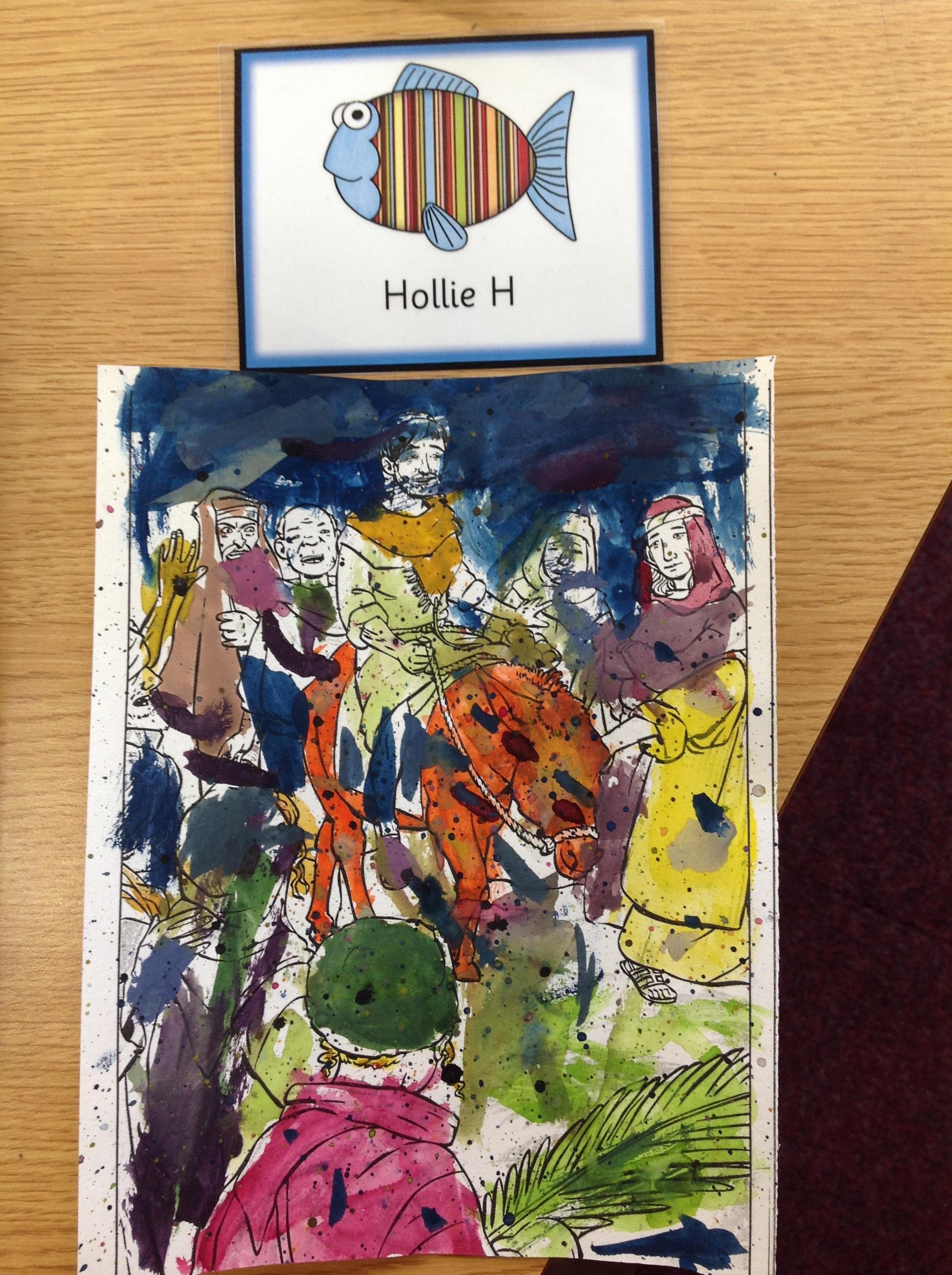 We having been thinking about the Easter Week and how Mary felt at different points of the story. We used watercolours to paint these pictures using colours that echoed Mary's feelings at that point in the story.