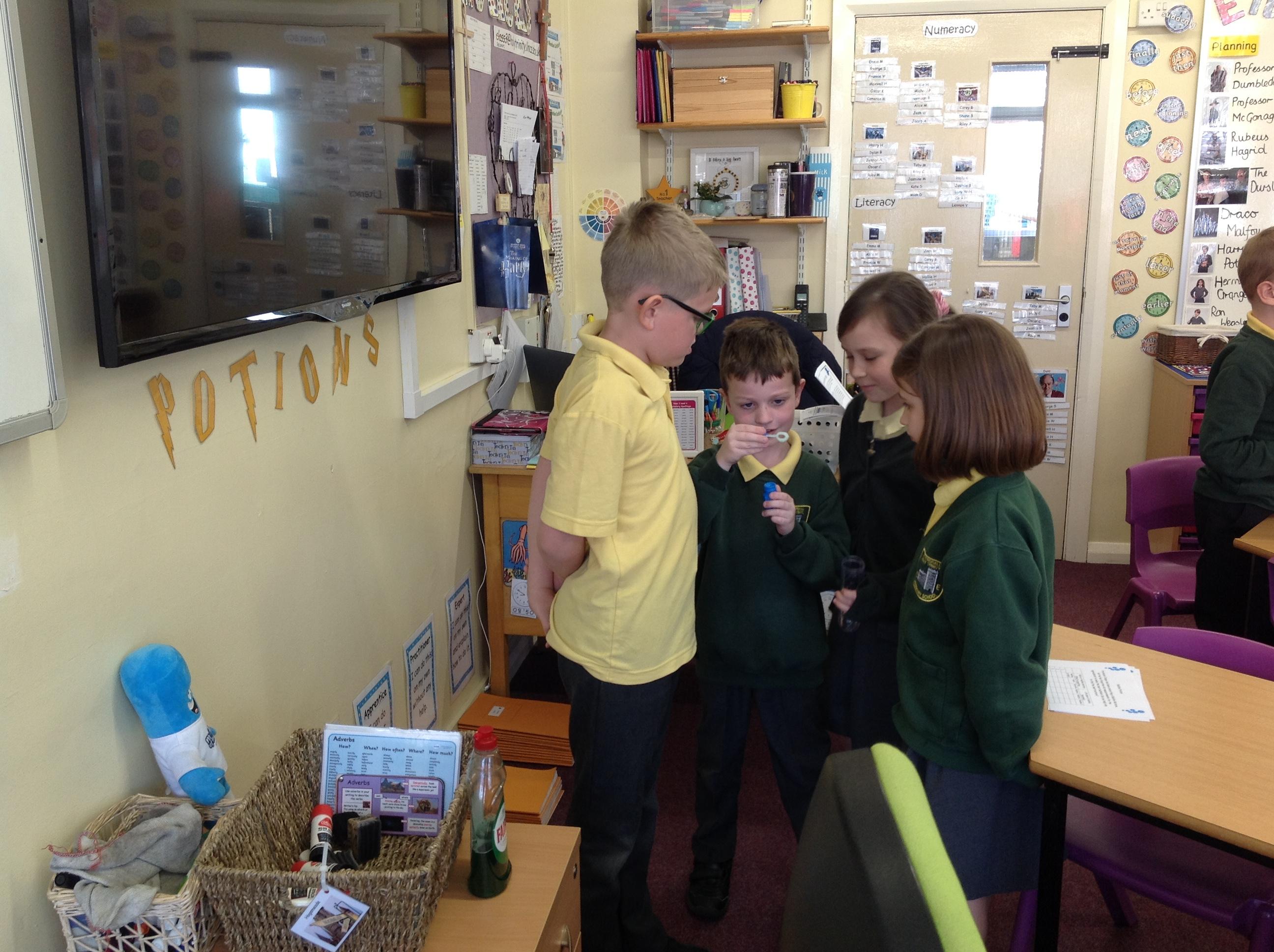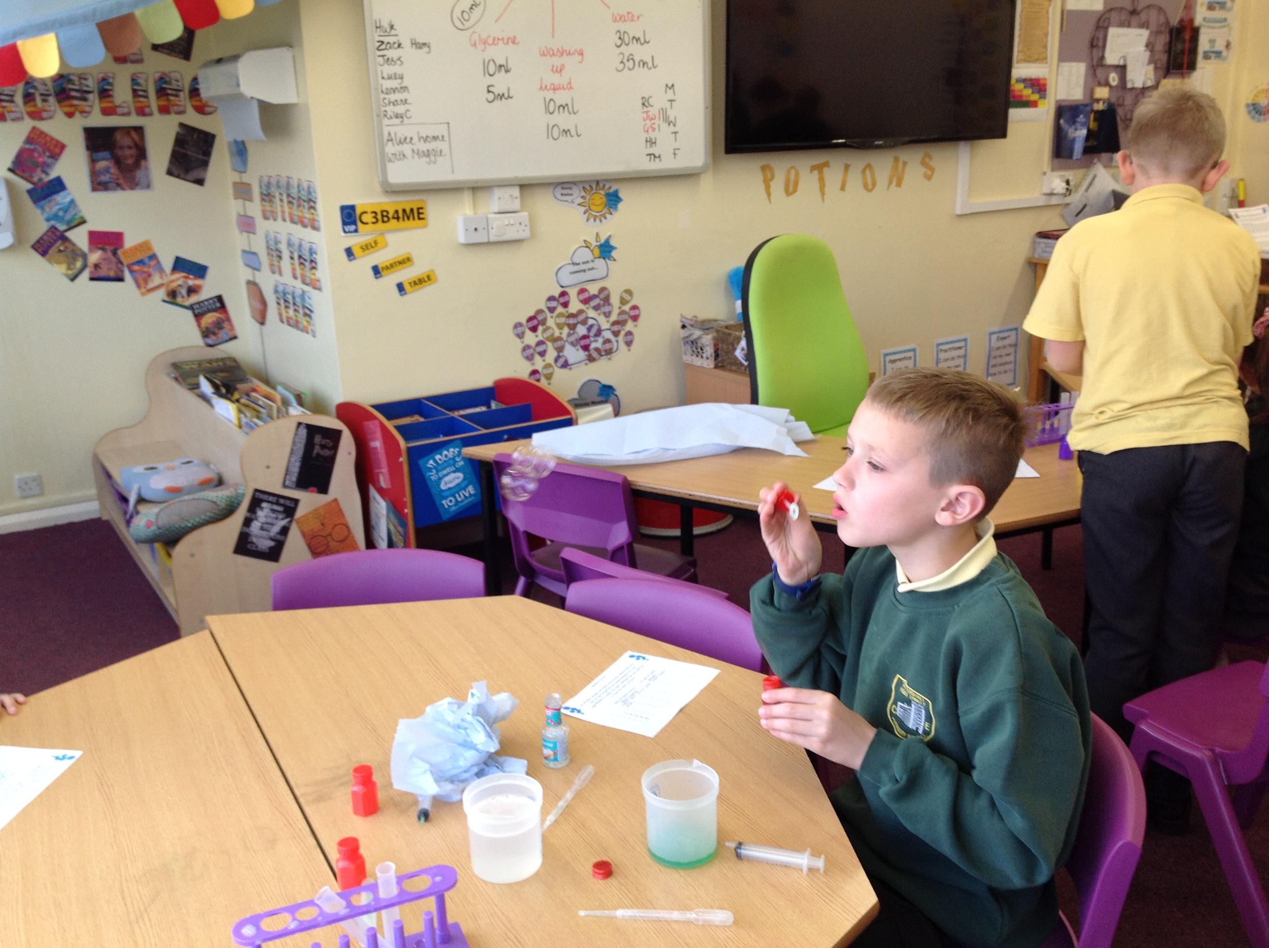 Snape set us a challenge today...he had forgotten the measurements to make the perfect bubble! We had to test how much glycerine, washing up liquid and water to use to make the longest lasting bubble!