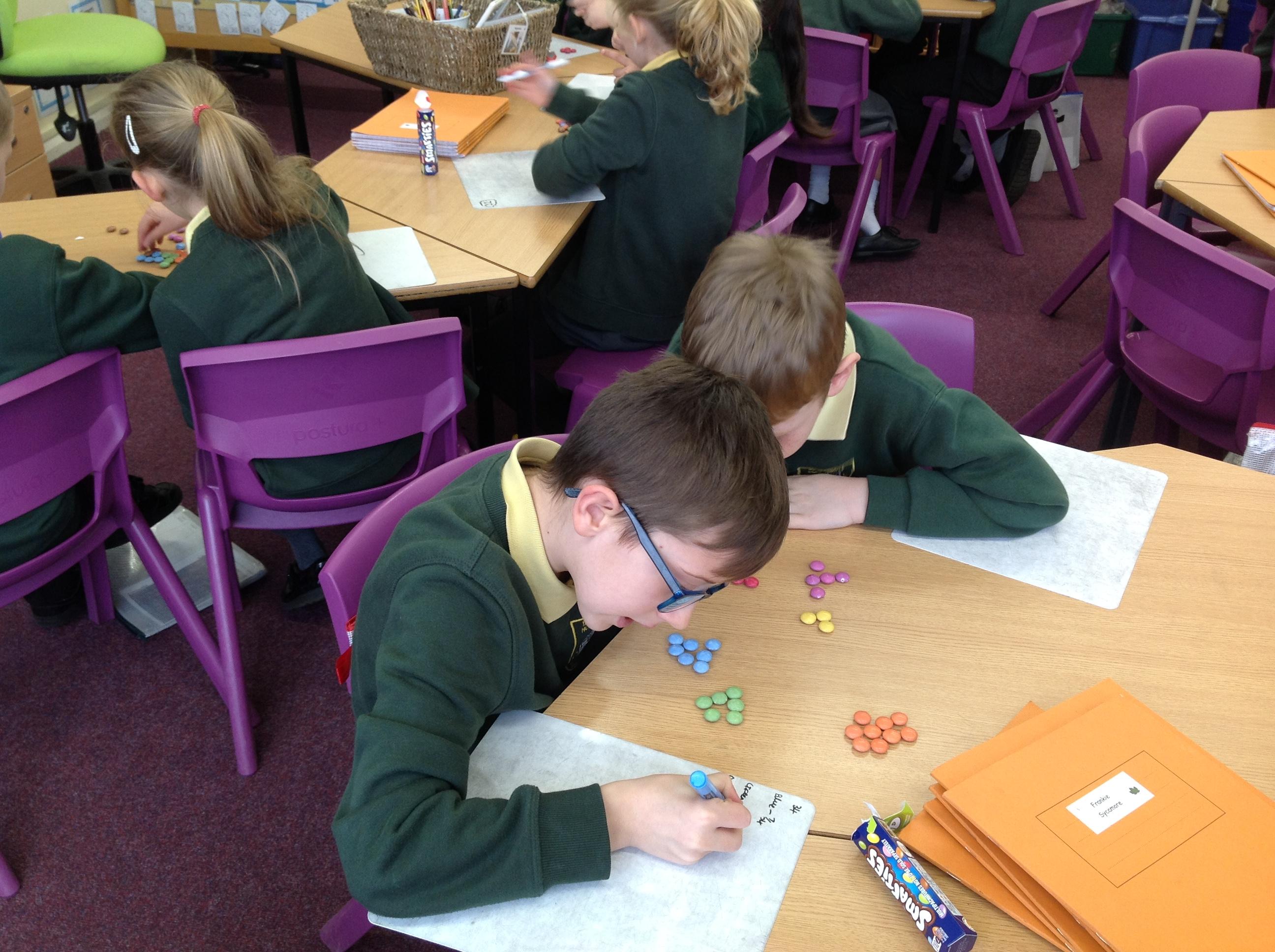 We have used smarties this week to help us with fractions of quantities! We had to decide what fraction of the packet each different colour was. We then asked each other some would you rather questions to see which fraction would give us the most smarties!