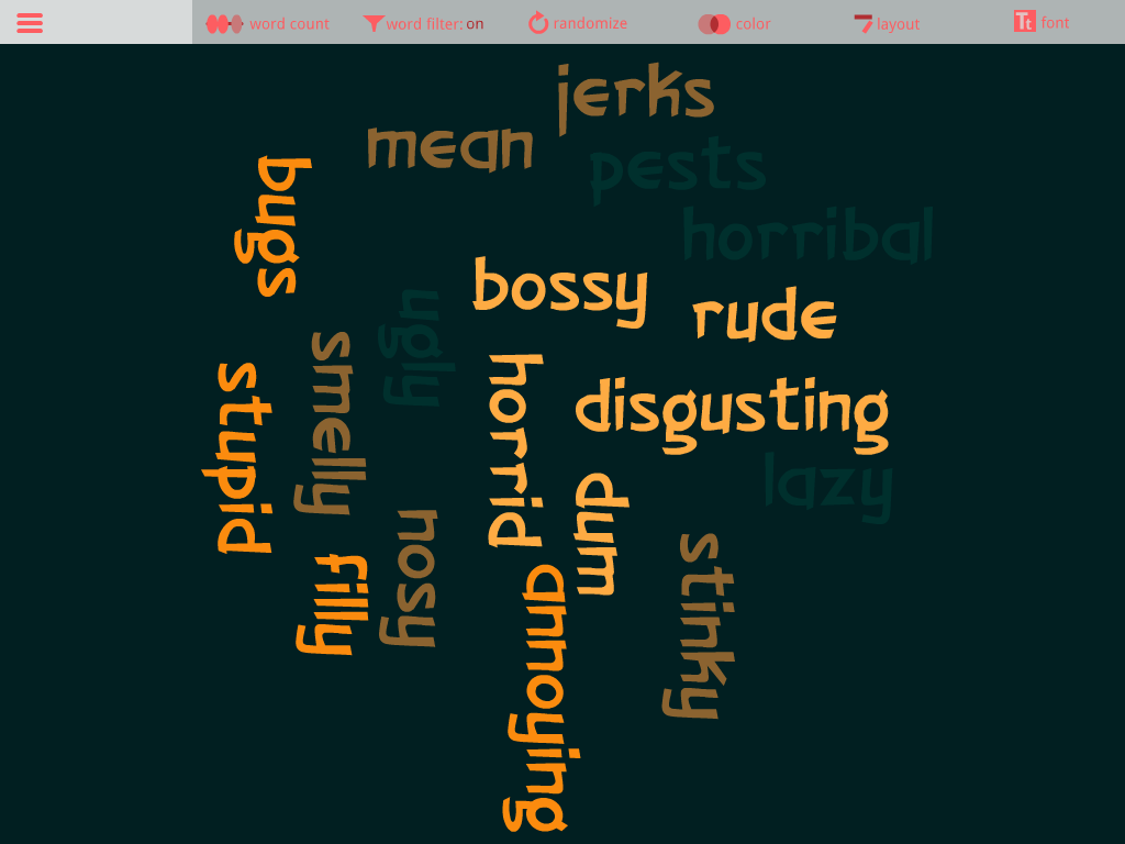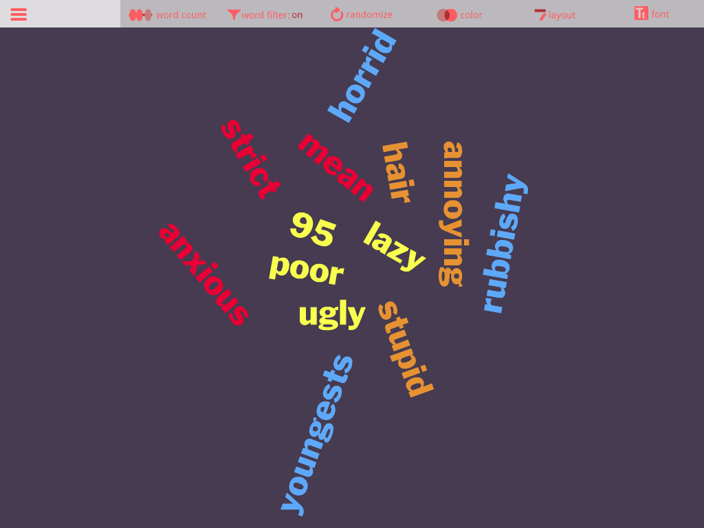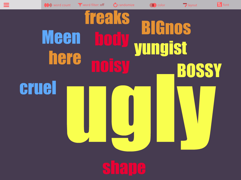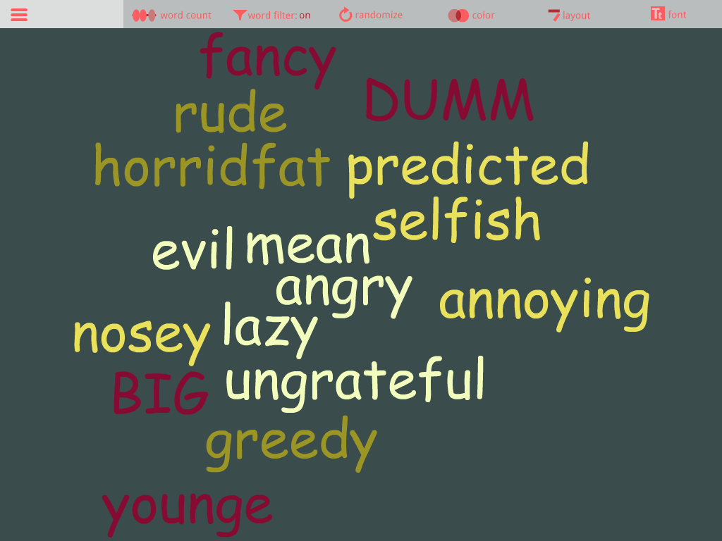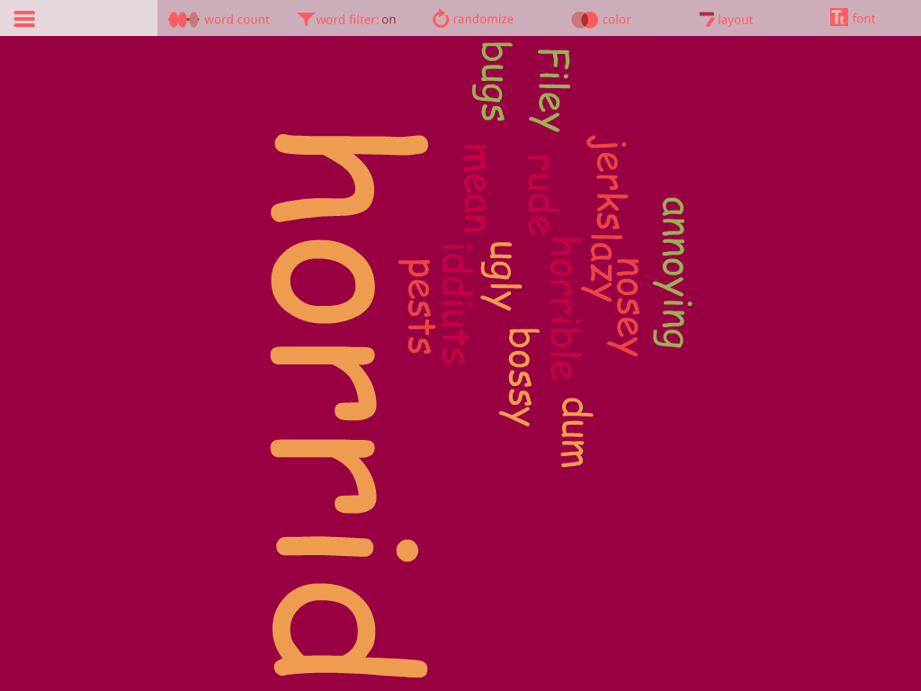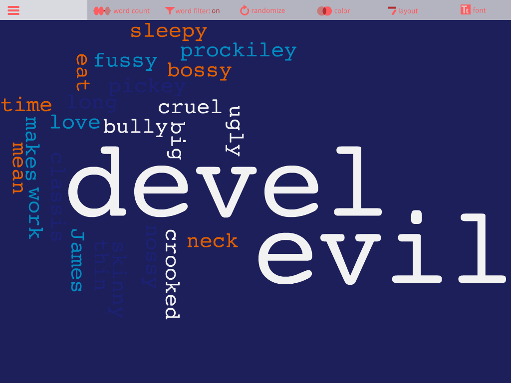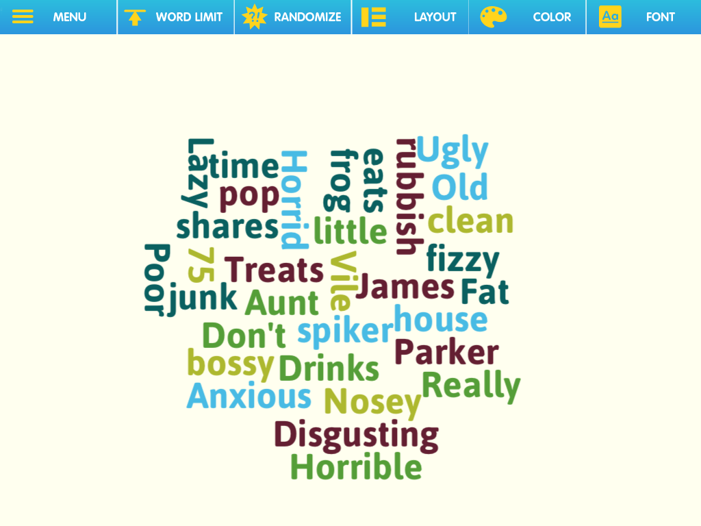 What evil Aunts James Trotter had? We've been learning how to use adjectives in character descriptions to be able to describe the delightful Aunt Spiker and Aunt Sponge! We collected adjectives into a Word Cloud and then decided on which layout and colours worked best for these evil creatures!