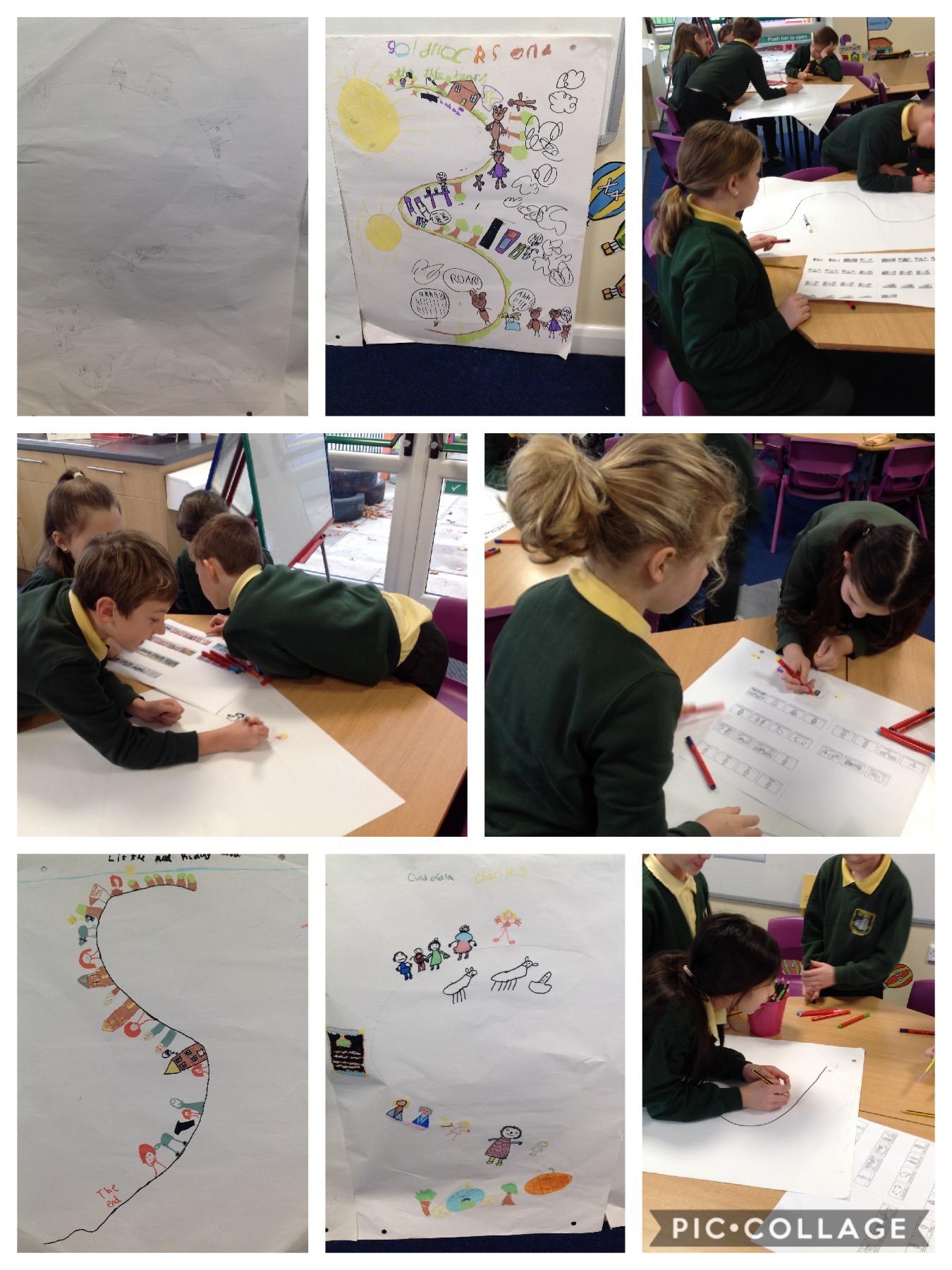 We created a Storymap for known fairy tales this week in preparation for writing our own. We had to think about the key characters and main parts of the story as we traced down the page.