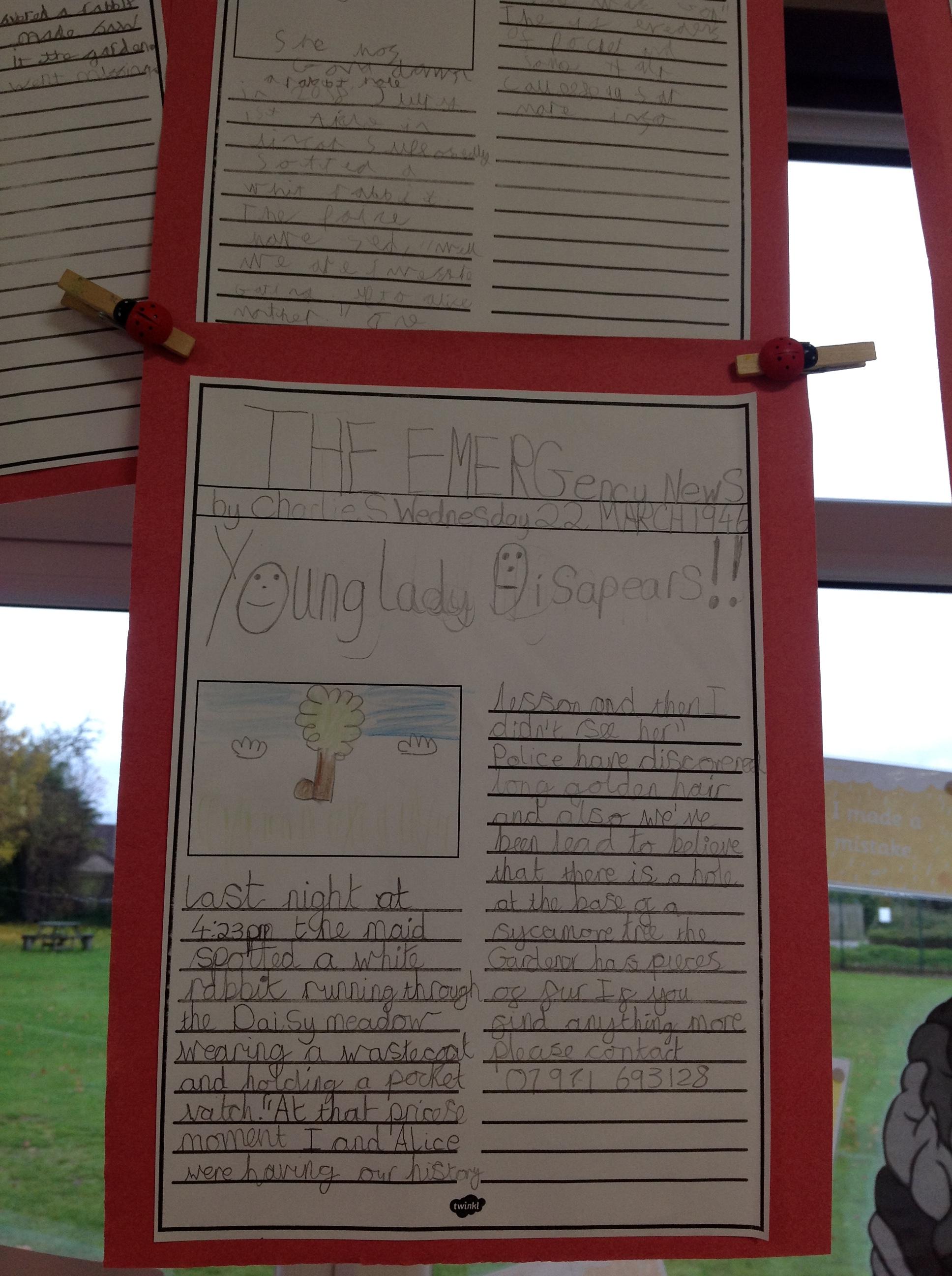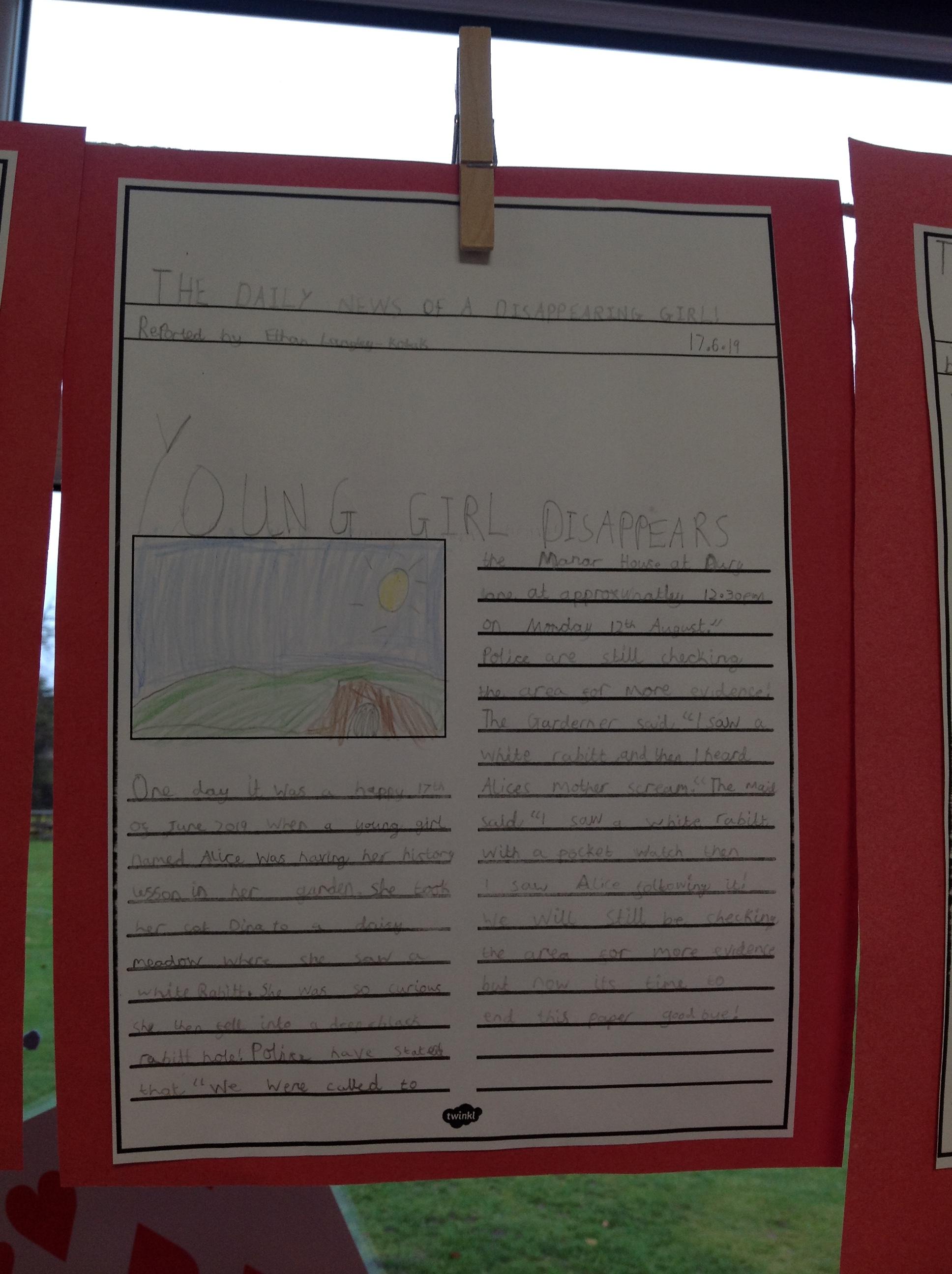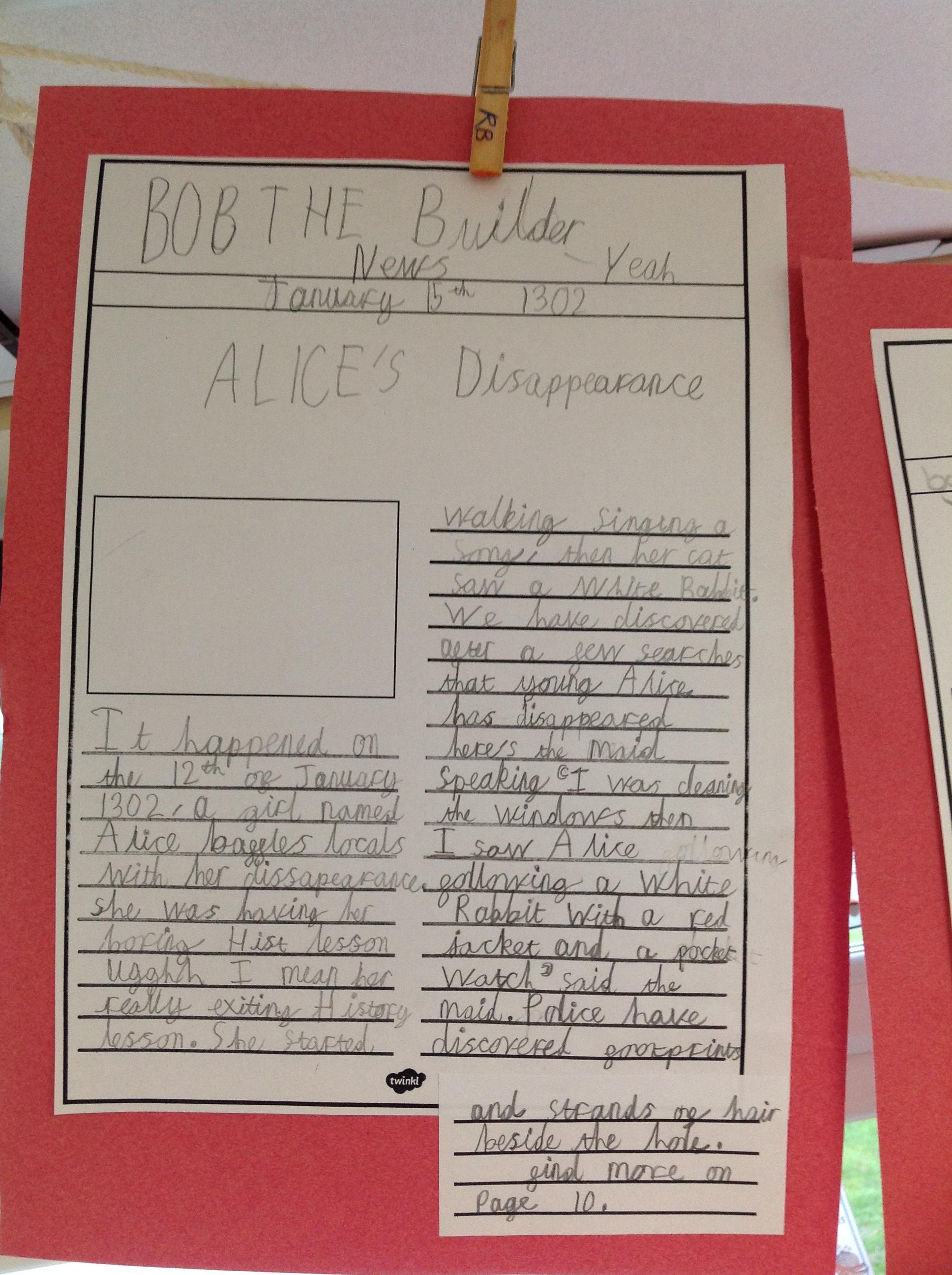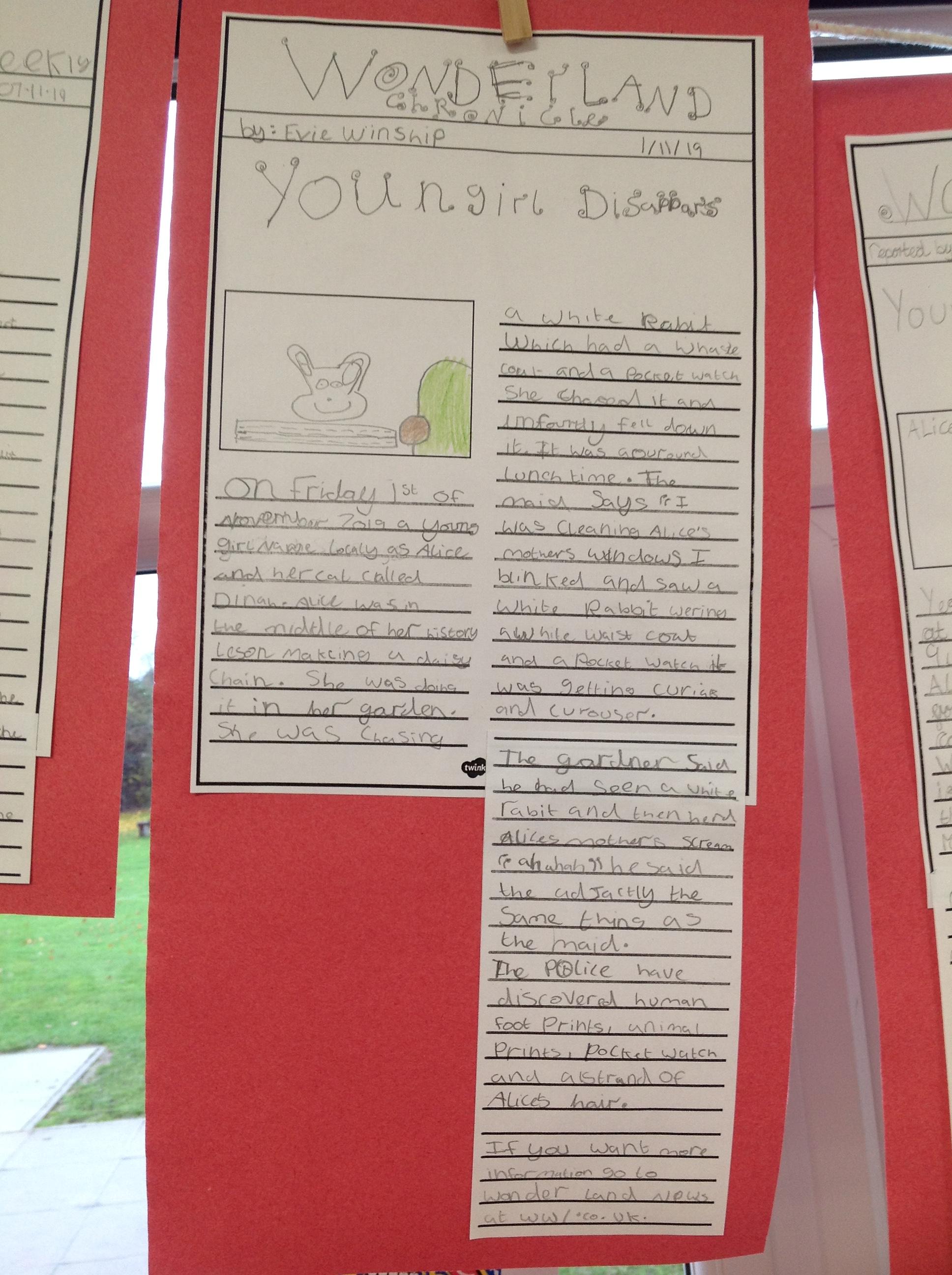 We've been learning all about Newspaper Reports this week and we've been building up to write our own based on Alice's mysterious disappearance down a rabbit hole! We had to examine the evidence and use some reporter sentence starters to help to keep us in the style of a Newspaper Journalist!