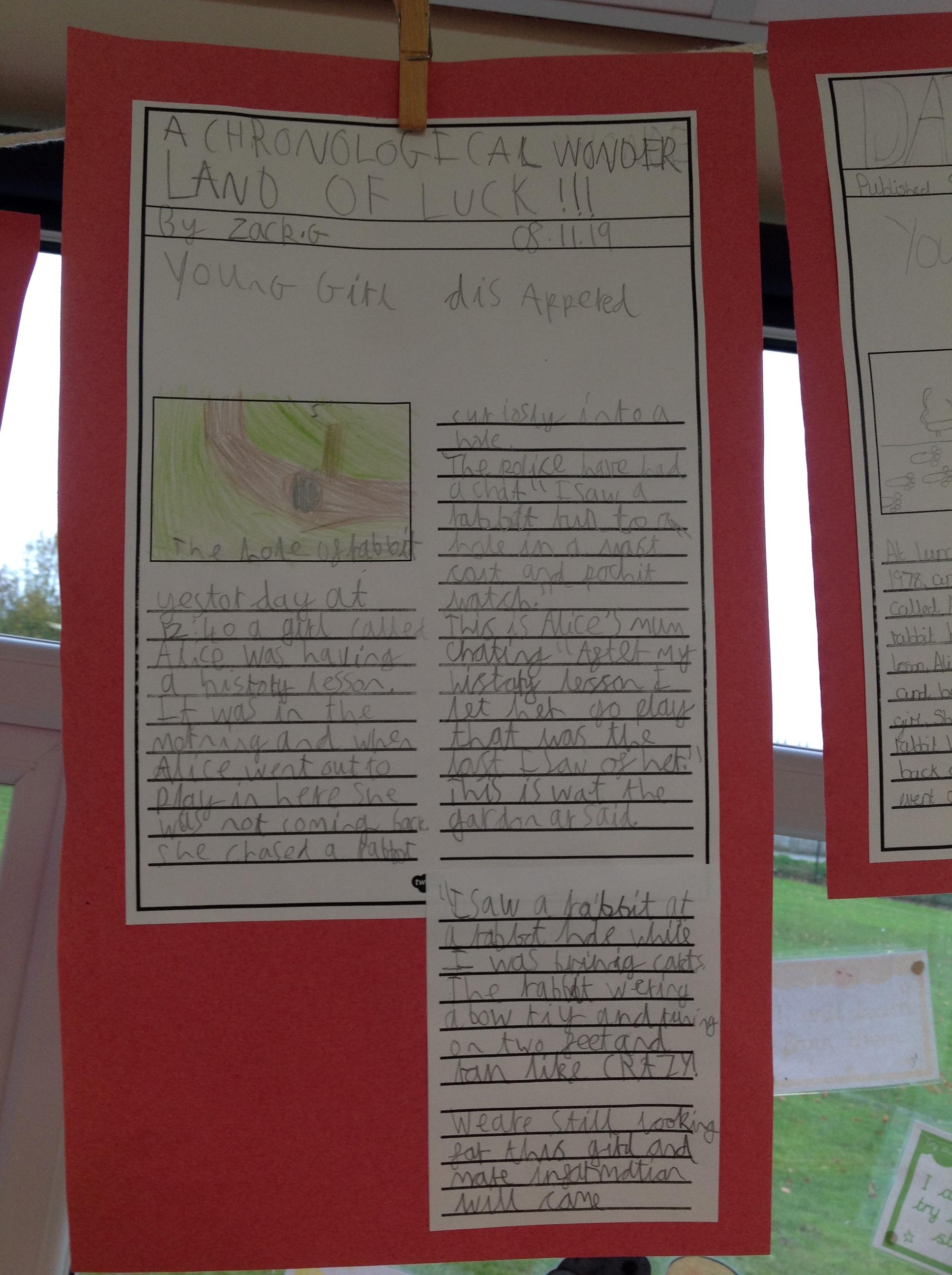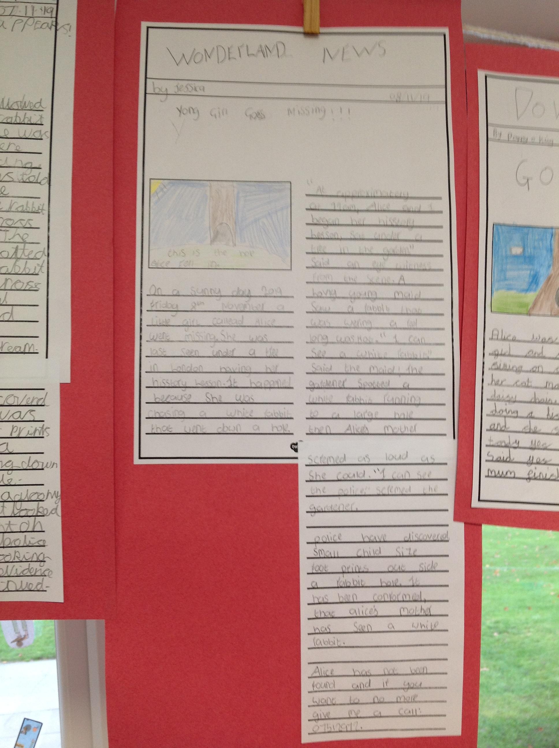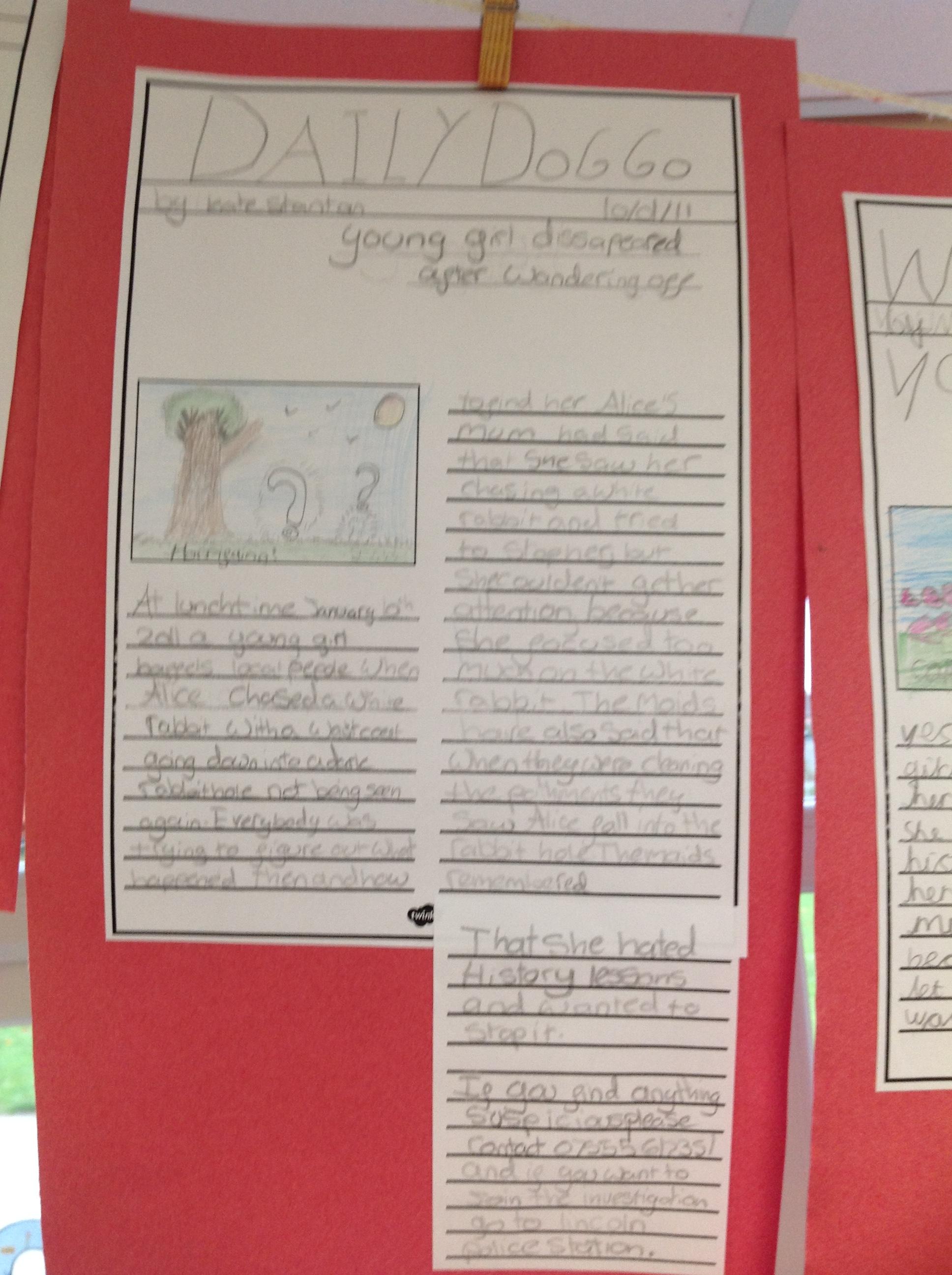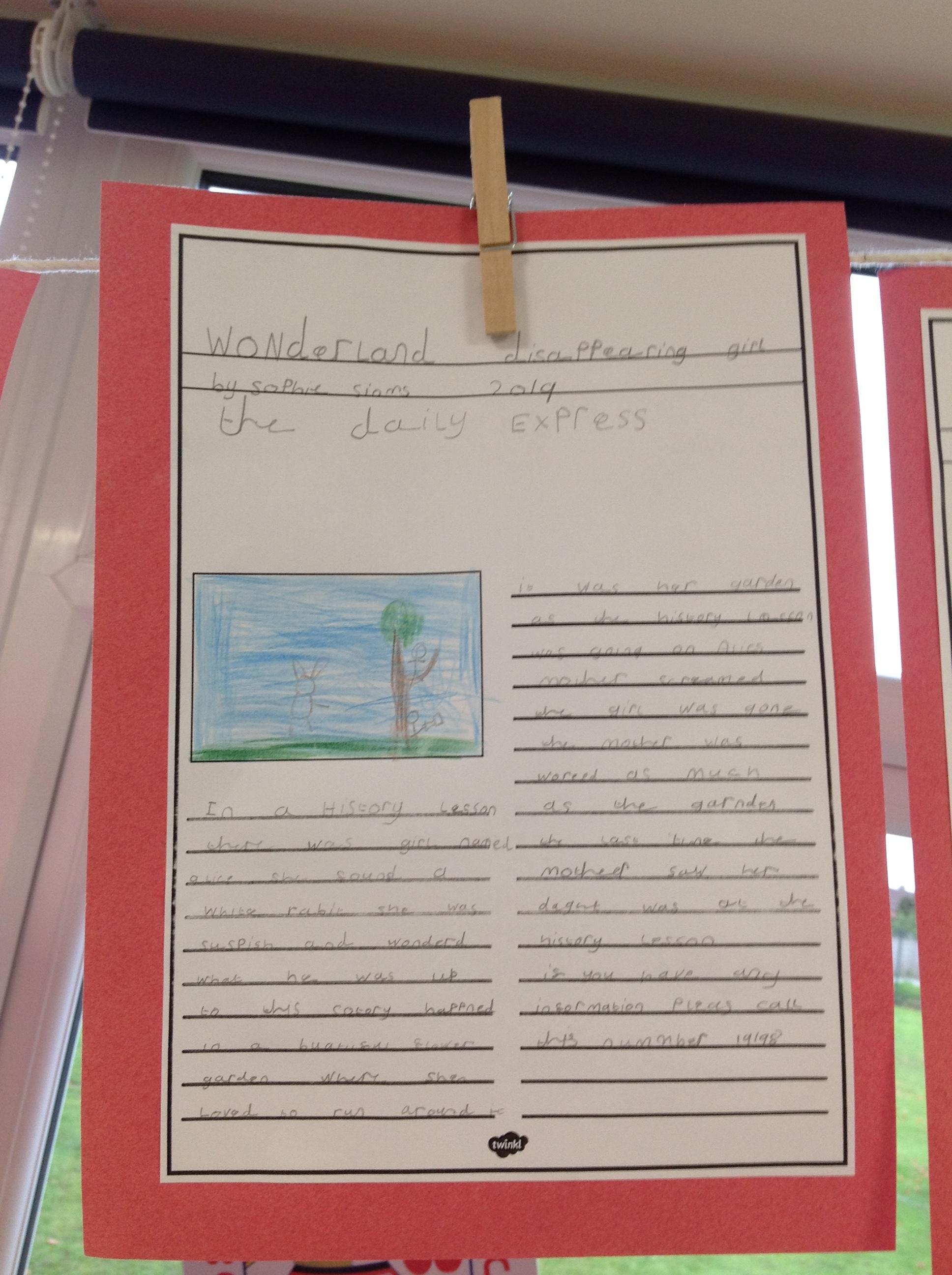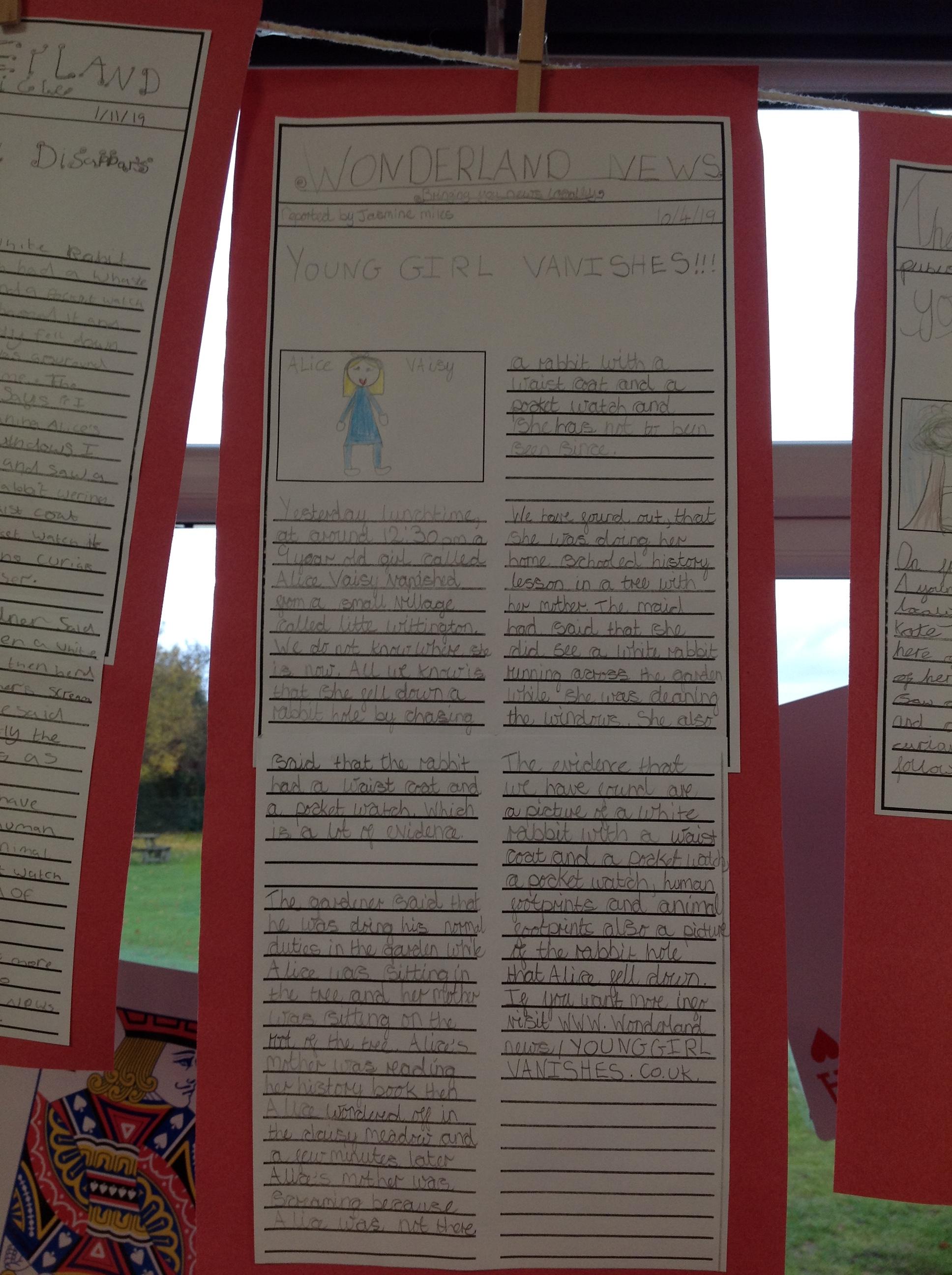 We've been learning all about Newspaper Reports this week and we've been building up to write our own based on Alice's mysterious disappearance down a rabbit hole! We had to examine the evidence and use some reporter sentence starters to help to keep us in the style of a Newspaper Journalist!