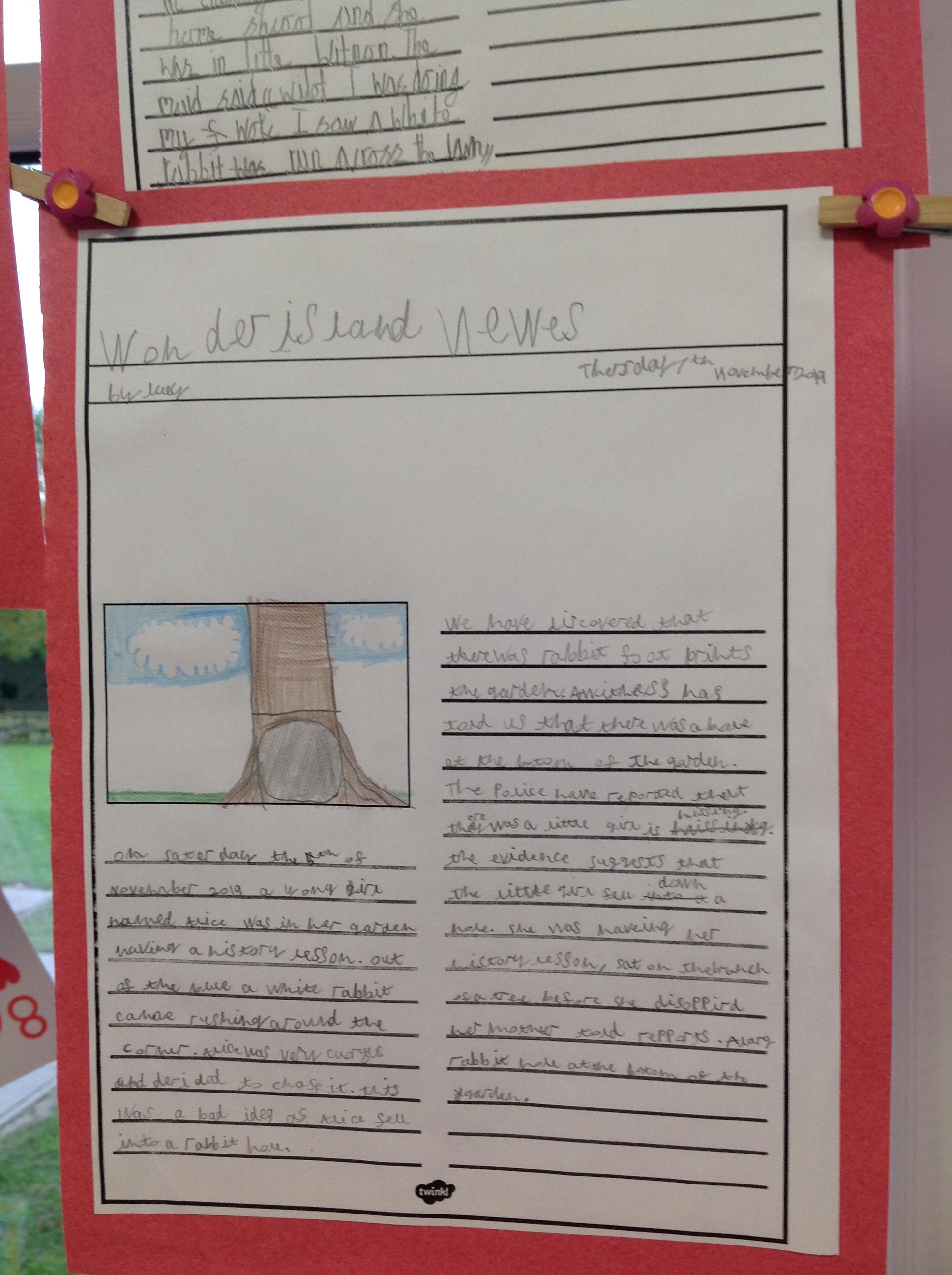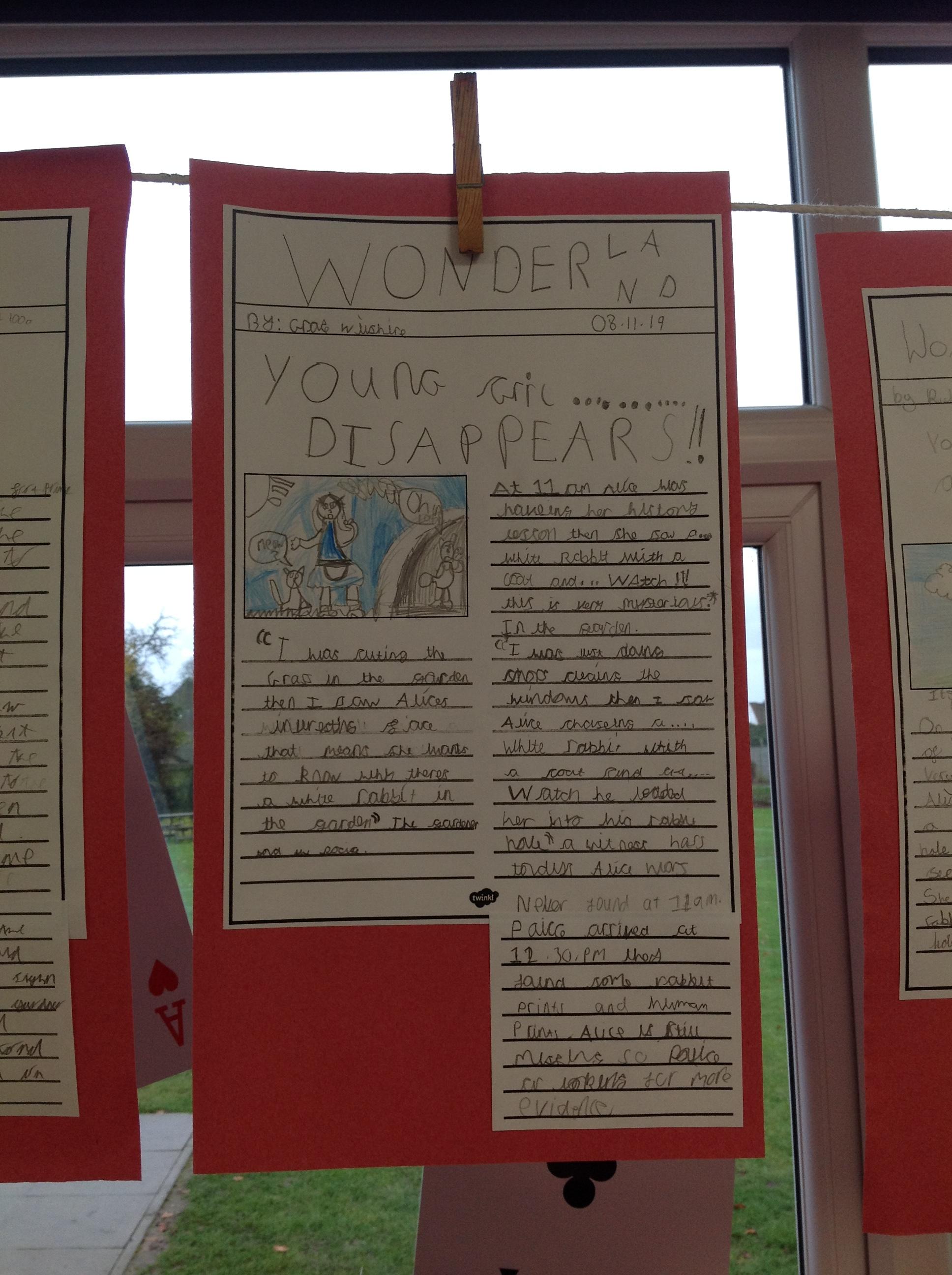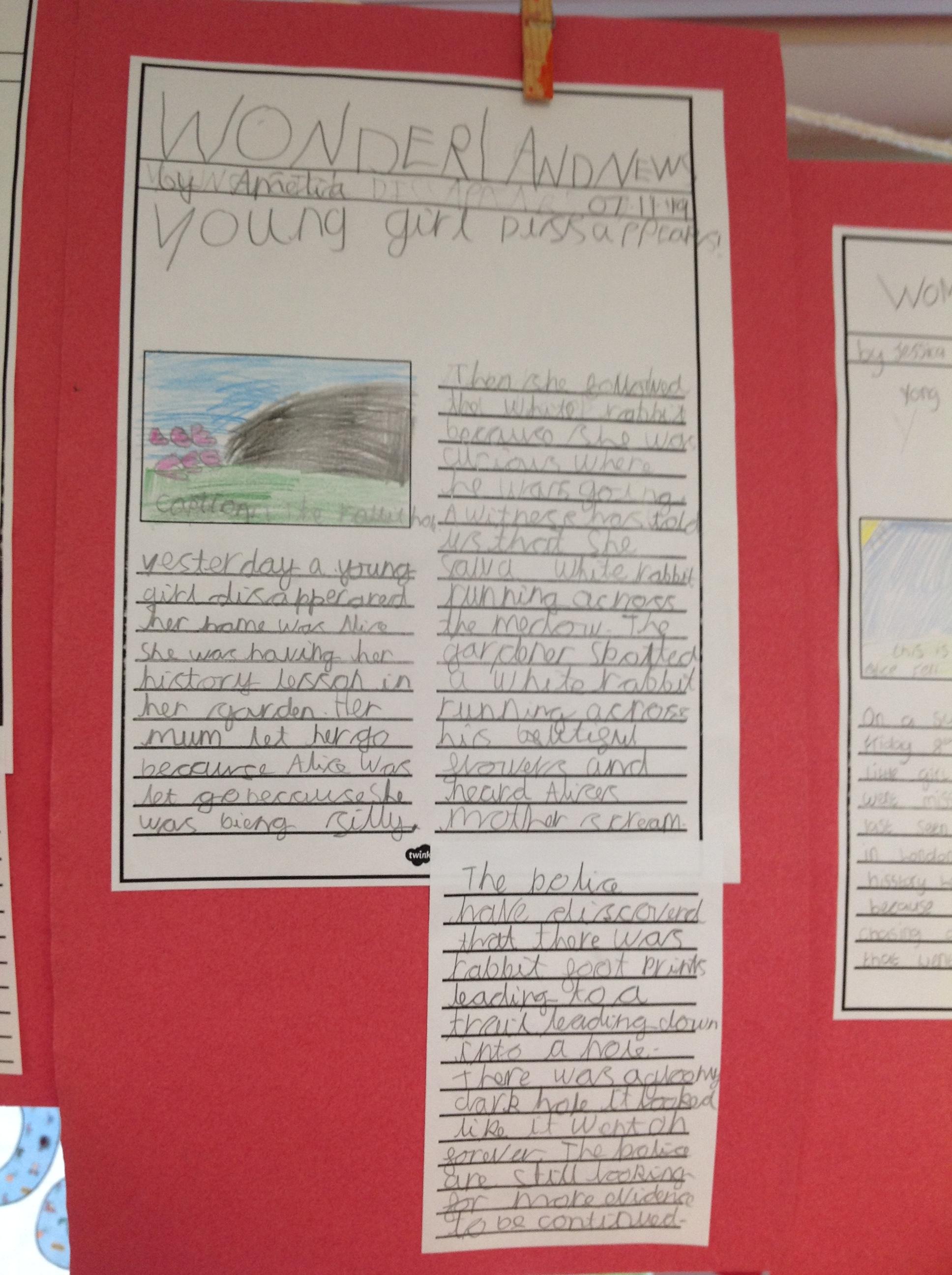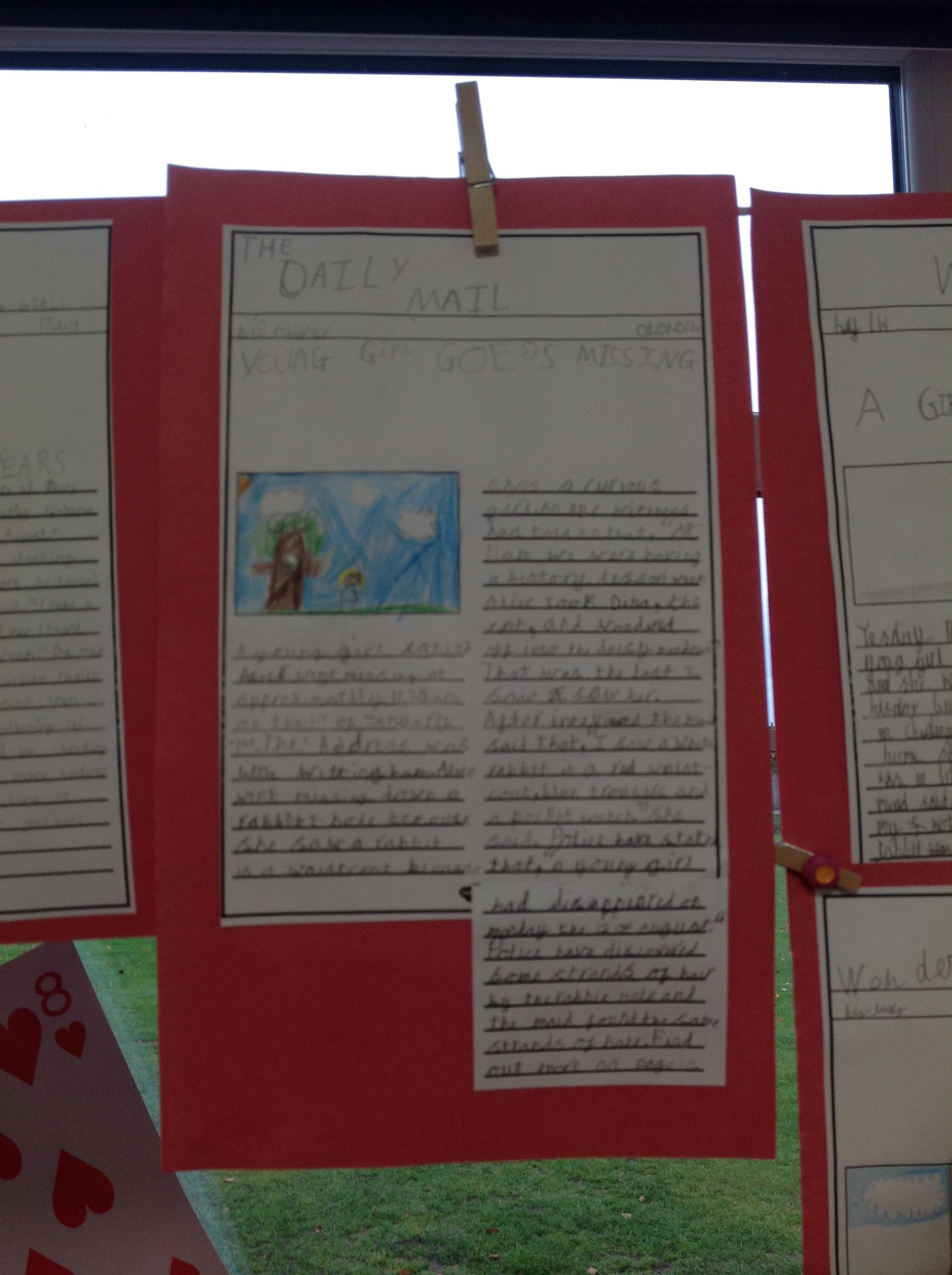 We've been learning all about Newspaper Reports this week and we've been building up to write our own based on Alice's mysterious disappearance down a rabbit hole! We had to examine the evidence and use some reporter sentence starters to help to keep us in the style of a Newspaper Journalist!
