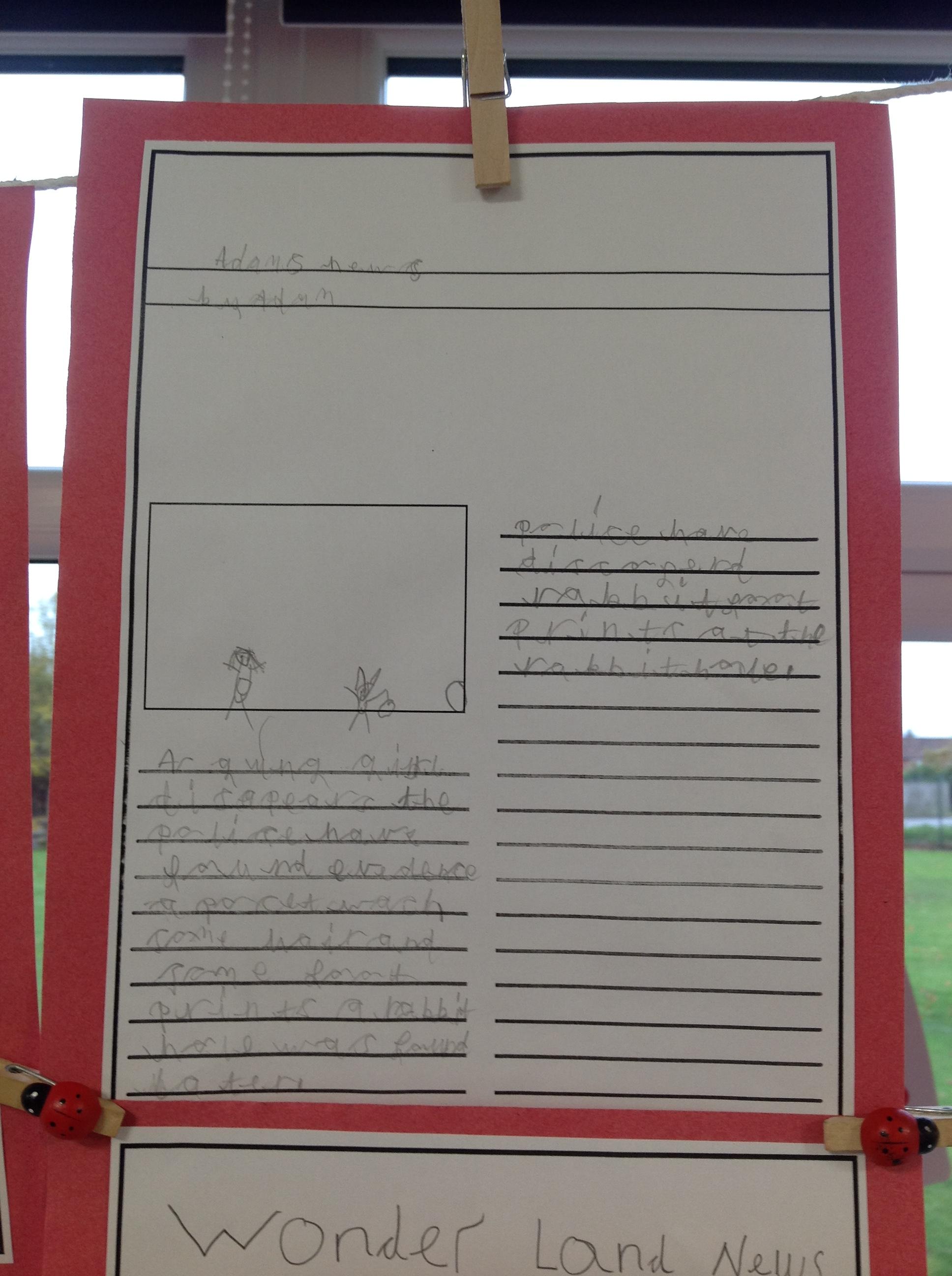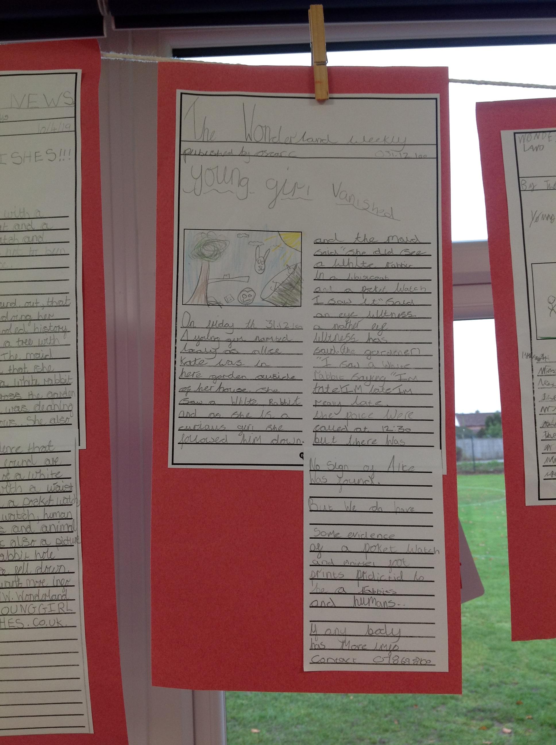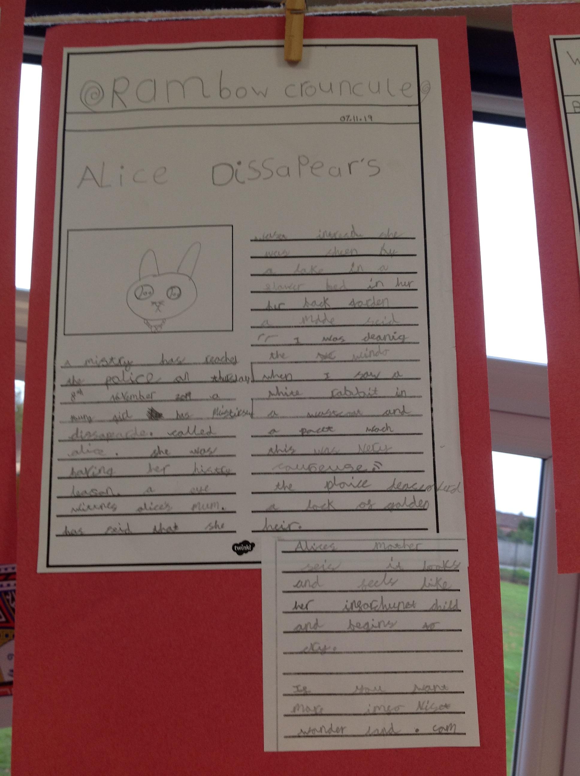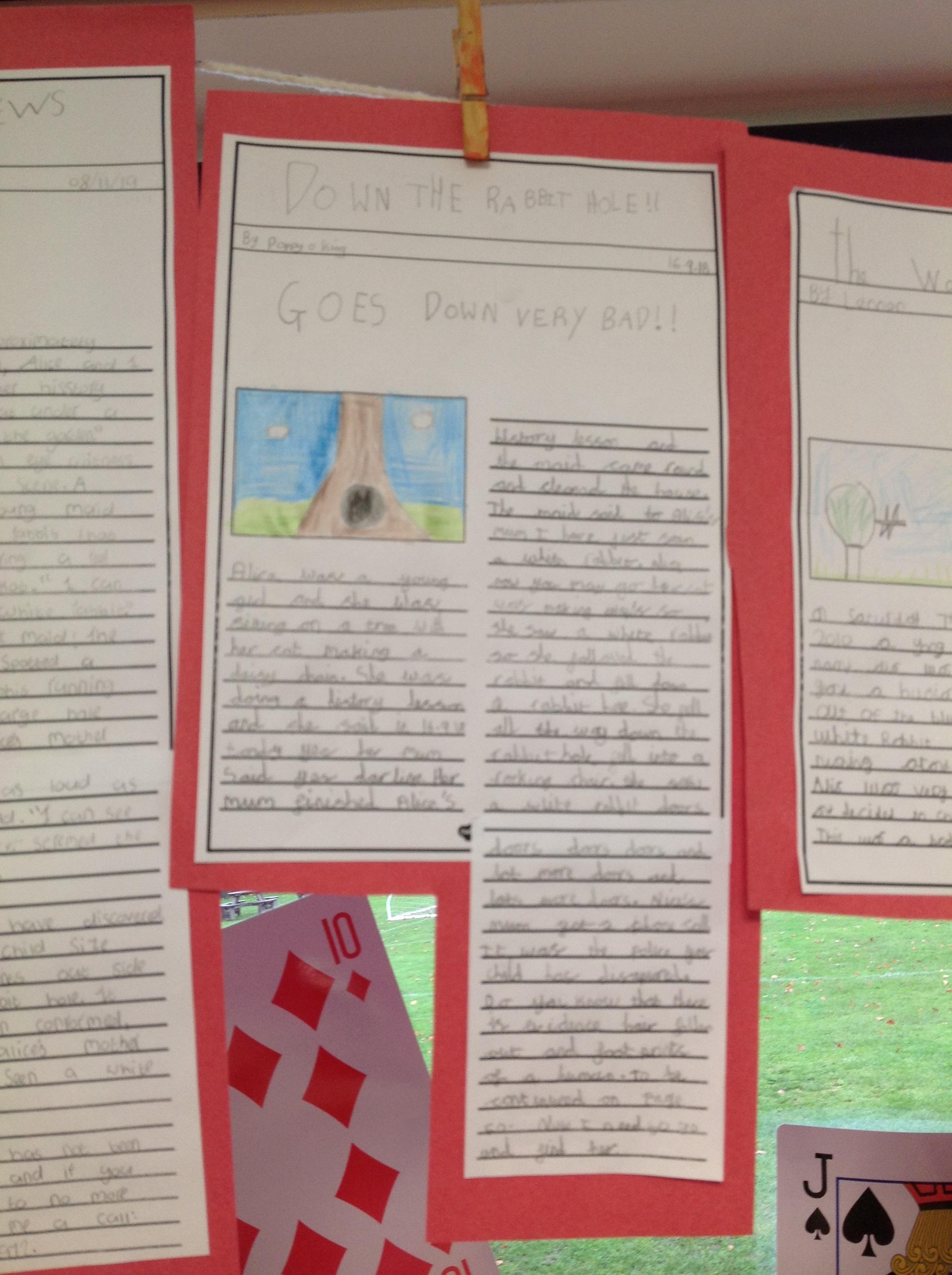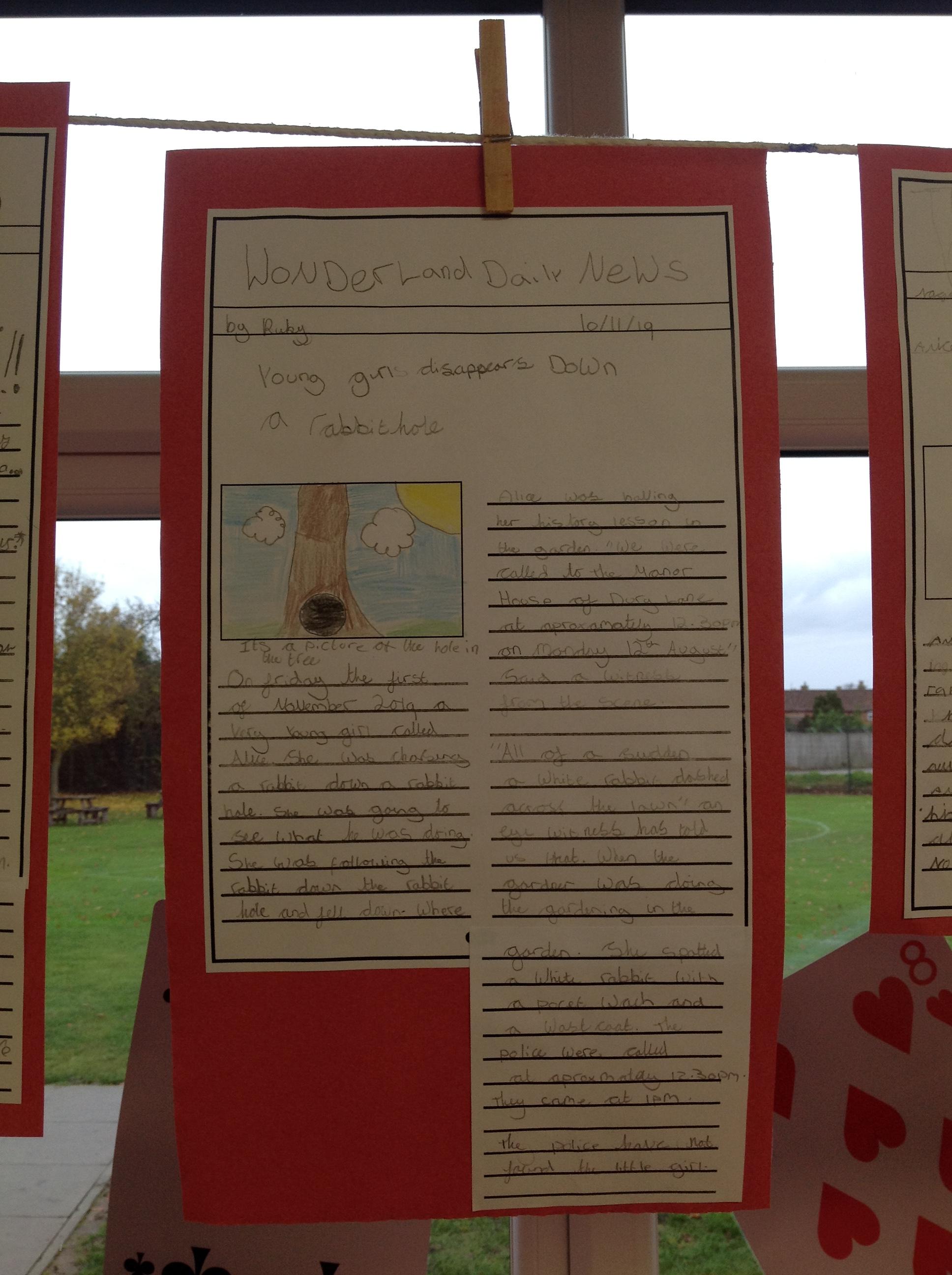 We've been learning all about Newspaper Reports this week and we've been building up to write our own based on Alice's mysterious disappearance down a rabbit hole! We had to examine the evidence and use some reporter sentence starters to help to keep us in the style of a Newspaper Journalist!