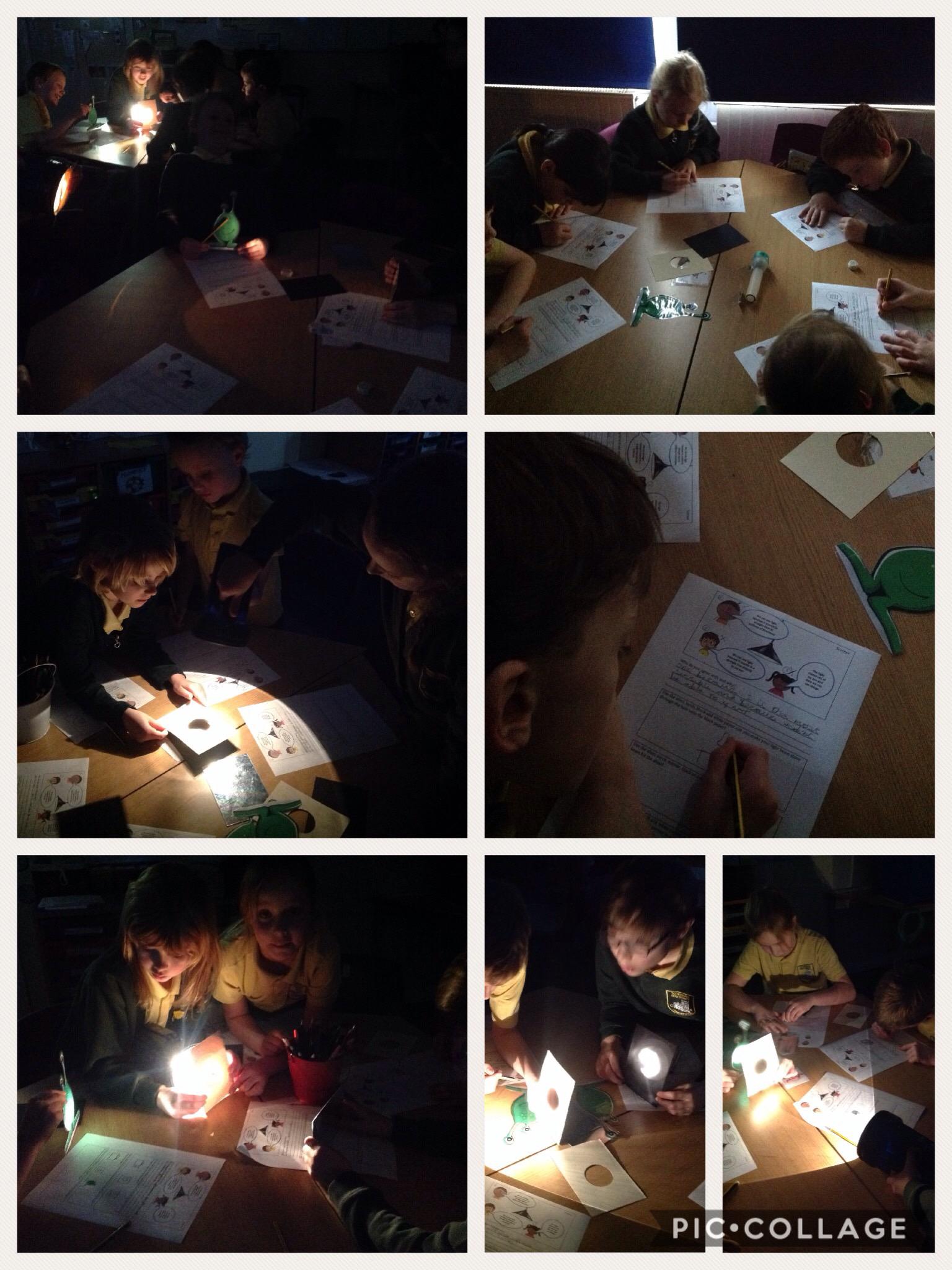 Today we learnt how light travels. We thought about how it travels in straight lines in millions of directions. We then had to use a torch, piece of paper with a hole in and a mirror to zap the alien at different angles!