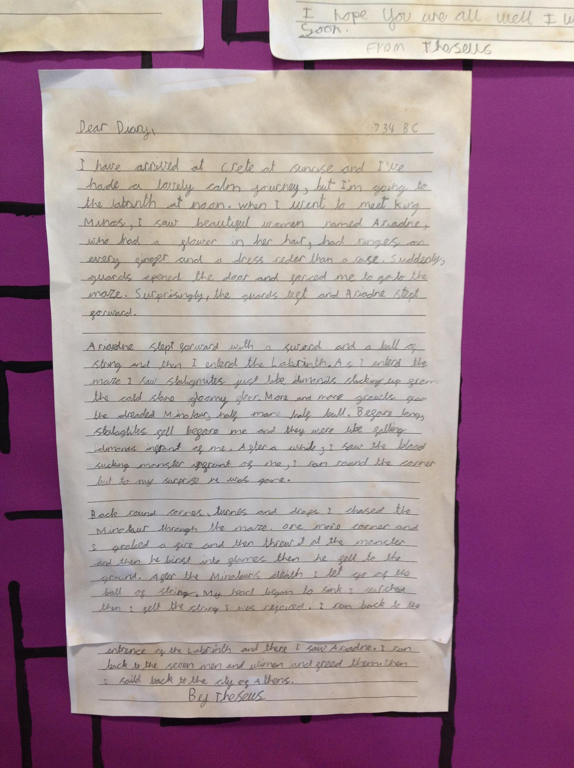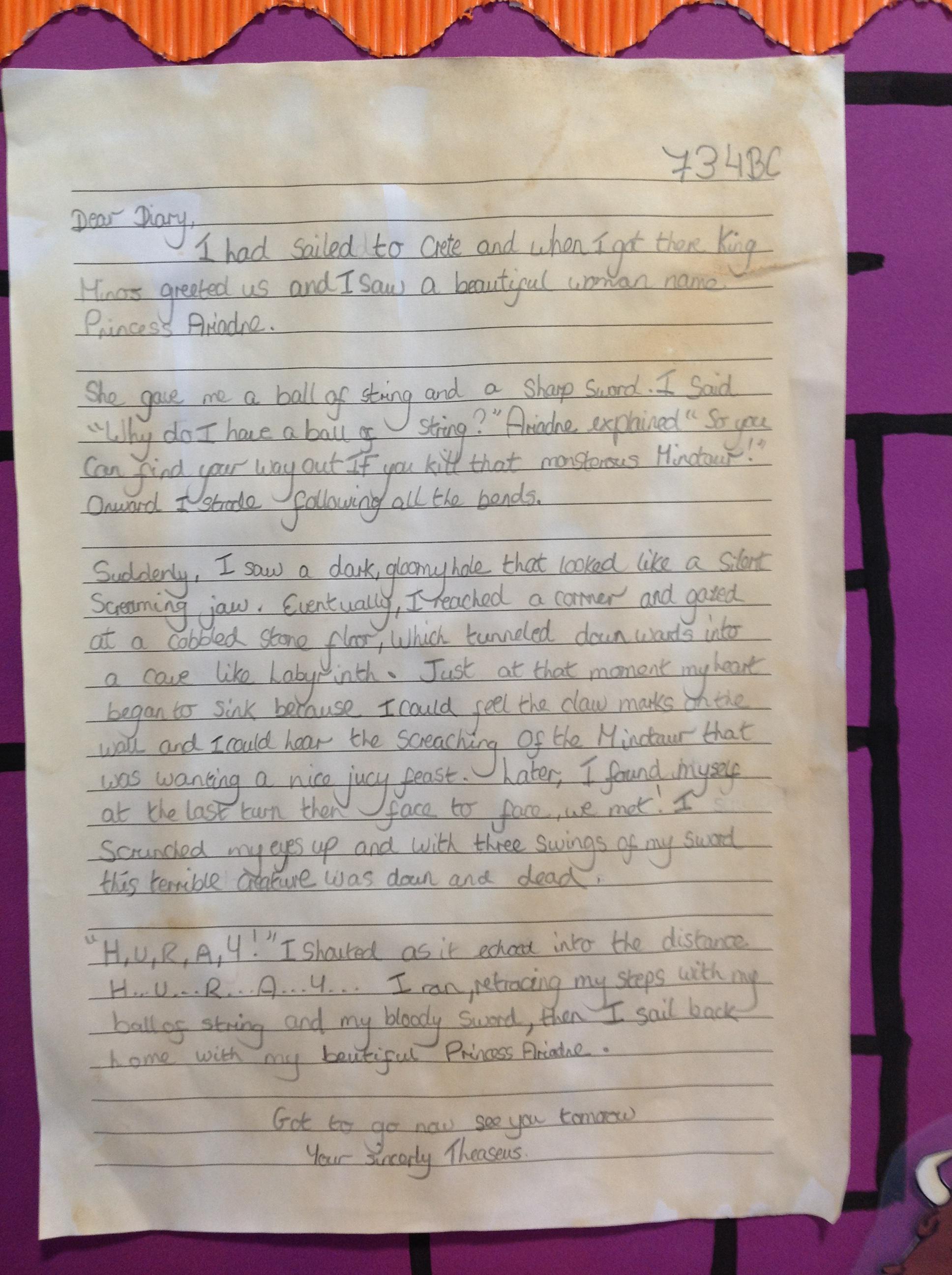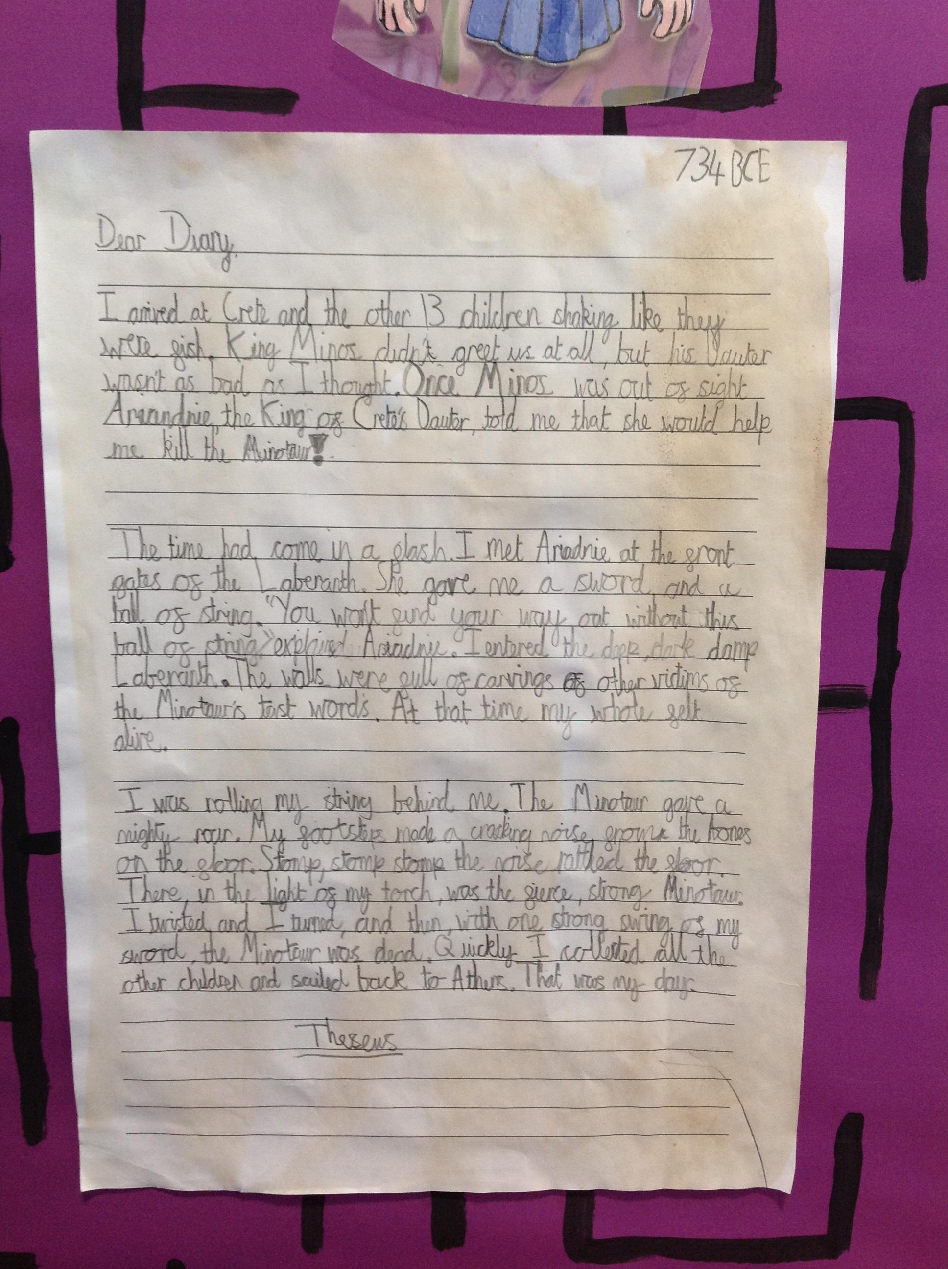 We've had a brilliant writing topic learning all about the Greek myth of Theseus and the Minotaur! We have written a diary entry as Theseus on the day he entered the maze. We have loved learning about this story and worked really hard on making sure that our diary entries had all the key features!