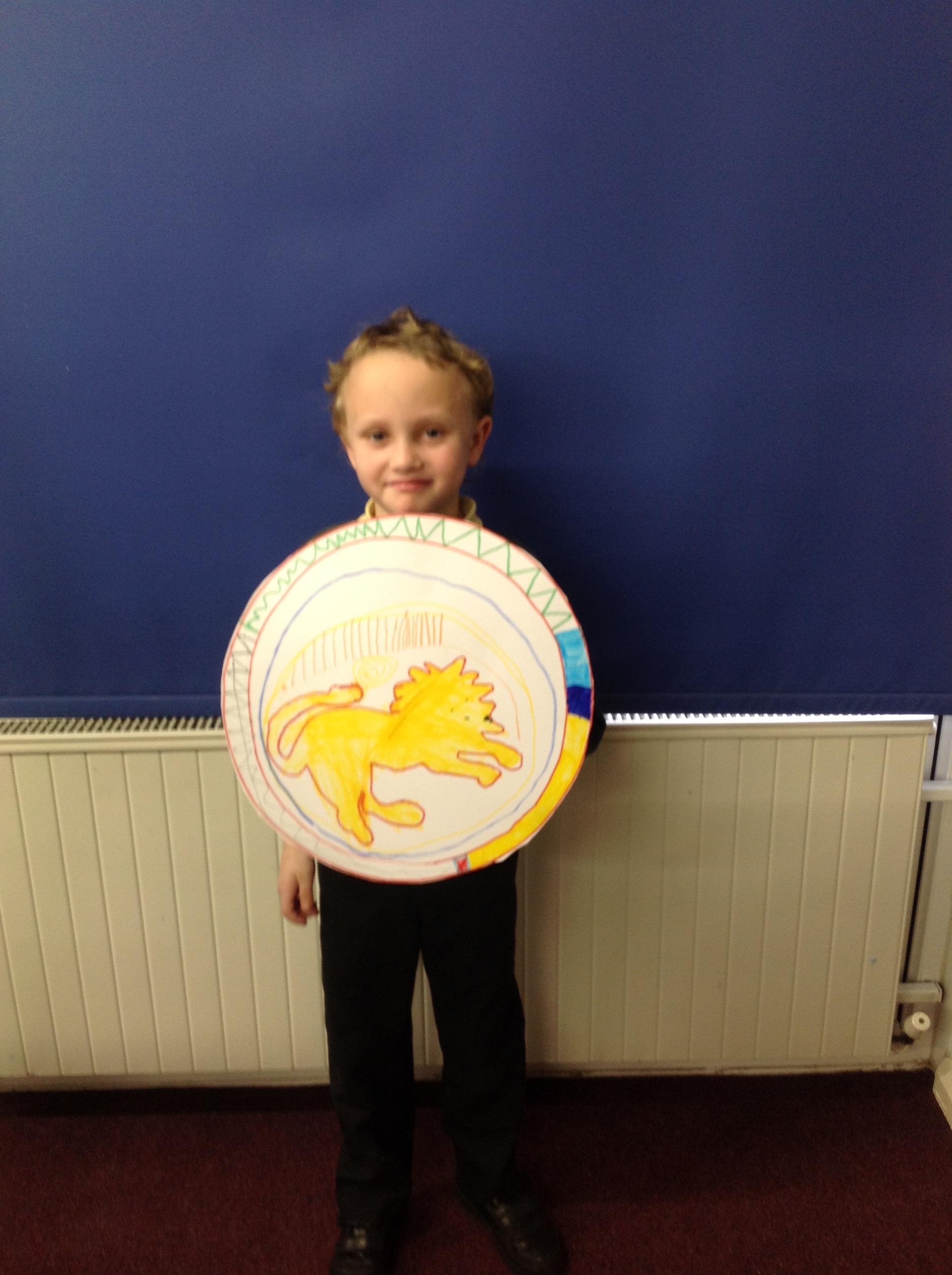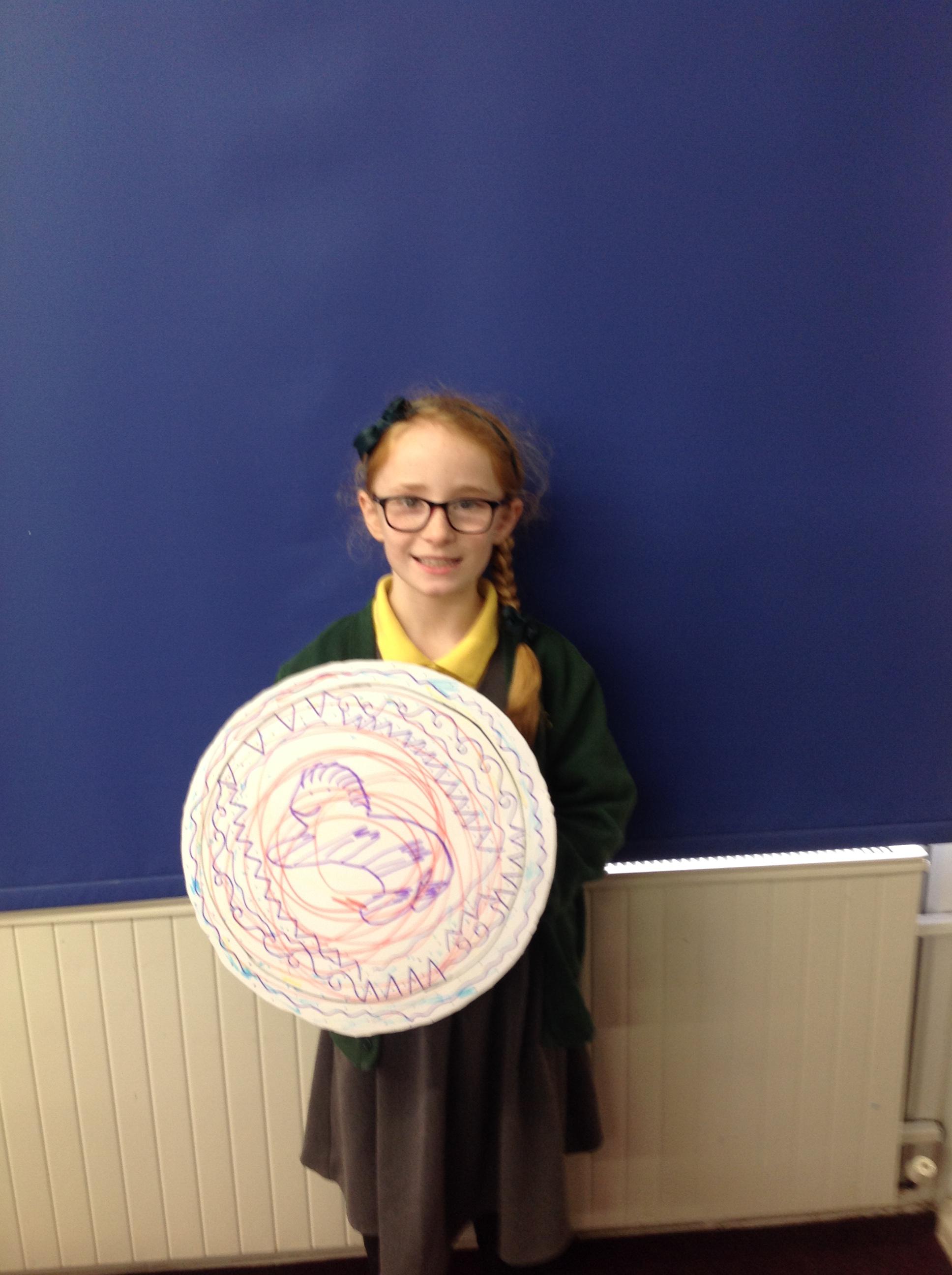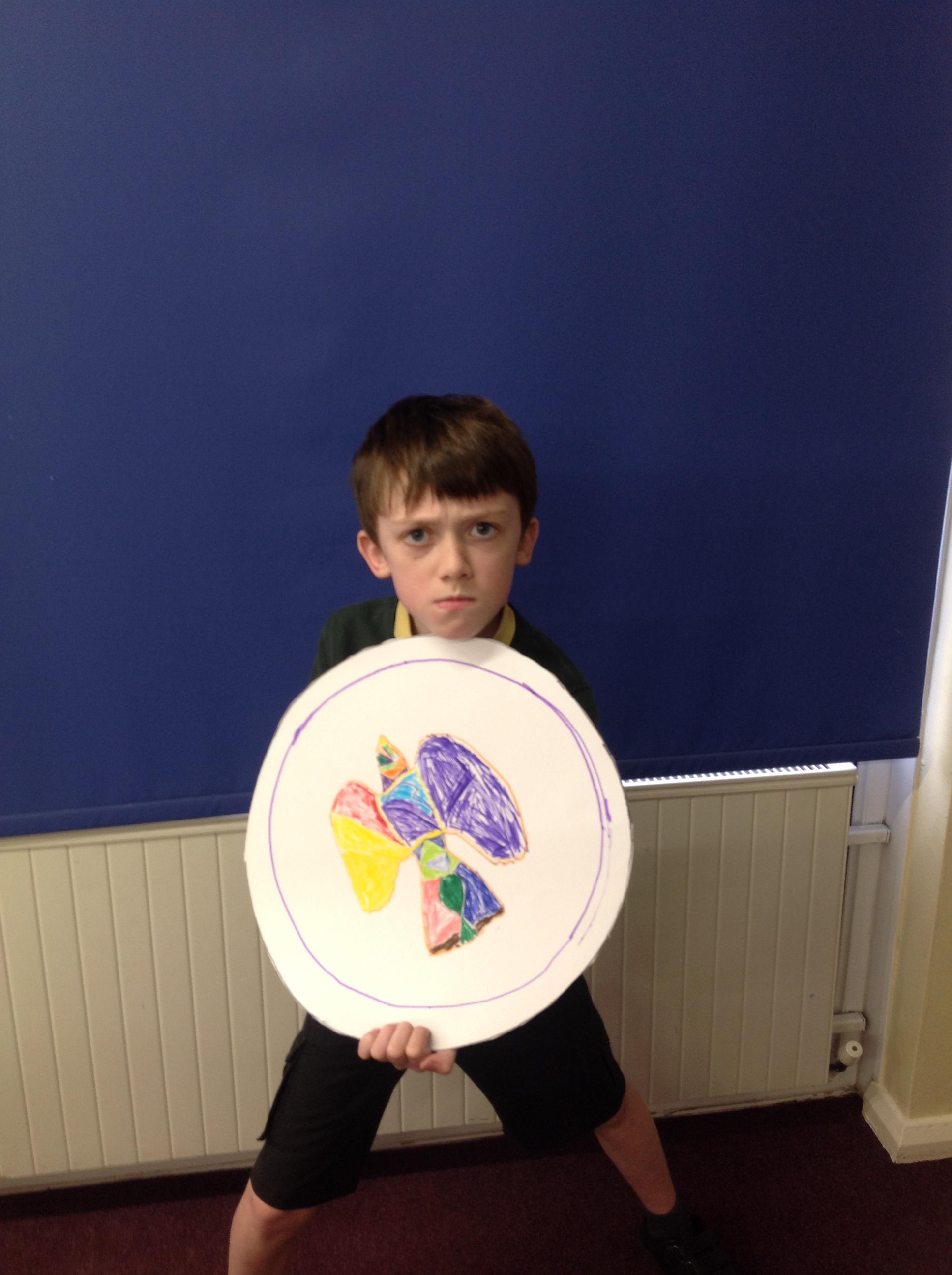 We started our Greek shields at the Collection and finished them off this week. We completed our patterns and central design. Then we attached our arm holders to the back. We look very warrior like!