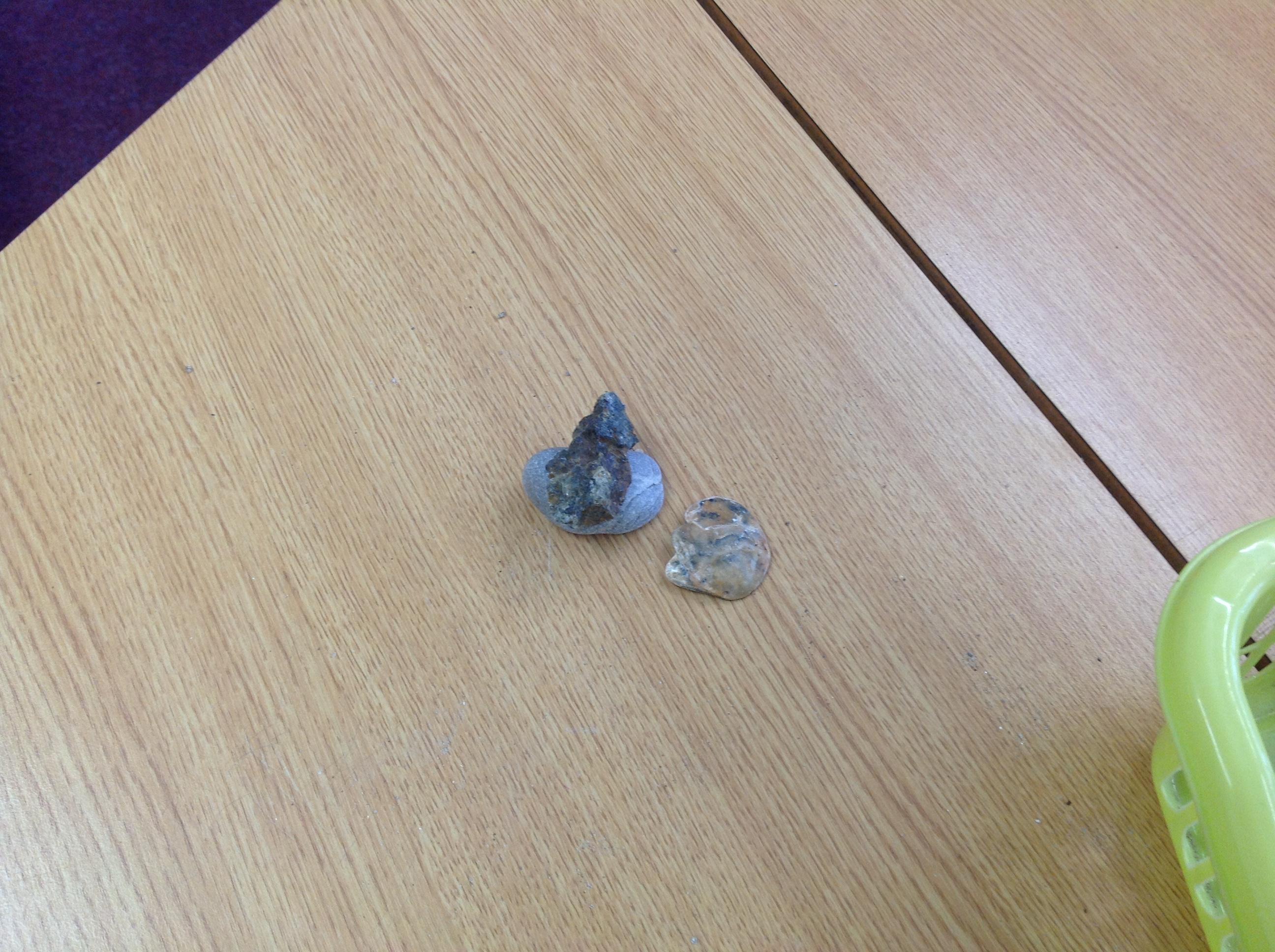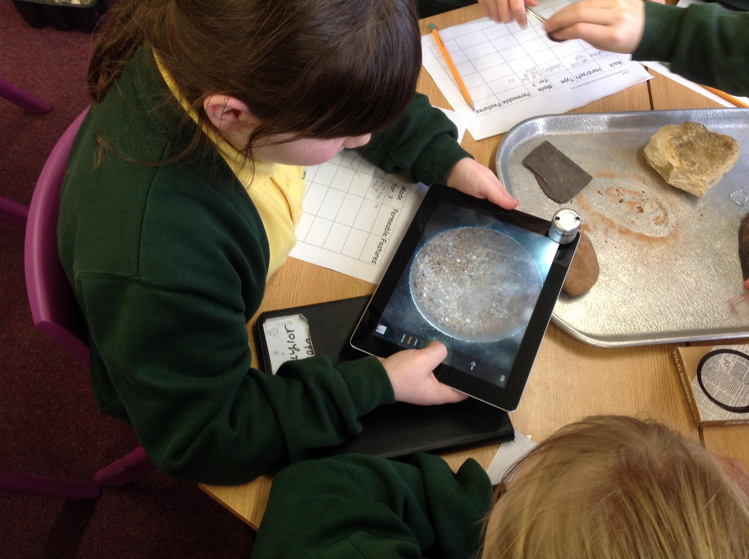 We used the magnifying glasses on the iPads to look closer at the formation of some of the different types of rocks. We noticed spirals and patterns in the rocks, as well as layers and holes in different parts!