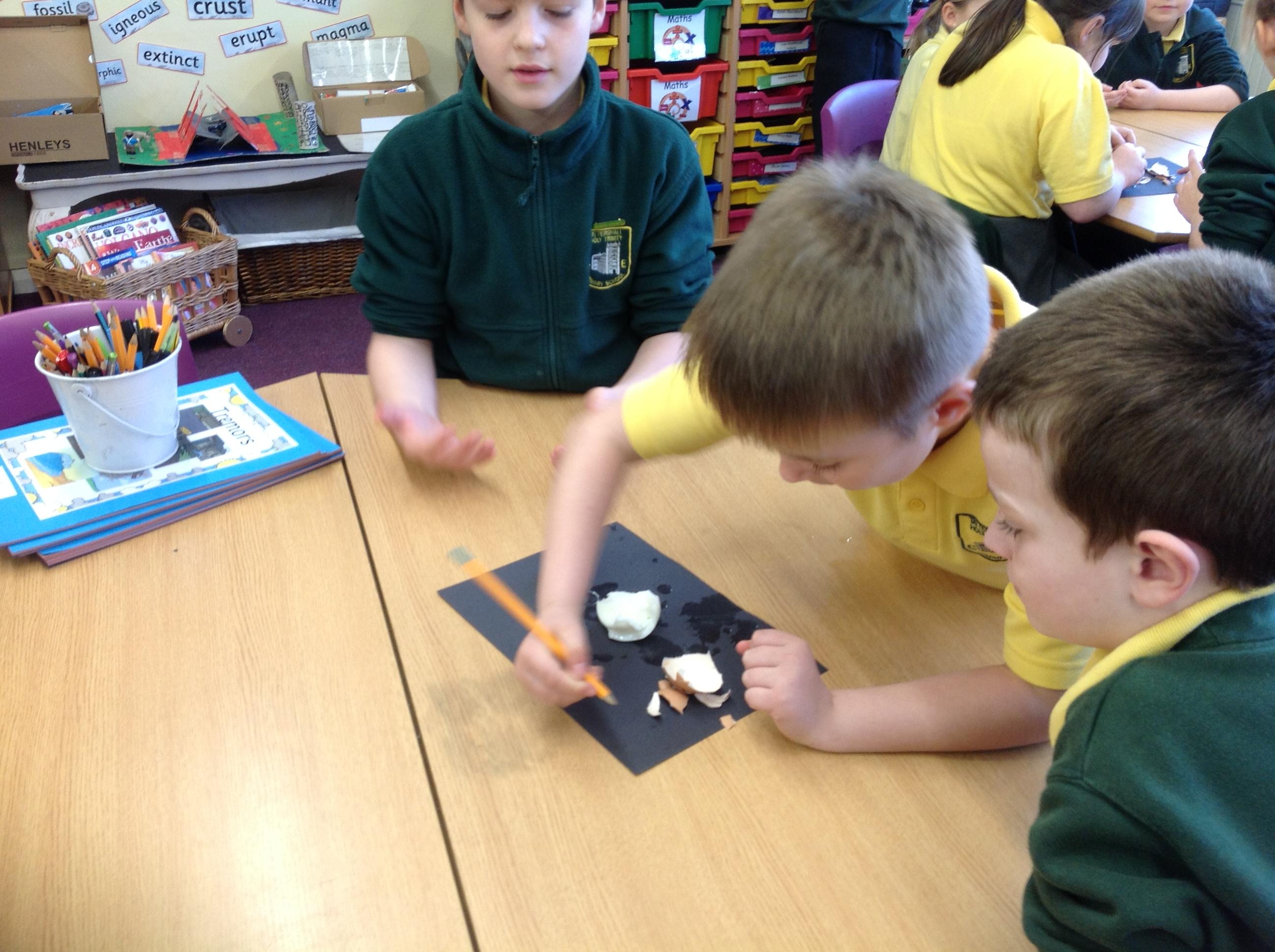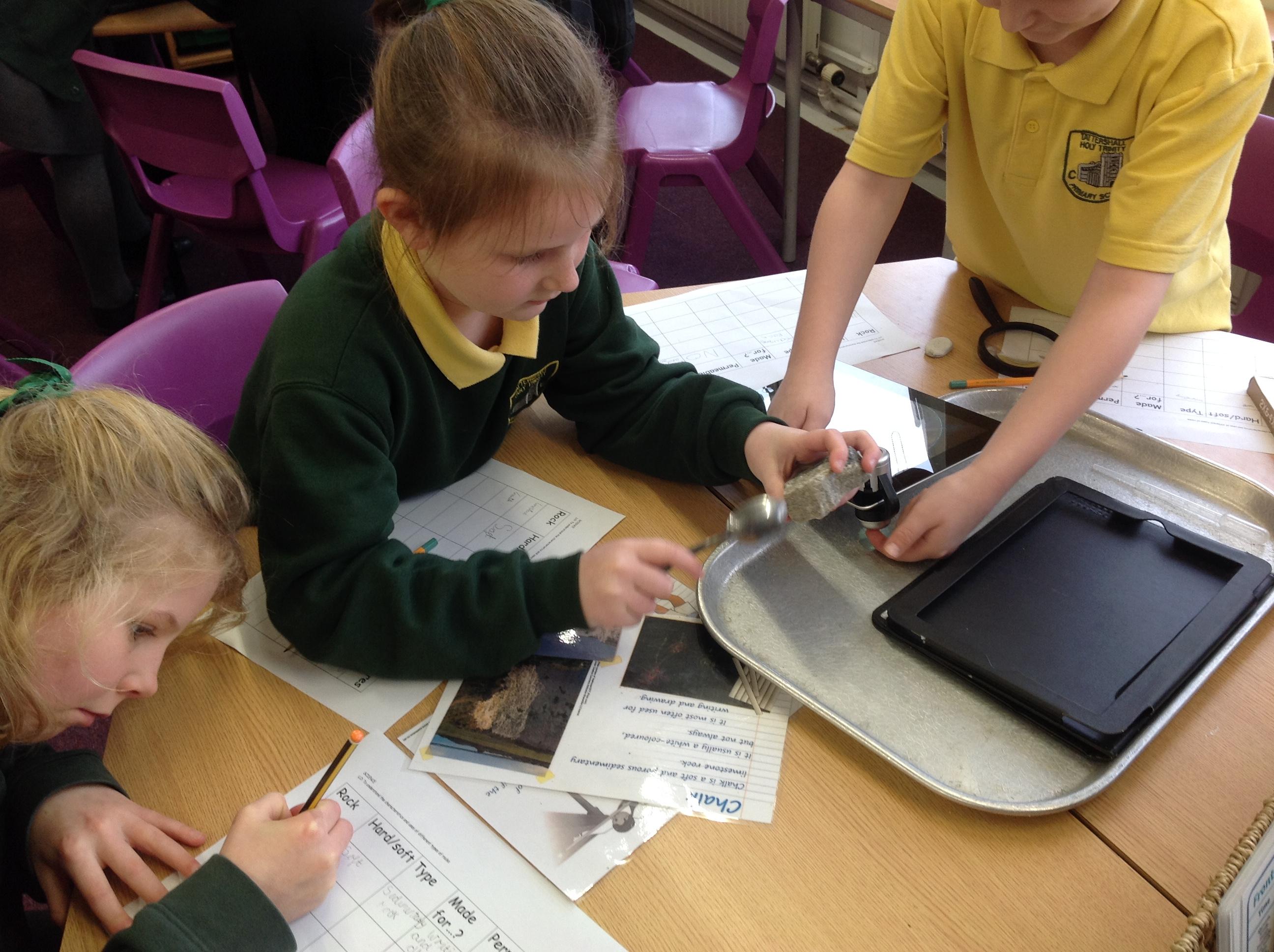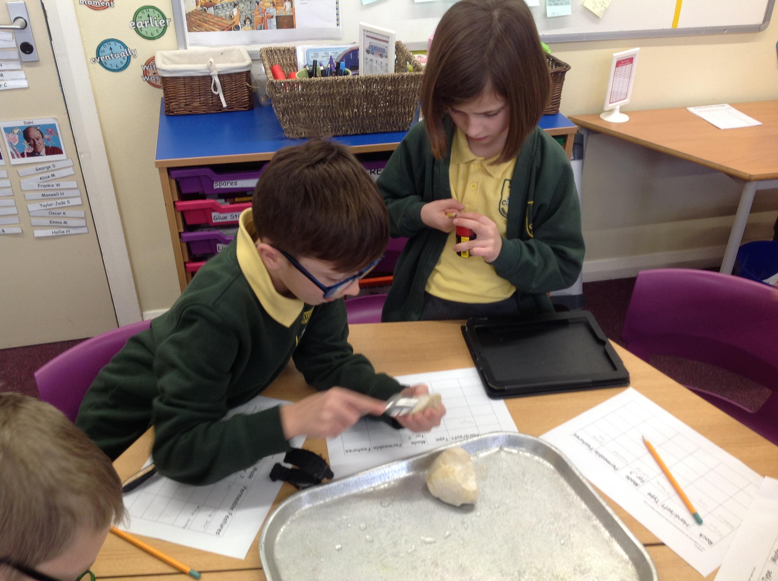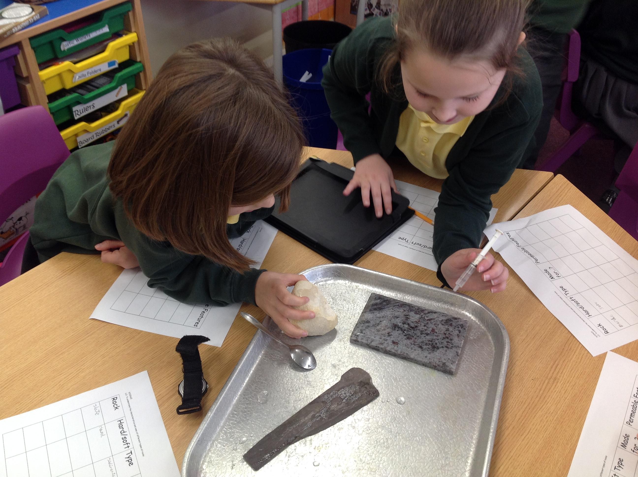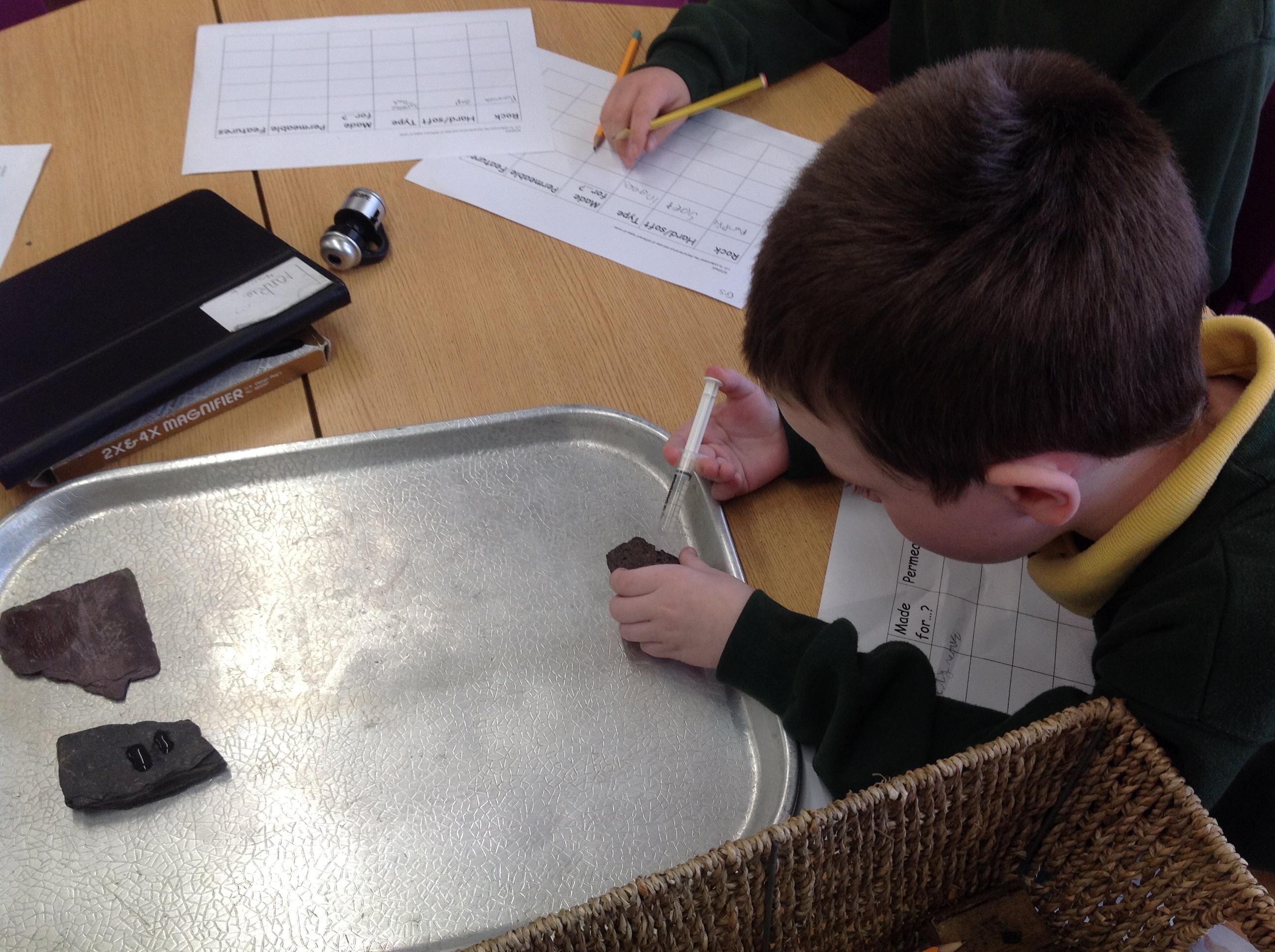 We investigated different types of rocks today. We tested how hard or soft they were using a scrape test and tested their permeability using water and pipettes. We also started to understand the terminology of igneous, sedimentary and metamorphic!