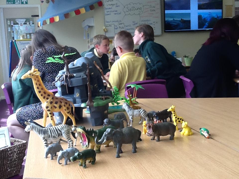 We have been exploring the settings of adventure stories! We thought about the story mountain and how the settings develop as the story goes on. We thought about the atmosphere that different settings would give to a storyline. We then designed our own! Some of us used the small world play to create a storyline for Simba's new adventure!