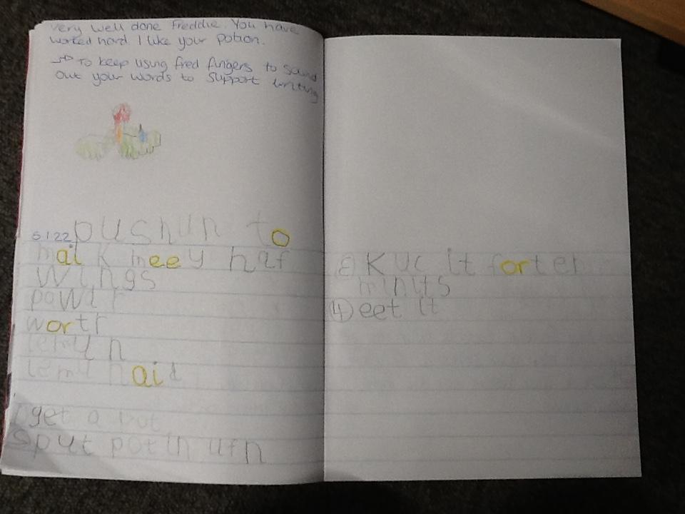 Today the children were looking at the story Alice and Wonderland where she drinks a potion and it makes her small. In English today the children had to think about a potion that they would make to be what ever they wanted to be. The children had some great ideas. Some wanted to be bigger, some invisible and some wanted to make them fly. The children had to write a list of ingredients and instructions on how to make their potion. They really were creative.