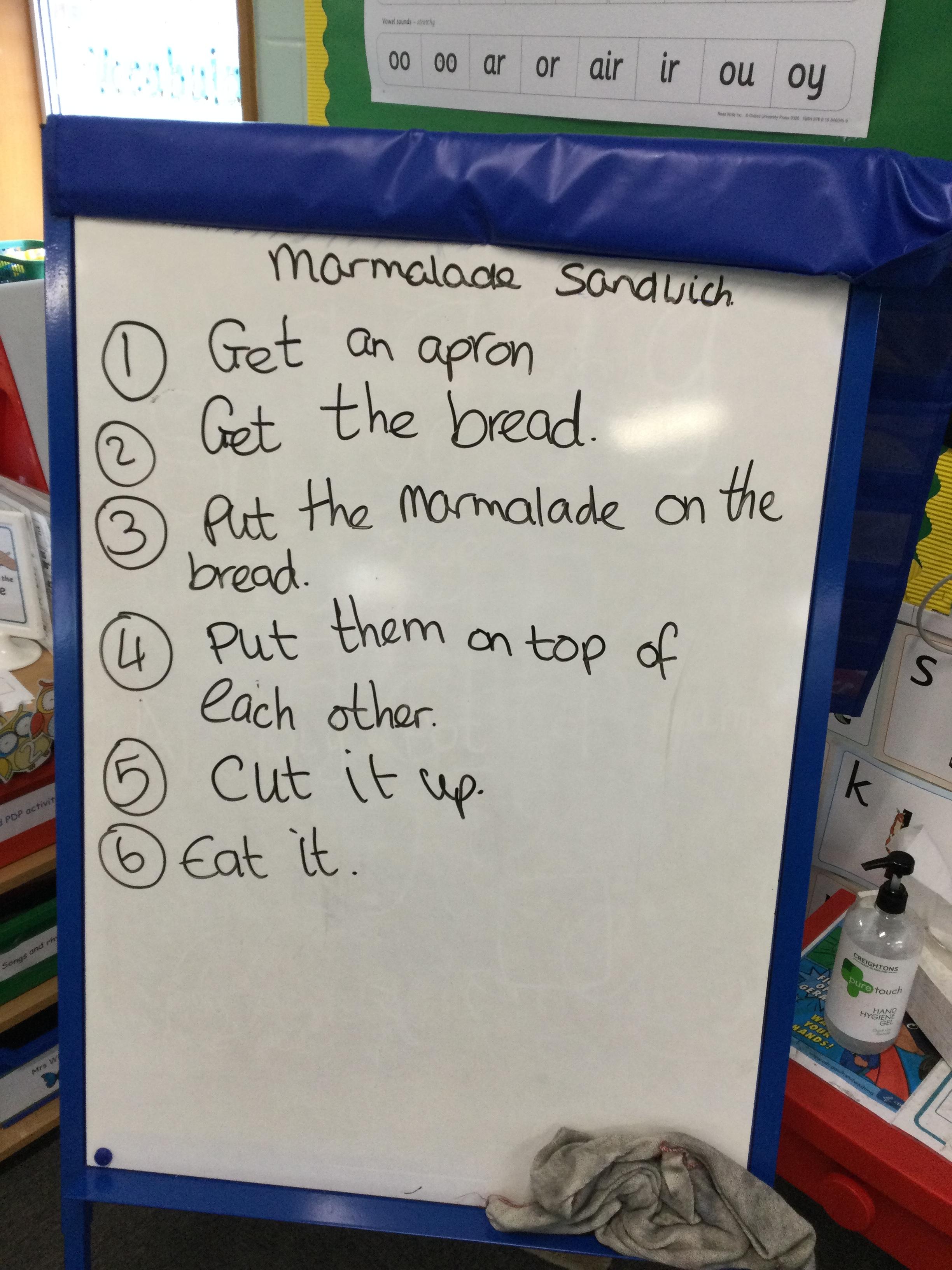 This week in English the children are looking at writing instructions for making Paddington favourite food, marmalade sandwich! Some children used photographs to help order how to make a marmalade sandwich.